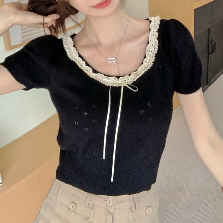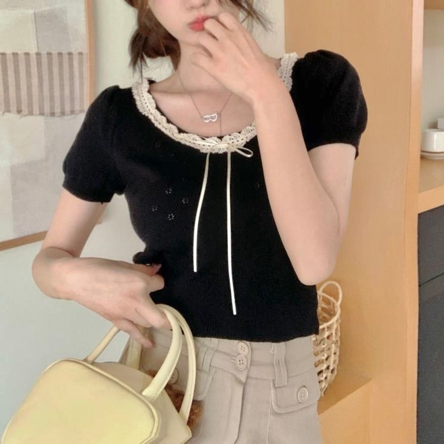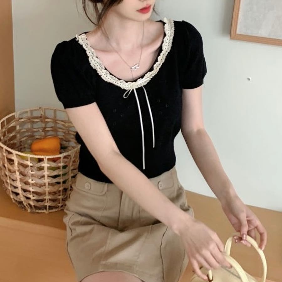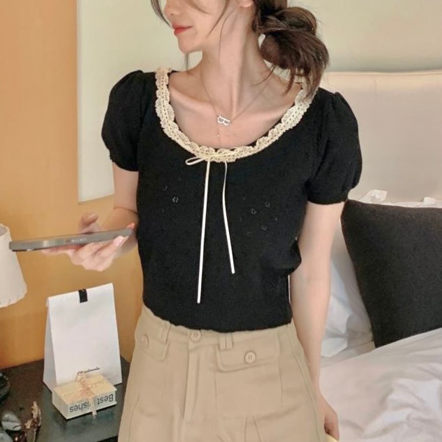 【春夏新作】レースリボン付きパフスリーブ半袖ニット