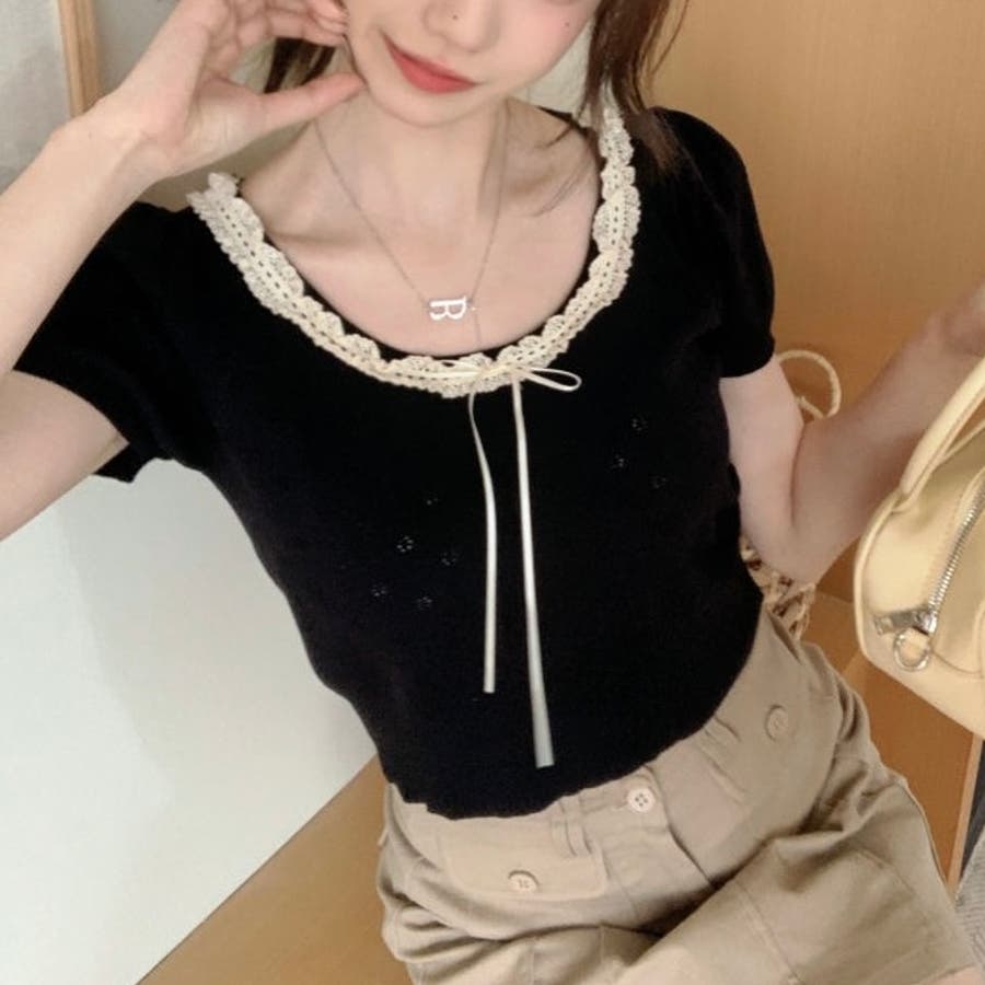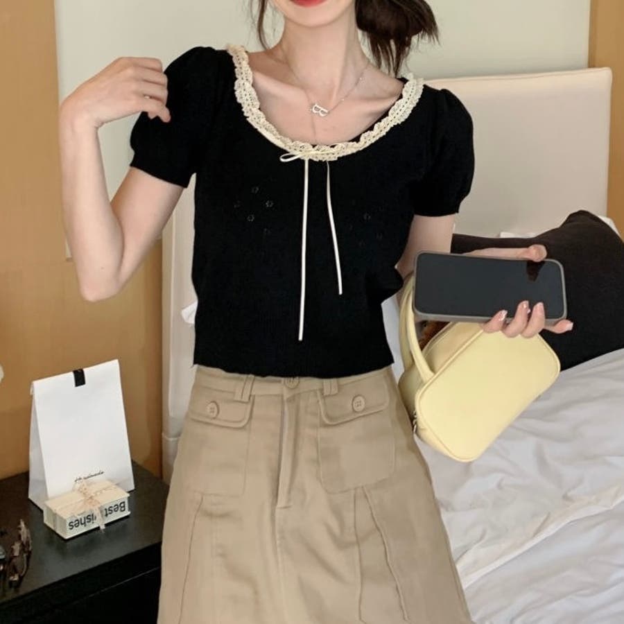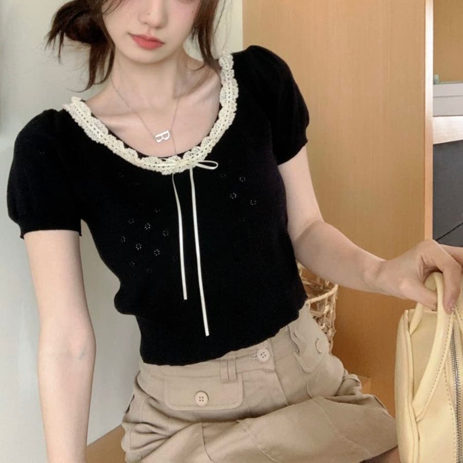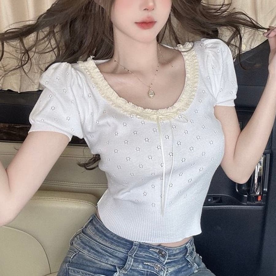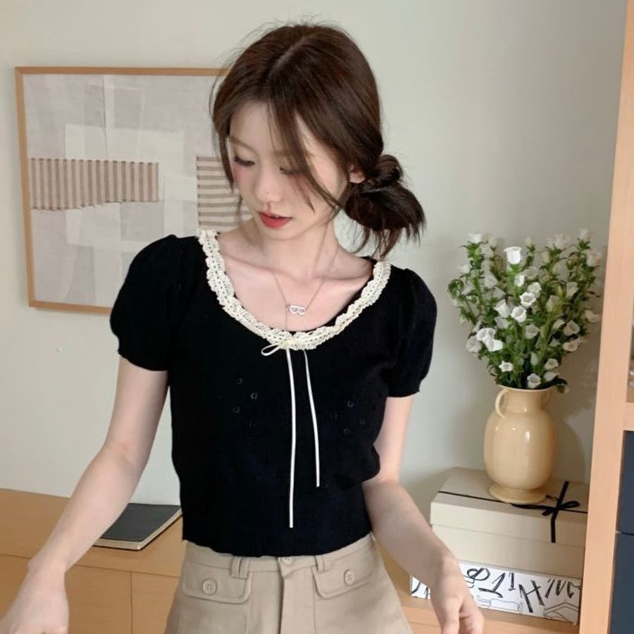 【春夏新作】レースリボン付きパフスリーブ半袖ニット