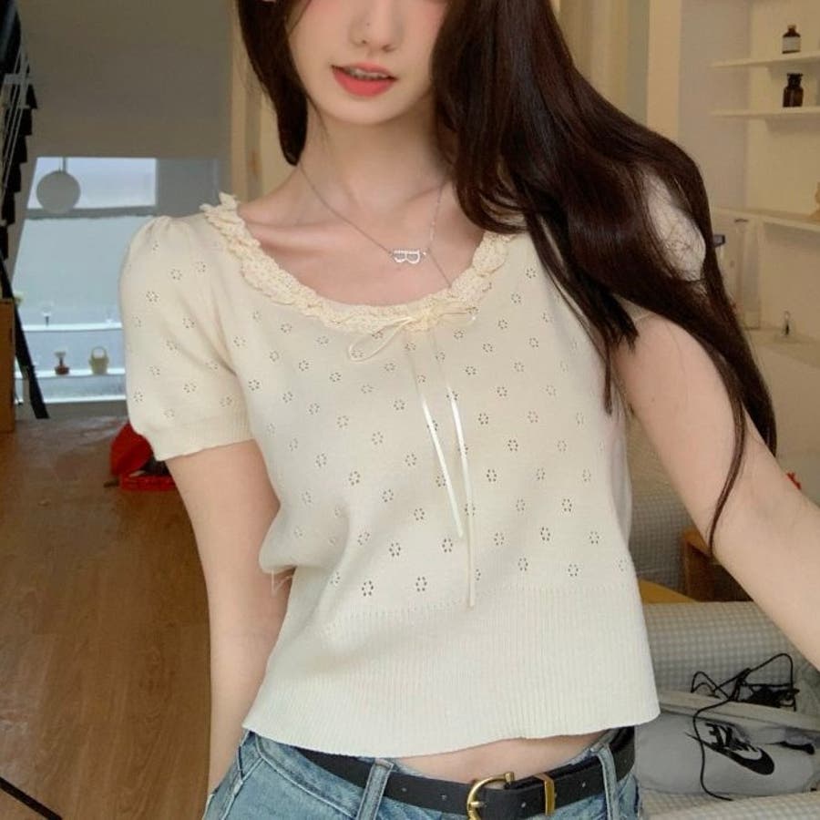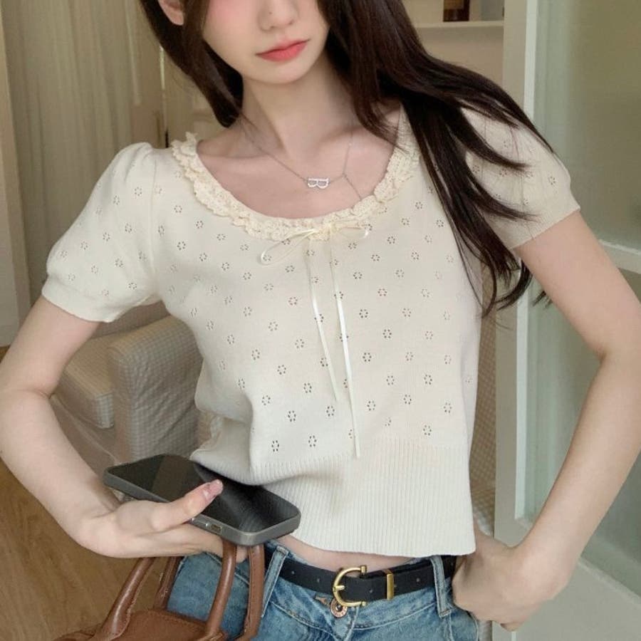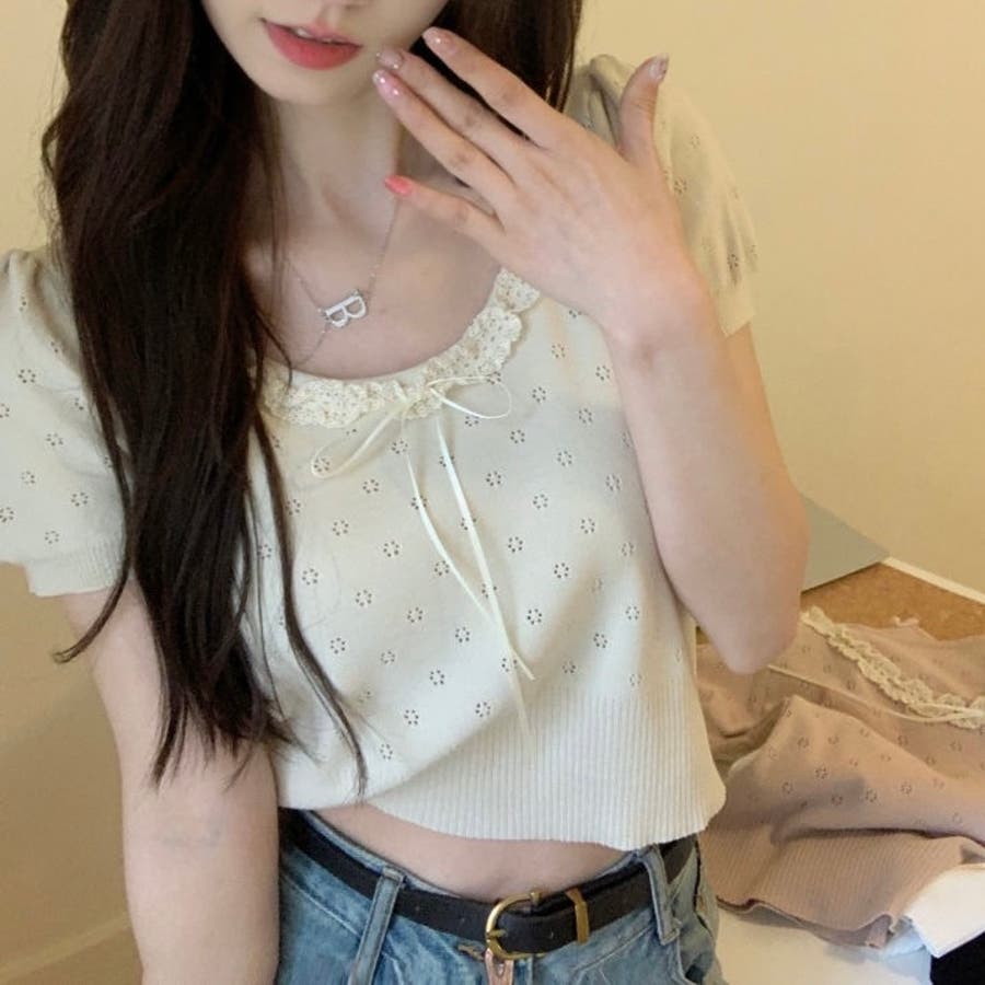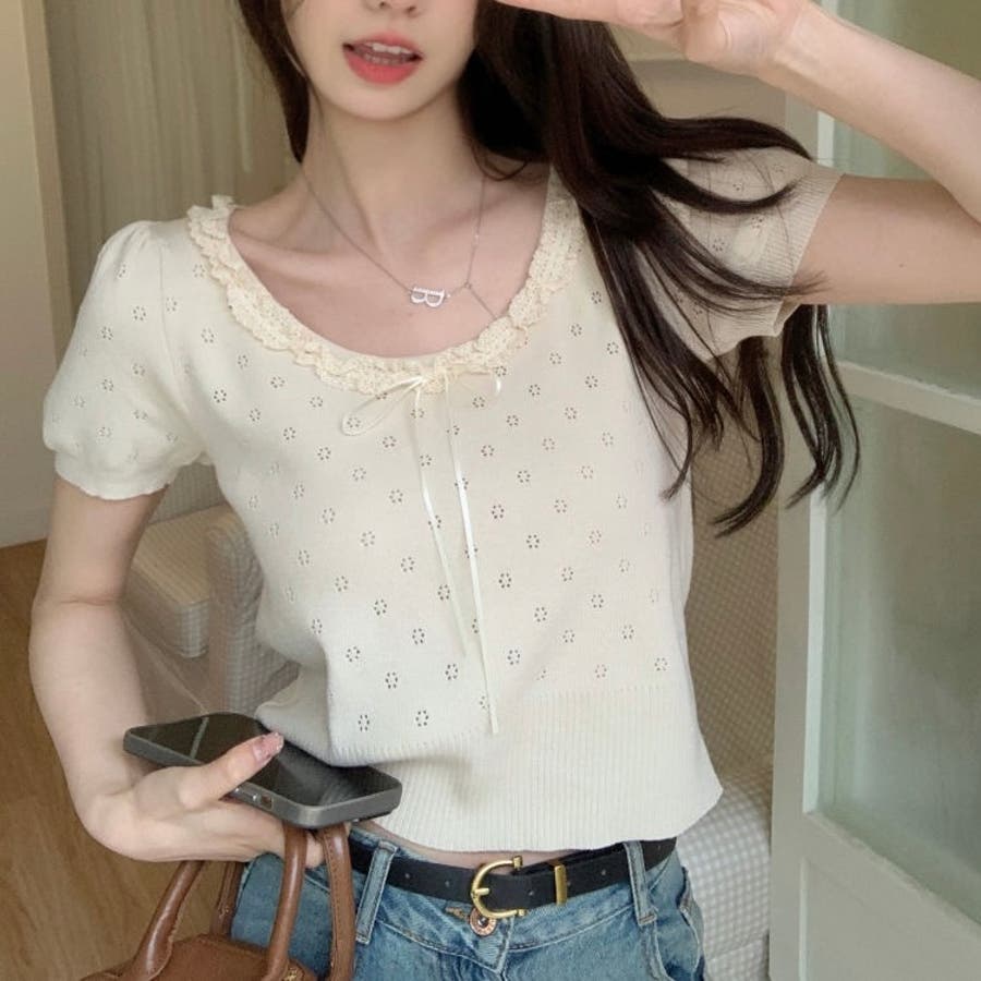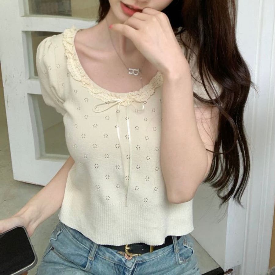 大人 カジュアル きれいめ 韓国ファッション 韓国コーデ Y2K オフィスカジュアル 春服 夏服 秋服 半袖 サマーニット 透かし編み シアーニット トップス フェミニン ガーリー 10代 20代 30代 40代 春 夏 秋