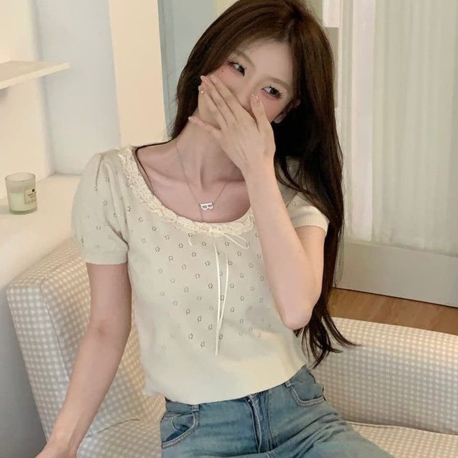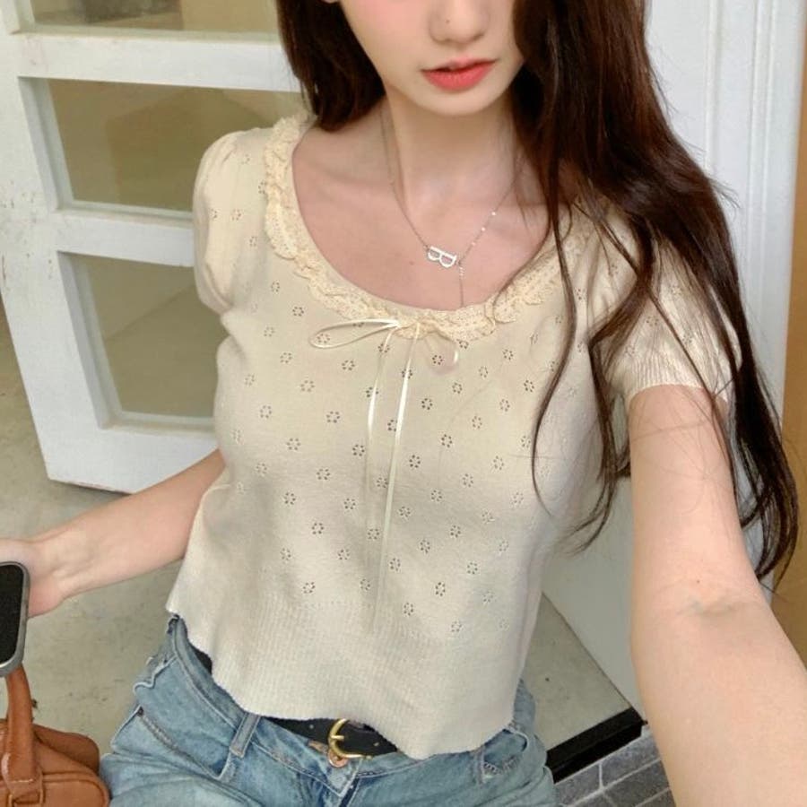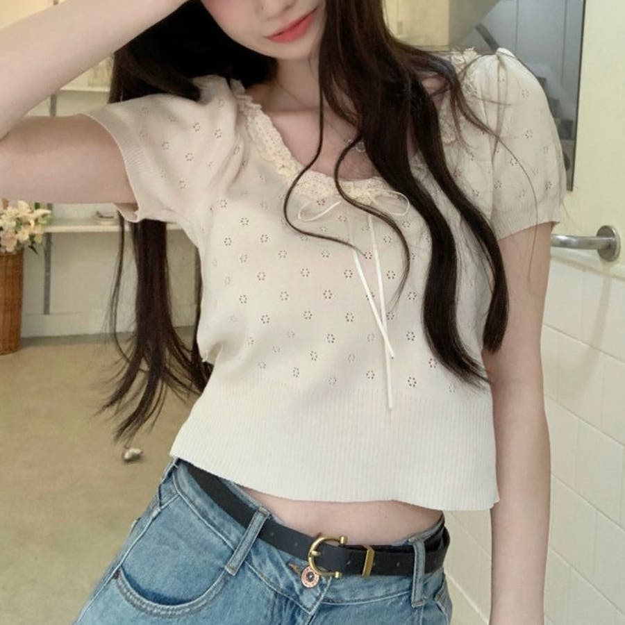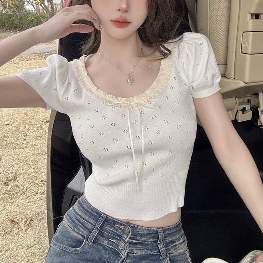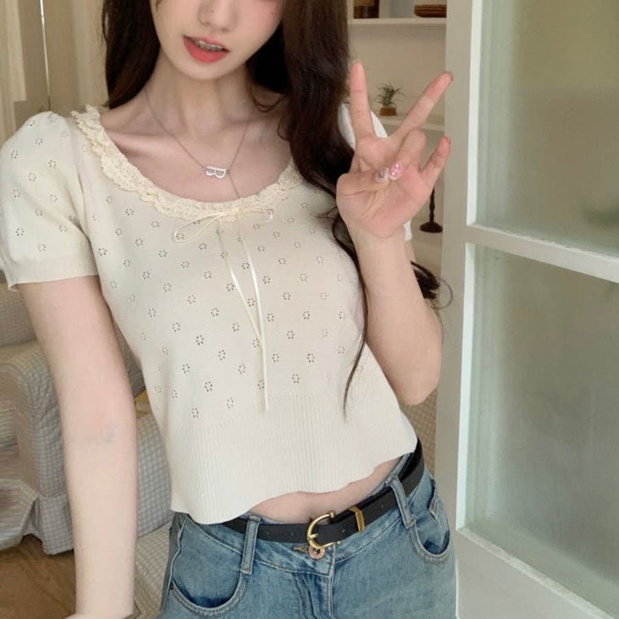 大人 カジュアル きれいめ 韓国ファッション 韓国コーデ Y2K オフィスカジュアル 春服 夏服 秋服 半袖 サマーニット 透かし編み シアーニット トップス フェミニン ガーリー 10代 20代 30代 40代 春 夏 秋
