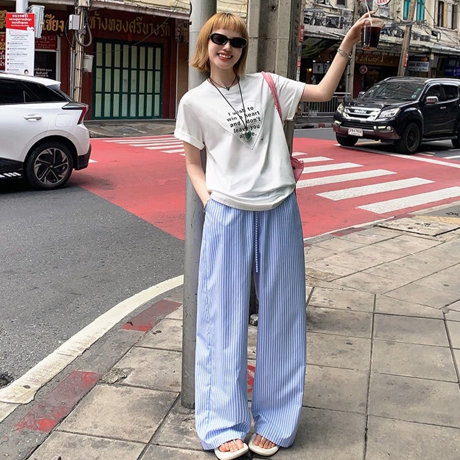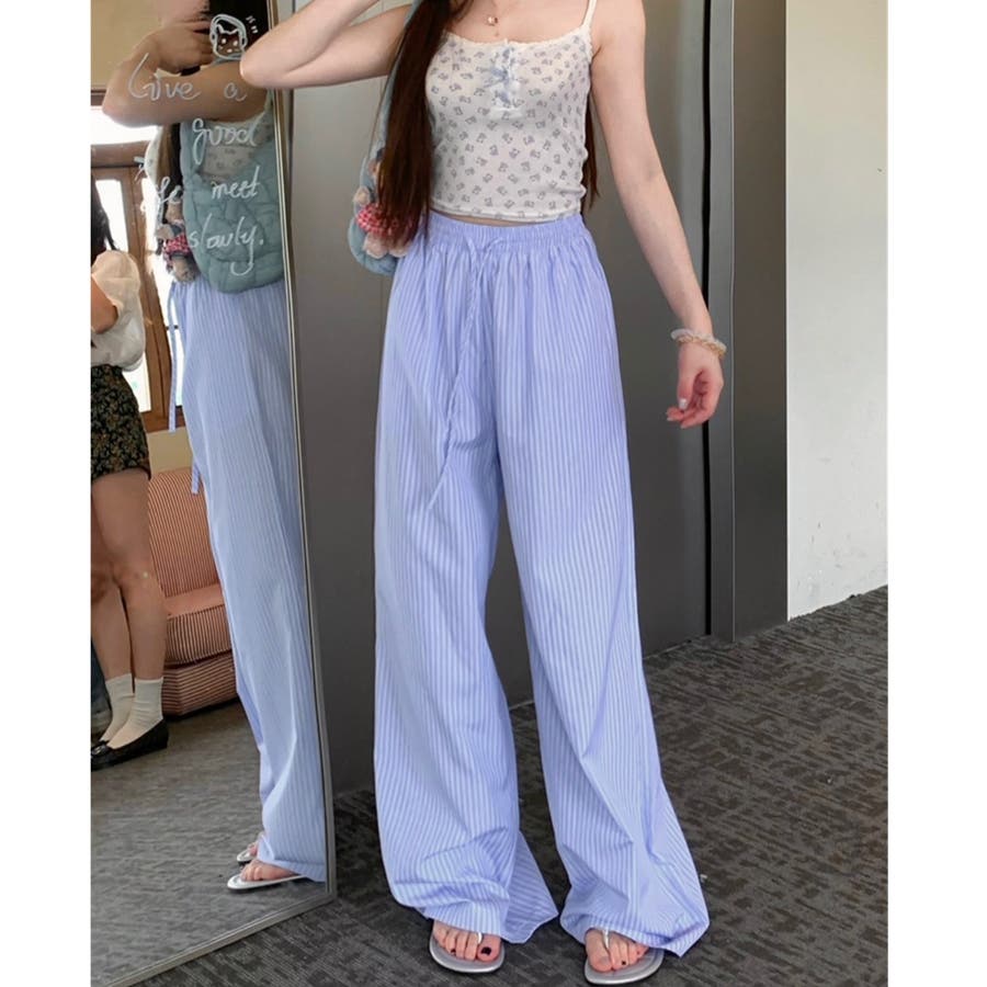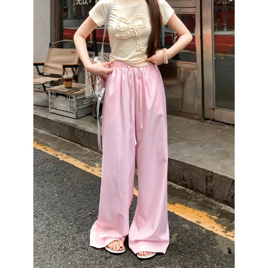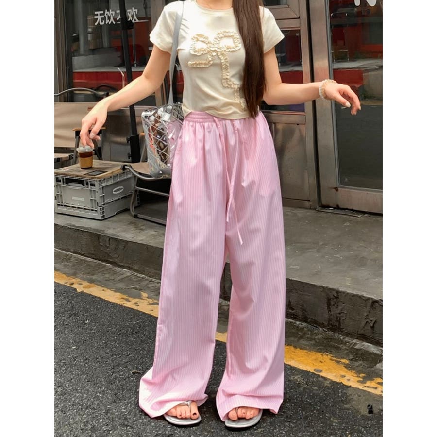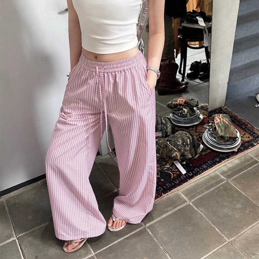 【春夏新作】ウエストゴムストライプワイドイージーパンツ