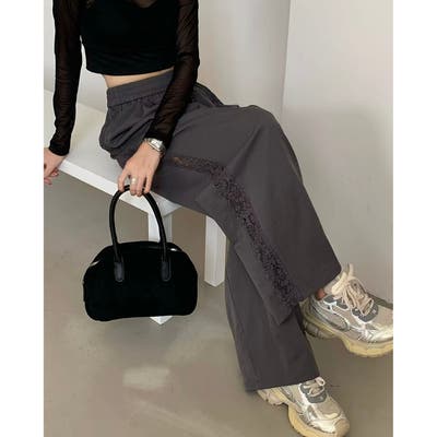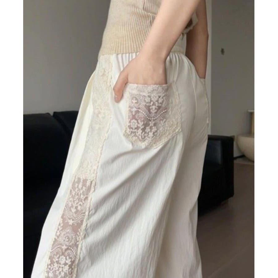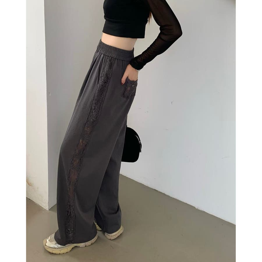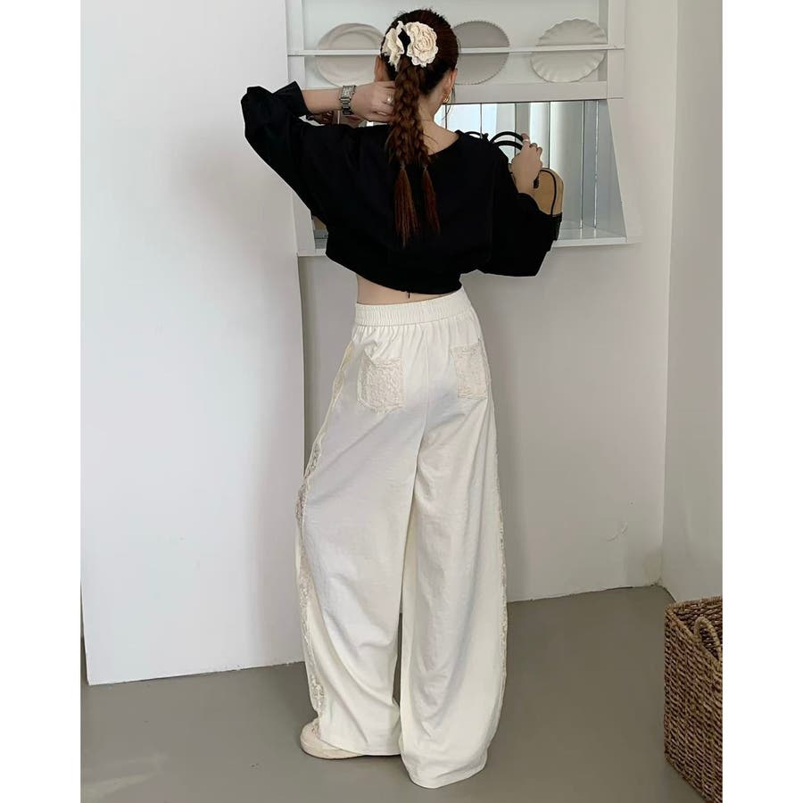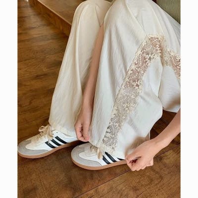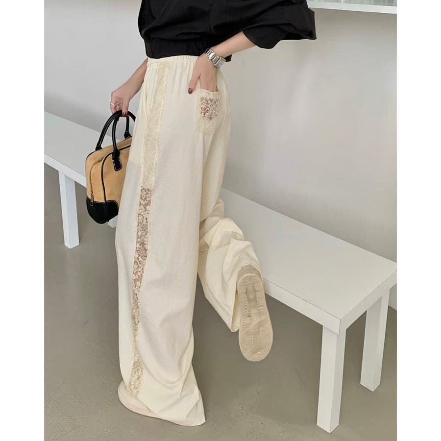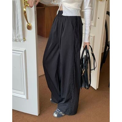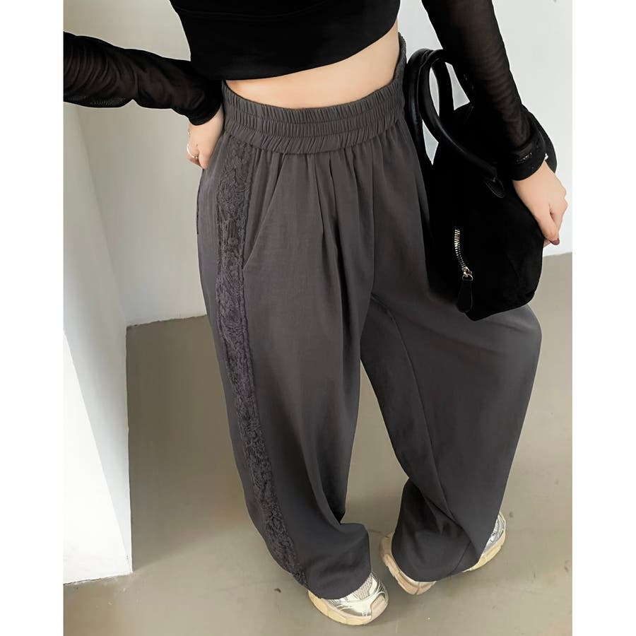 繊細なレースがサイドラインとポケットにあしらわれた、女性らしさとリラックス感を兼ね備えたワイドパンツ。