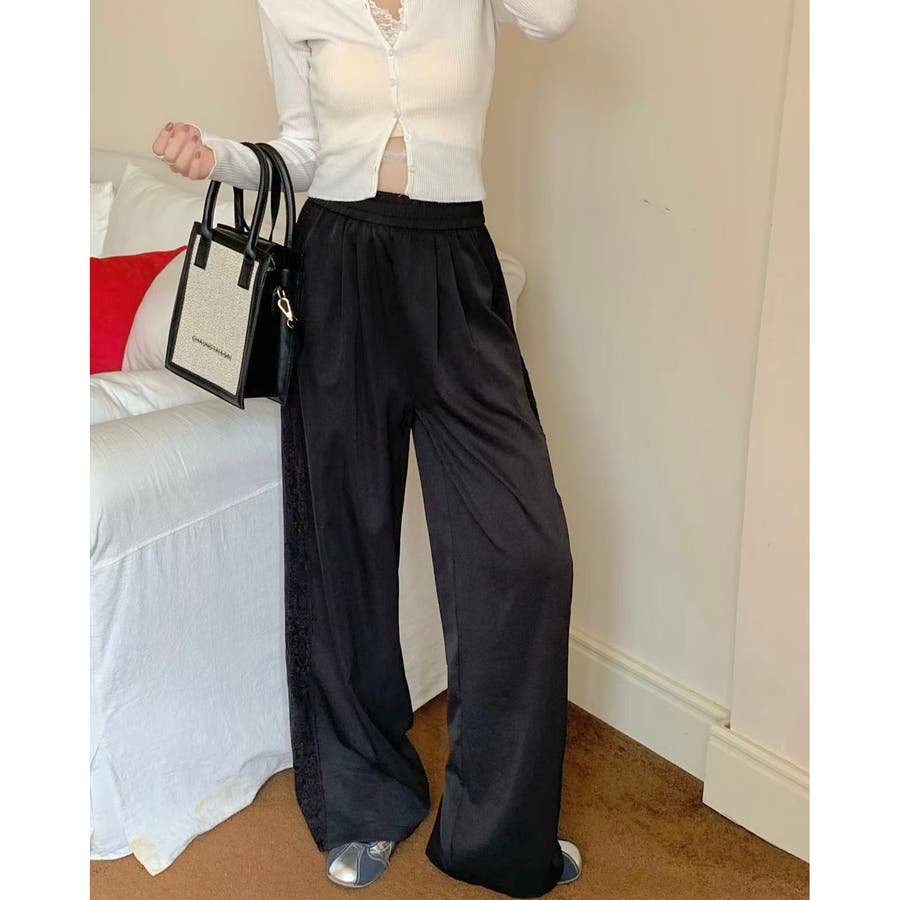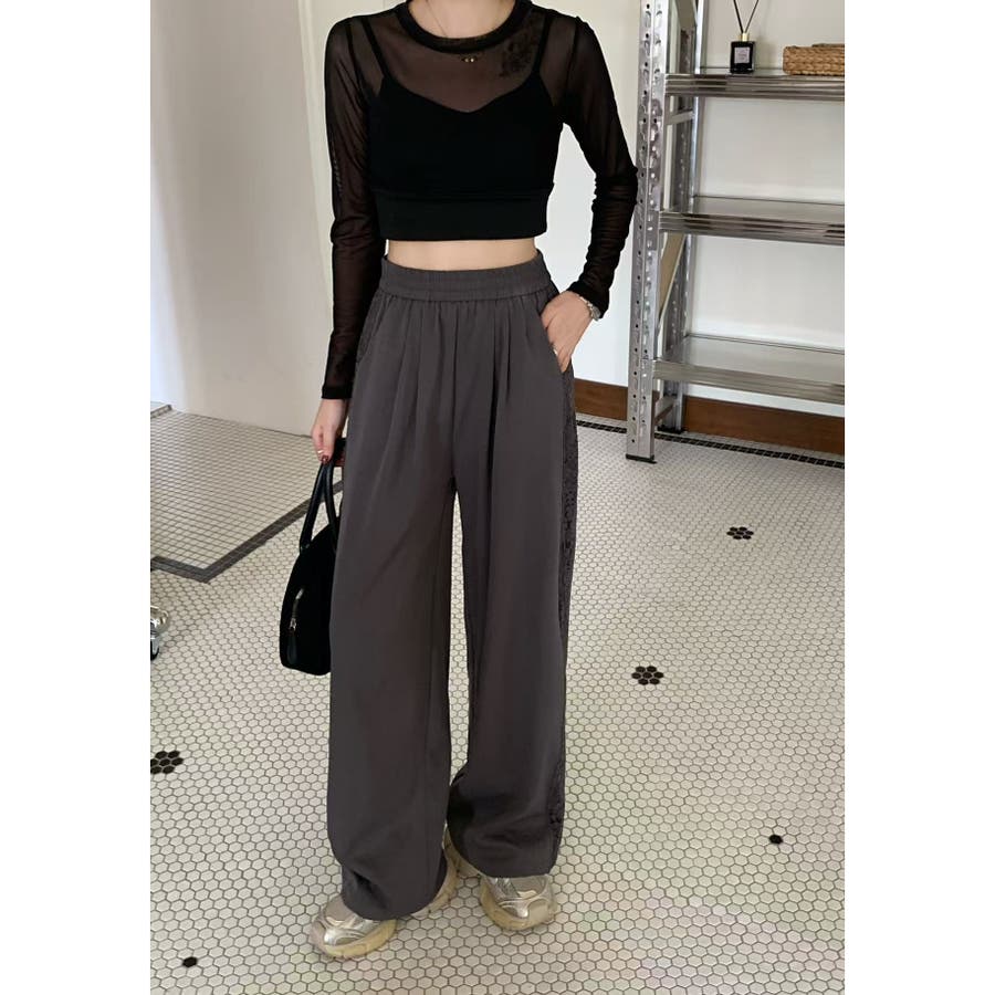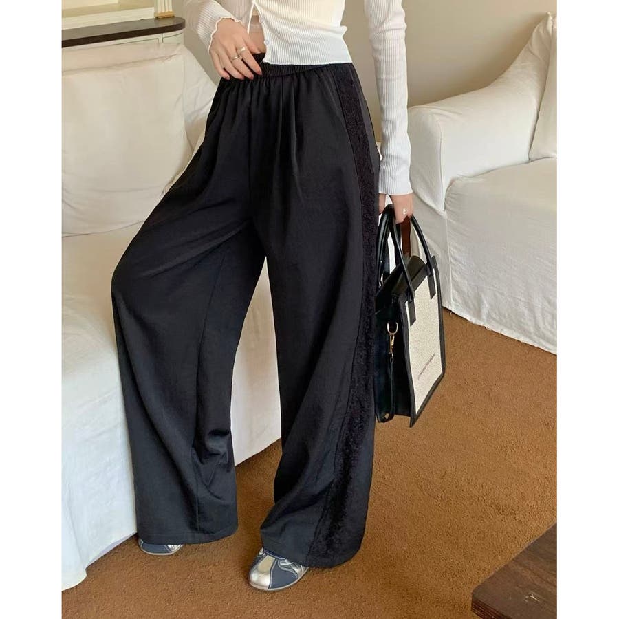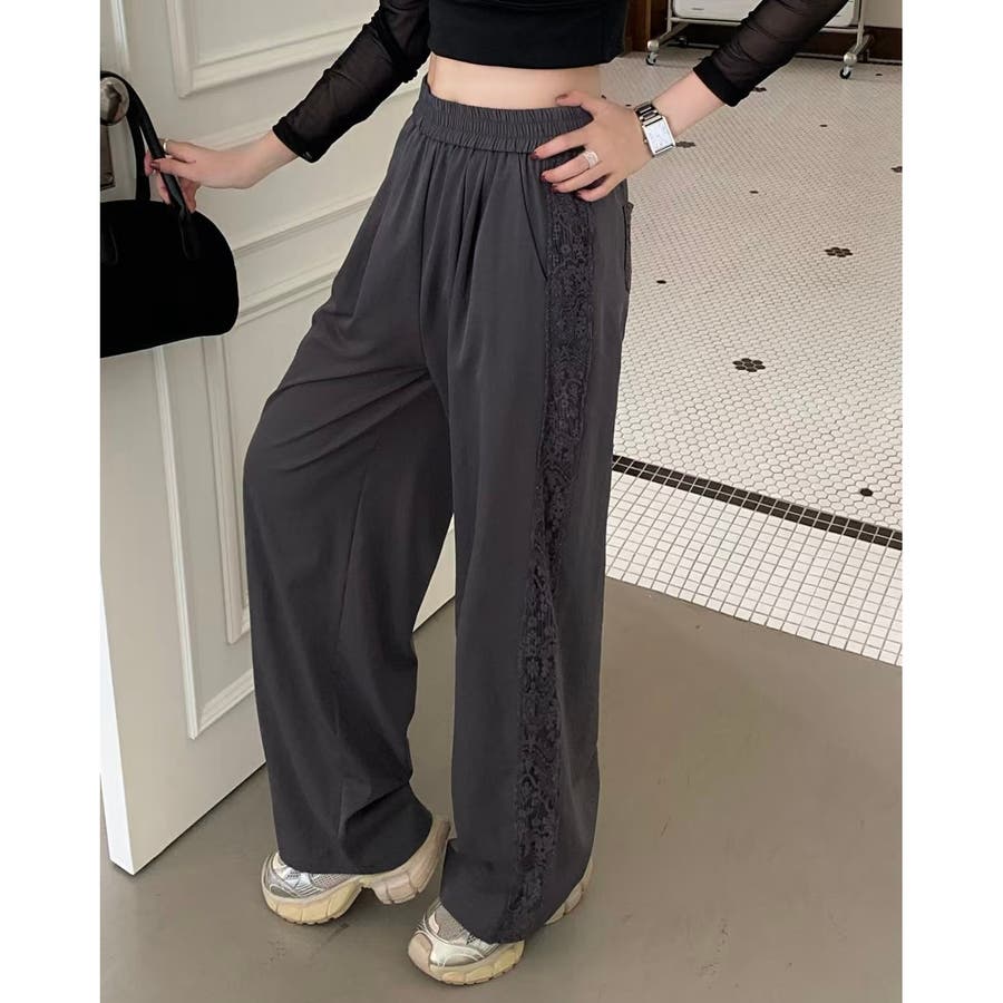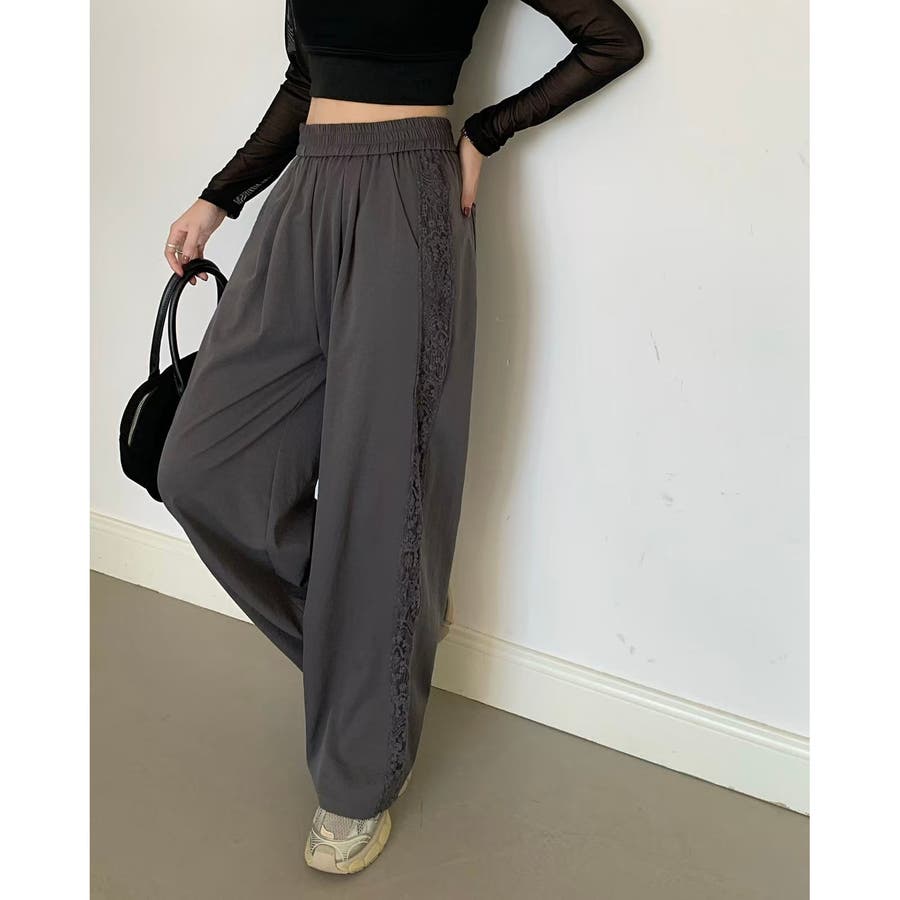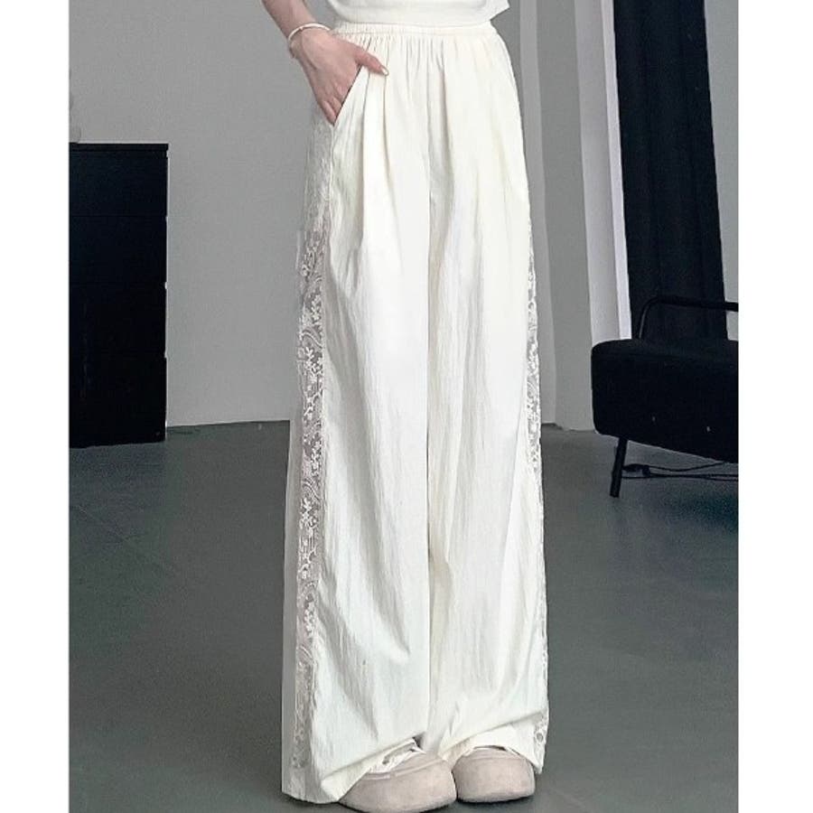 繊細なレースがサイドラインとポケットにあしらわれた、女性らしさとリラックス感を兼ね備えたワイドパンツ。