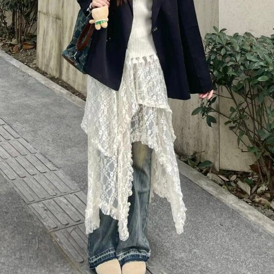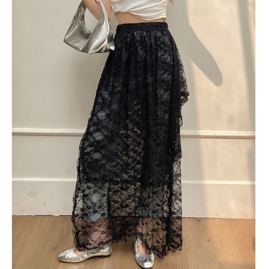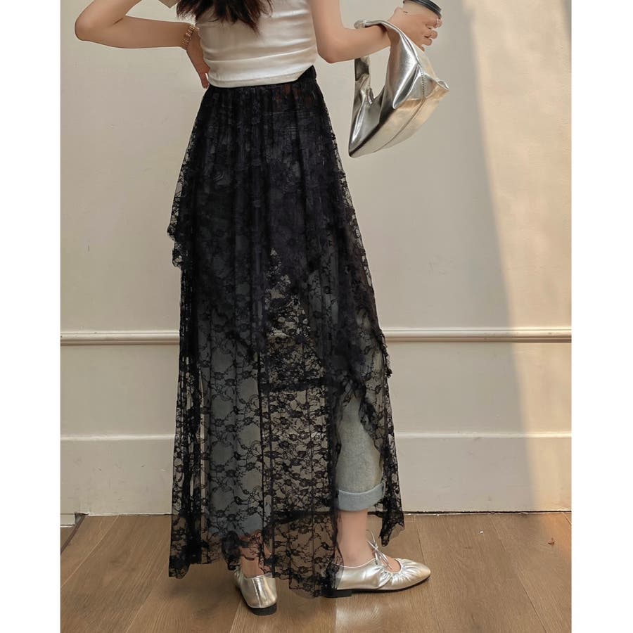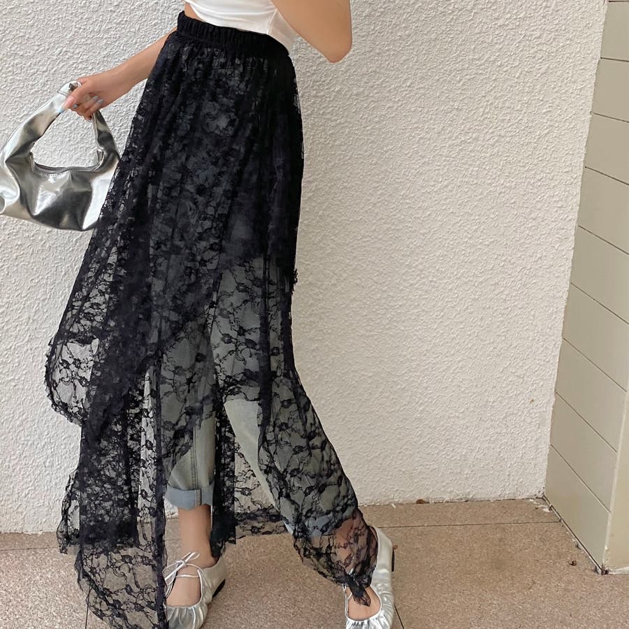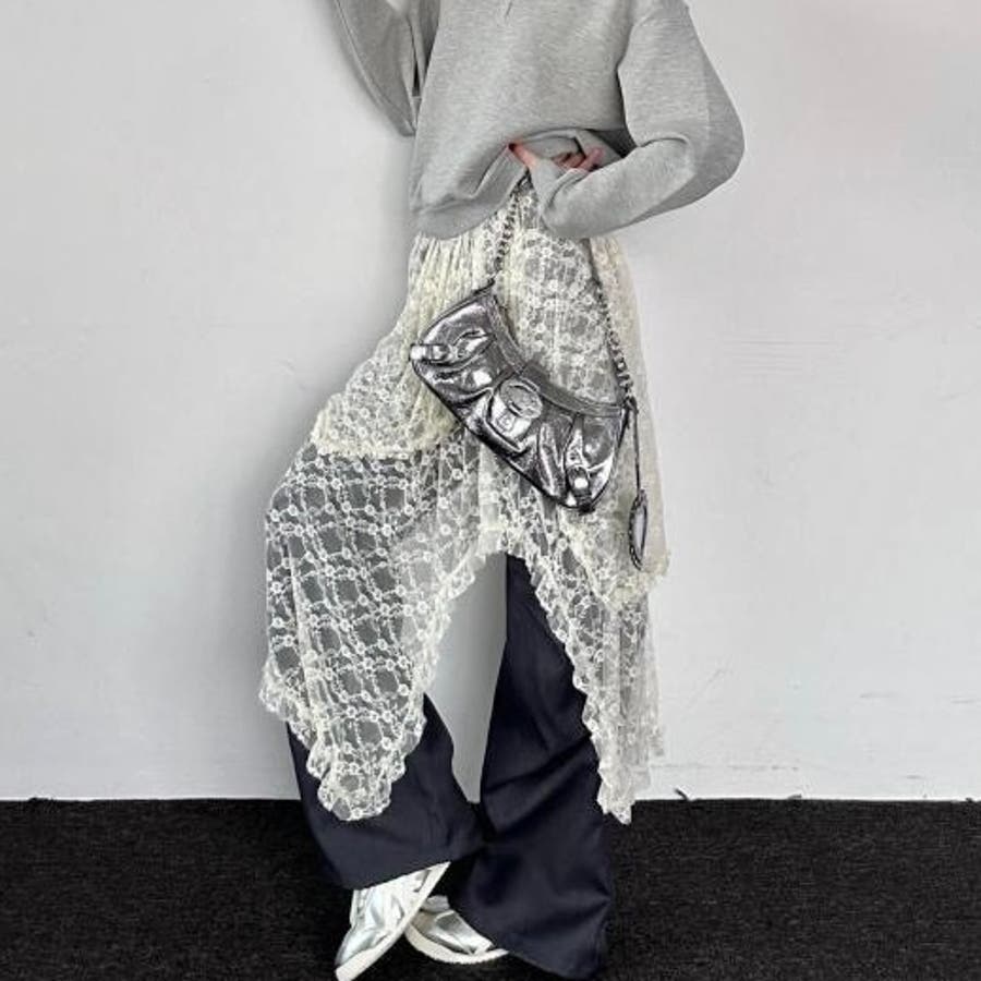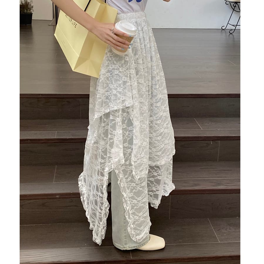 軽やかなレース素材が優雅さとフェミニンさを引き立て、アシンメトリーなヘムラインがコーディネートに動きをプラスします。