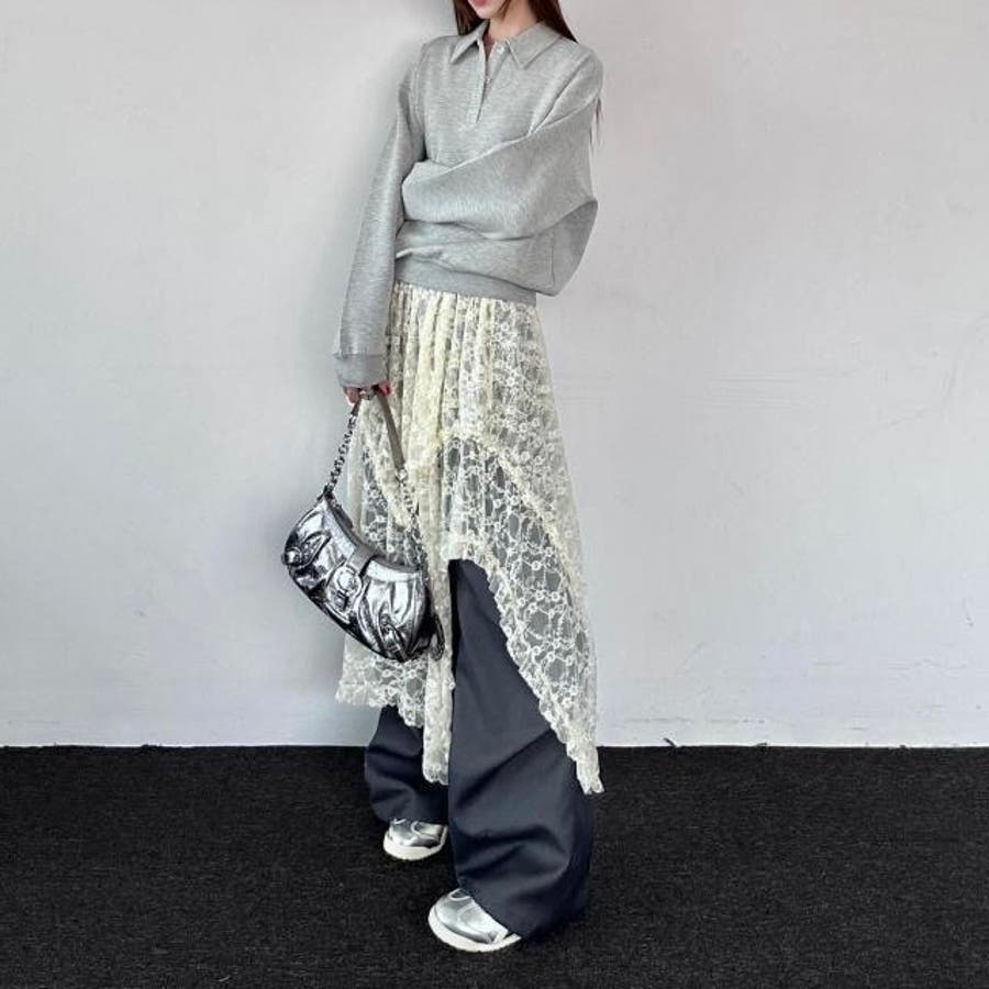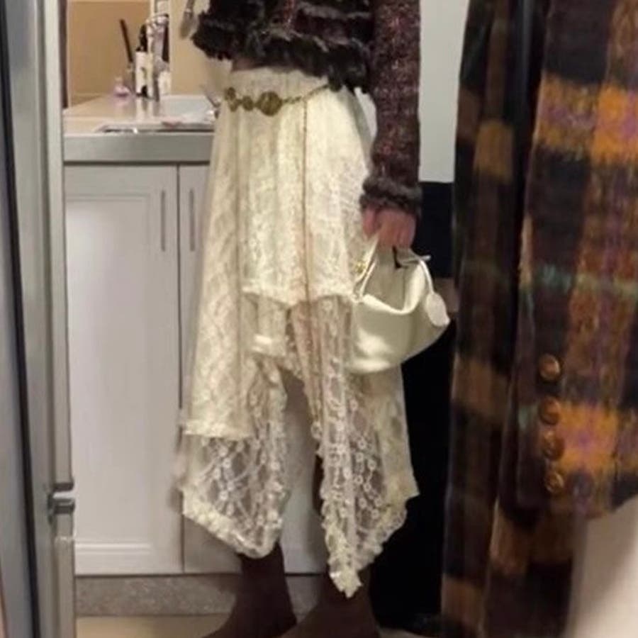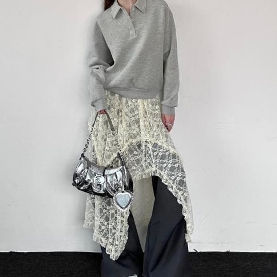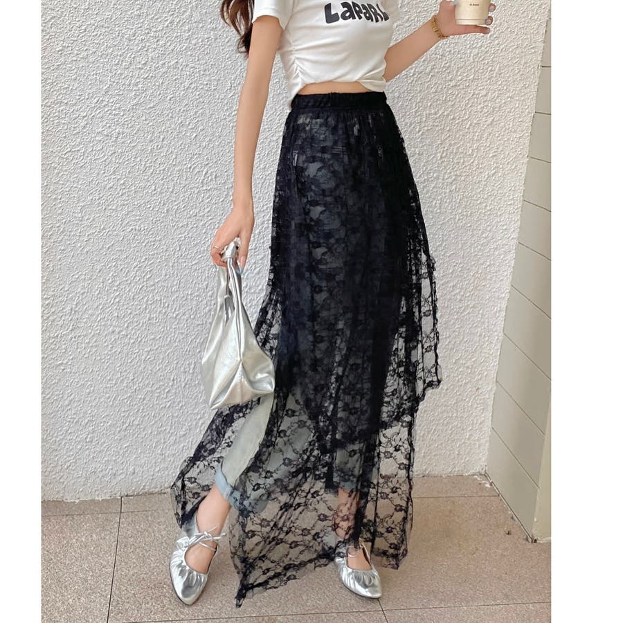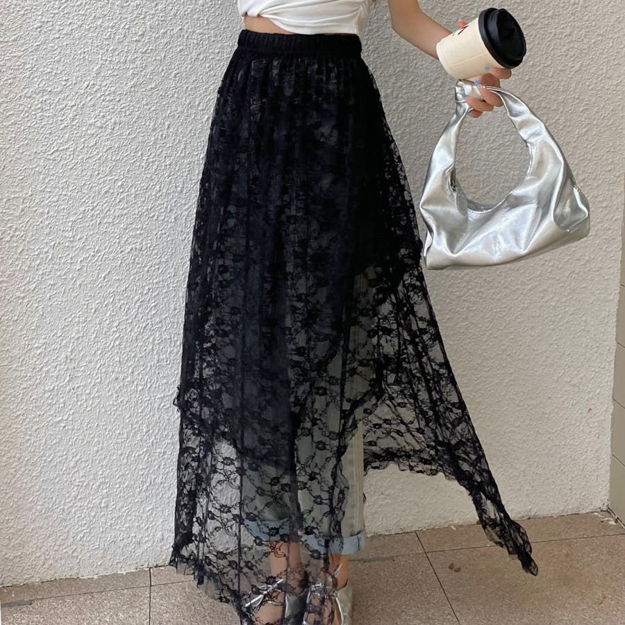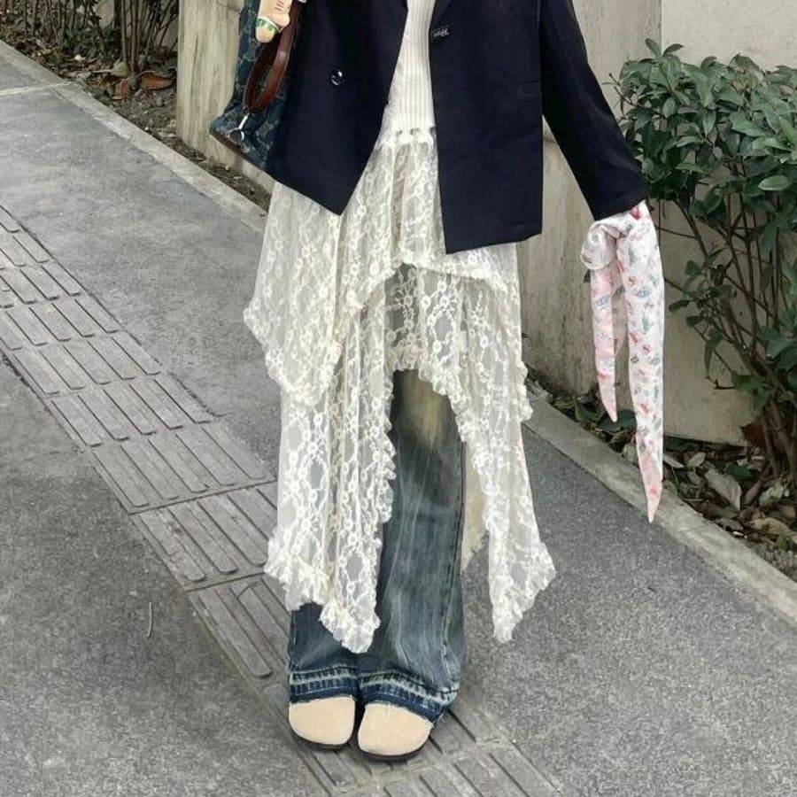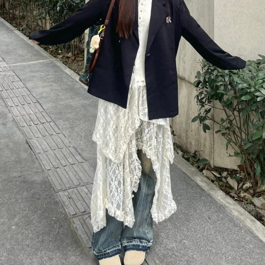 軽やかなレース素材が優雅さとフェミニンさを引き立て、アシンメトリーなヘムラインがコーディネートに動きをプラスします。