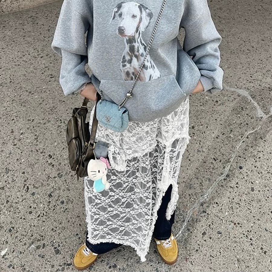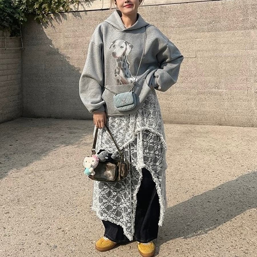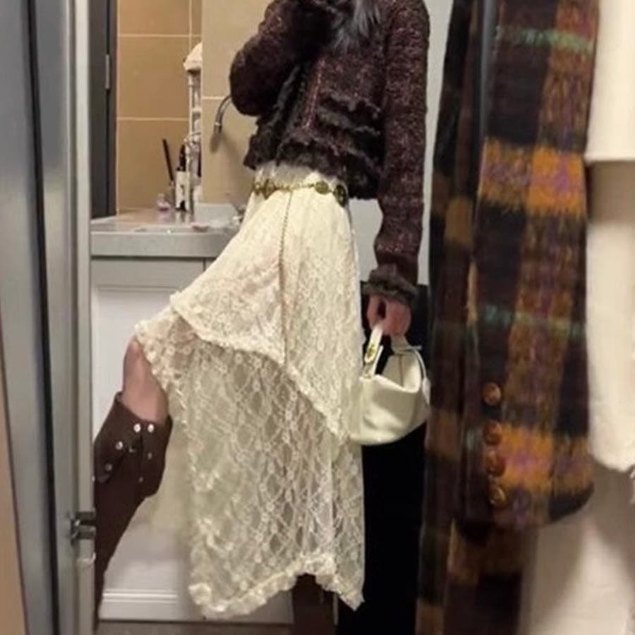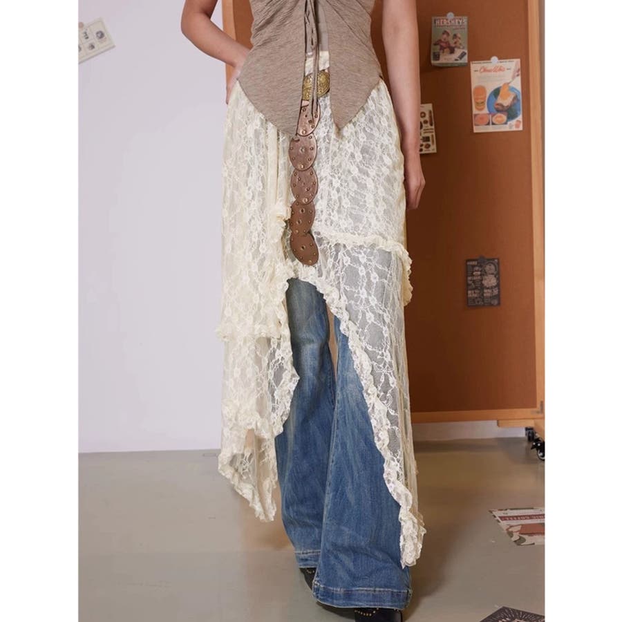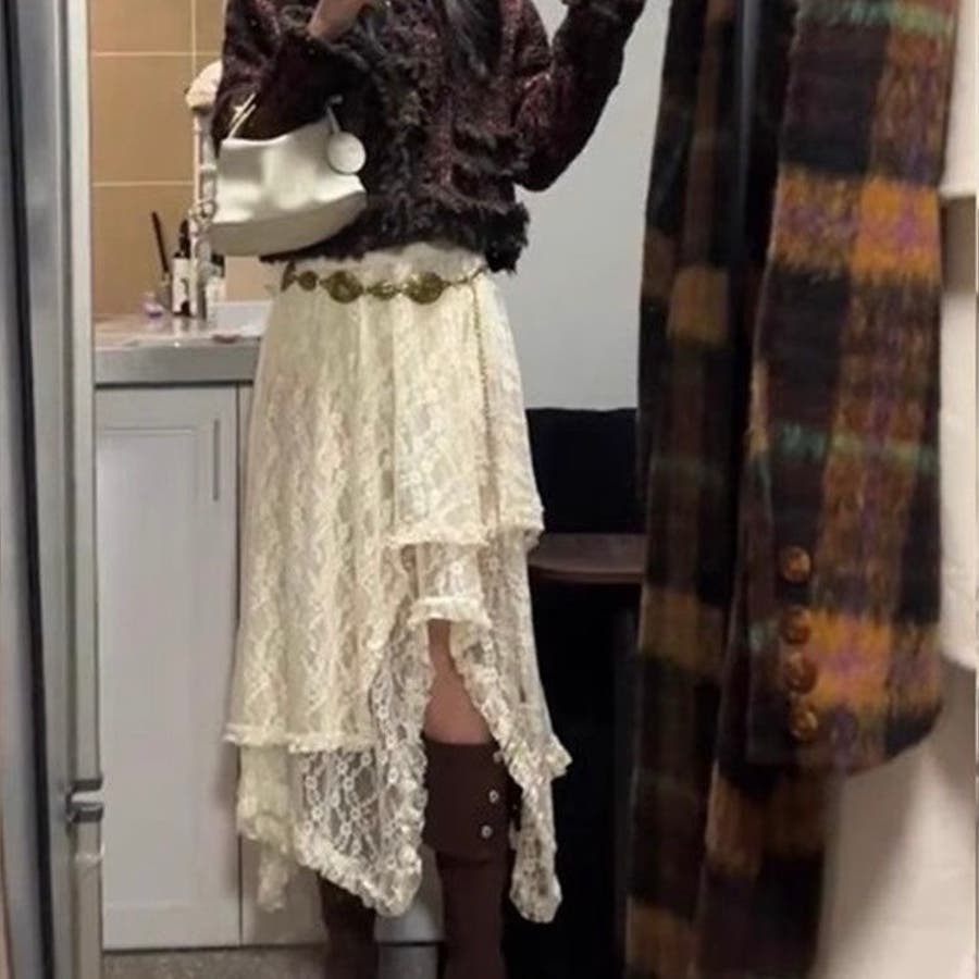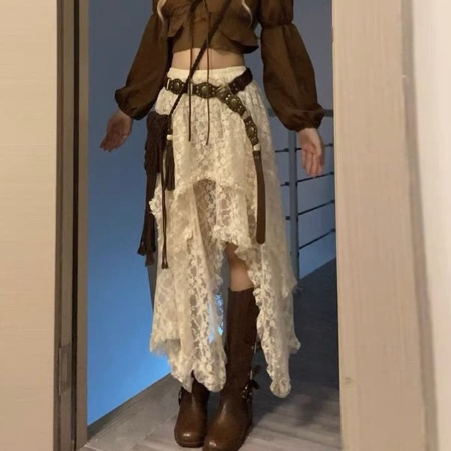 軽やかなレース素材が優雅さとフェミニンさを引き立て、アシンメトリーなヘムラインがコーディネートに動きをプラスします。