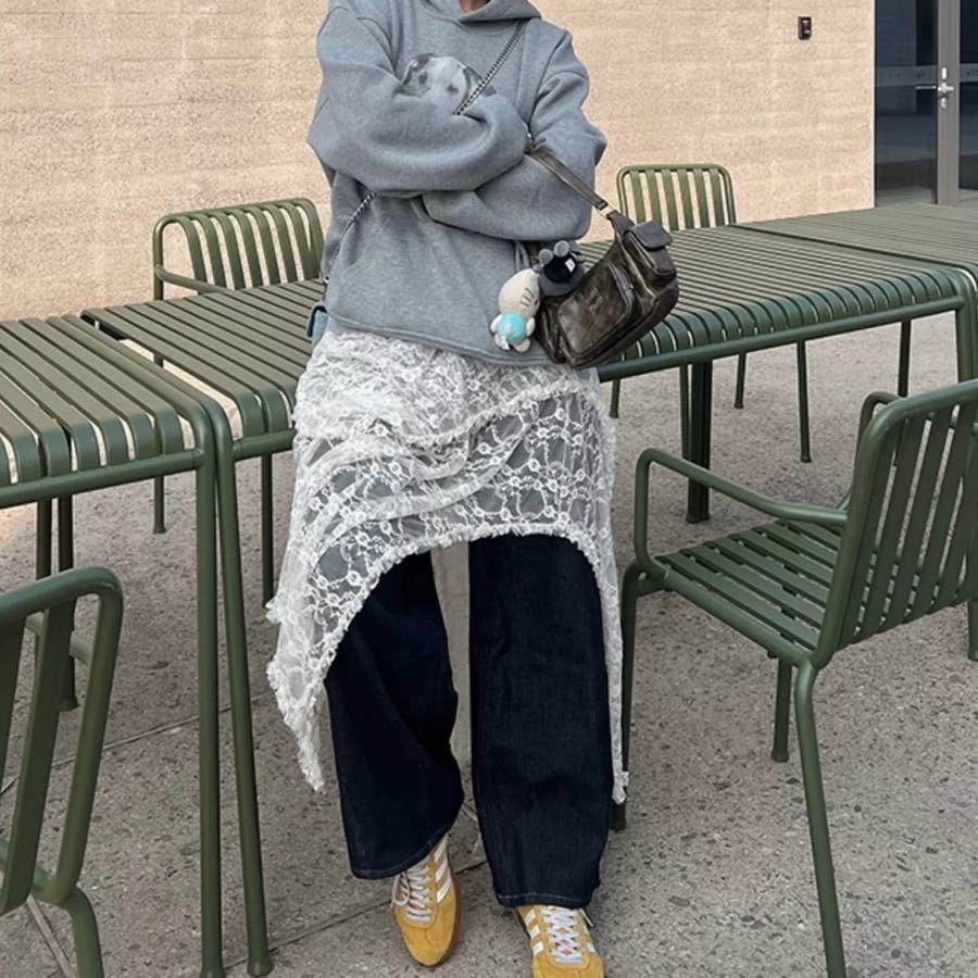 レーススカートとデニムパンツのレイヤードで、カジュアルさとフェミニンさを融合したスタイルに。足元にはスニーカーやショートブーツを合わせると、カジュアルなトレンド感をプラスできます。
