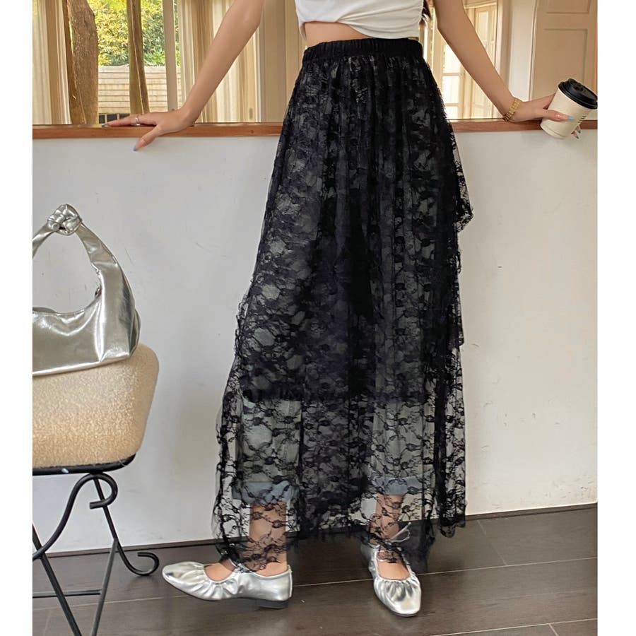 レイヤードデザインが目を惹くレーススカートは、スタイリッシュで個性的なスタイリングを叶える一着。