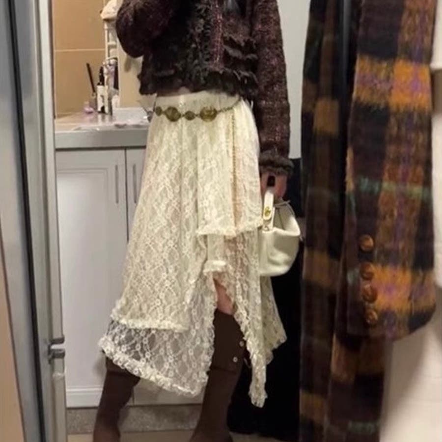 レーススカートにロングレザーブーツを合わせることで、エレガントなスタイルが完成します。上半身はコンパクトなトップスでまとめると、バランスの良いシルエットを作り出します。