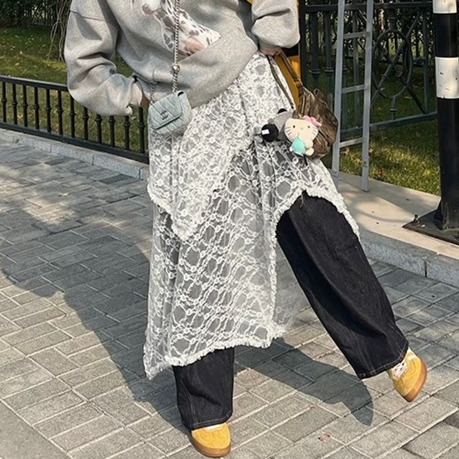 大人 カジュアル きれいめ 韓国ファッション 韓国コーデ Y2K オフィスカジュアル シアースカート レイヤースカート 透け感 シースルー ランダムヘム アシンメトリー ウエストゴム 重ね着 春服 冬服 秋服 10代 20代 30代 40代 春 冬 秋