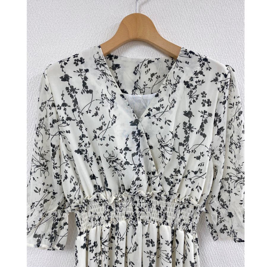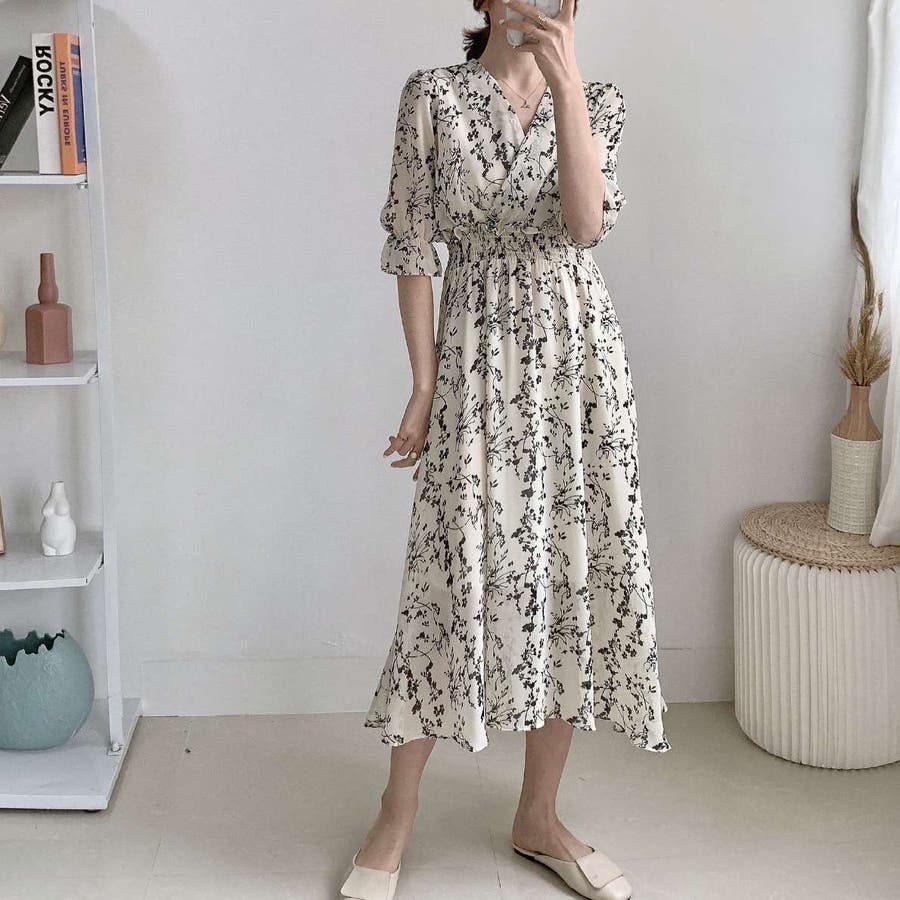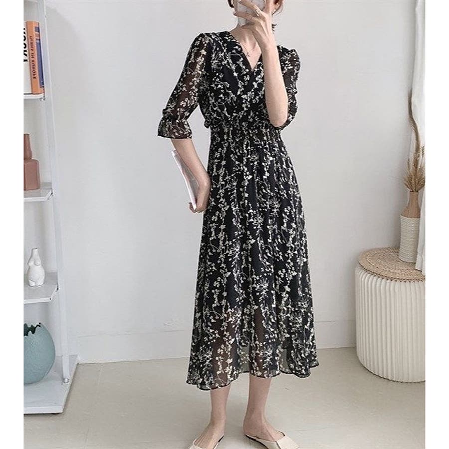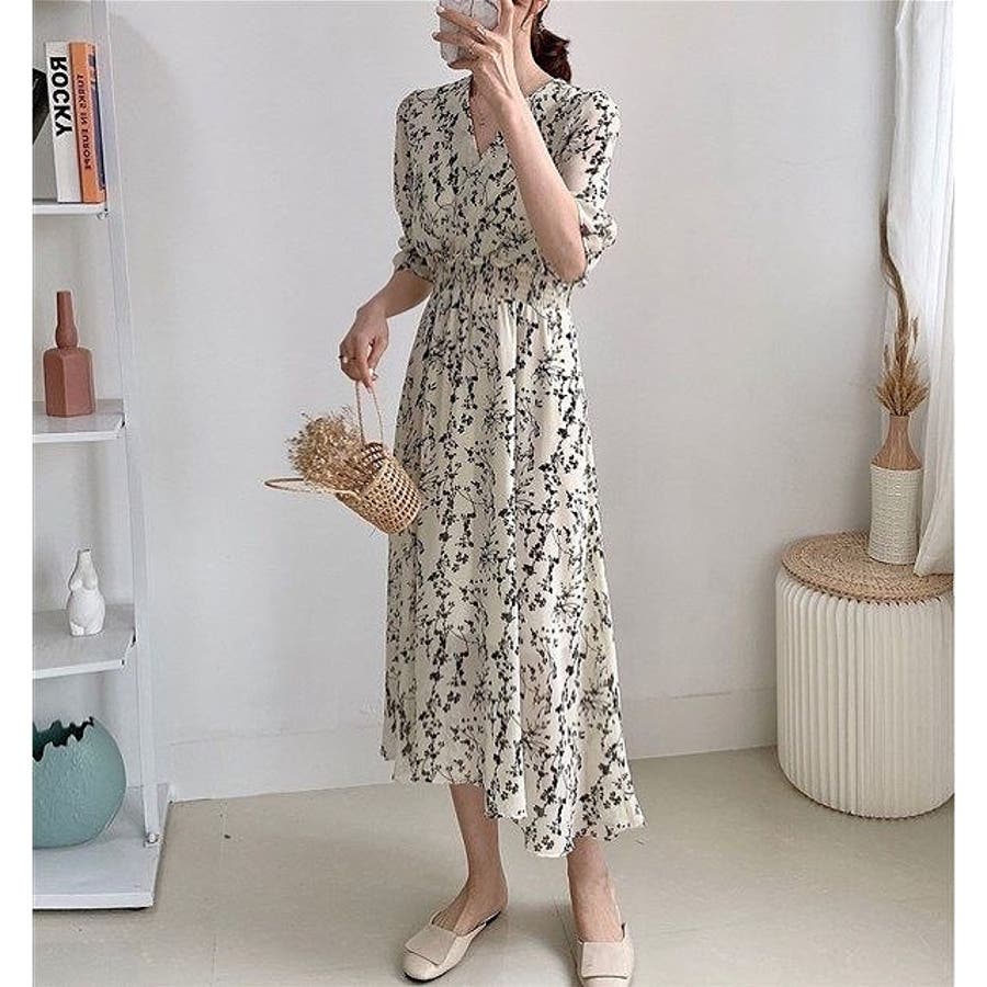 ロングワンピース ロング丈 ひざ下丈 ミモレ丈 大人 カジュアル 韓国ファッション きれいめ オフィスカジュアル 花柄 小花柄 フラワープリント 半袖 シンプル フェミニン 上品 Vネック ふんわり袖 ギャザー 春 夏 秋