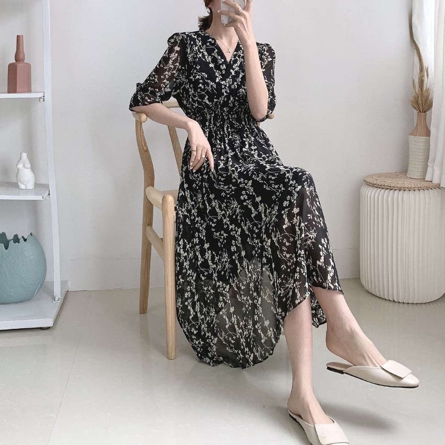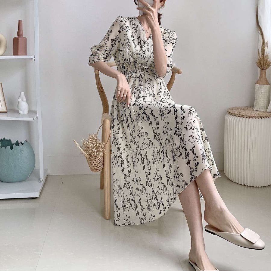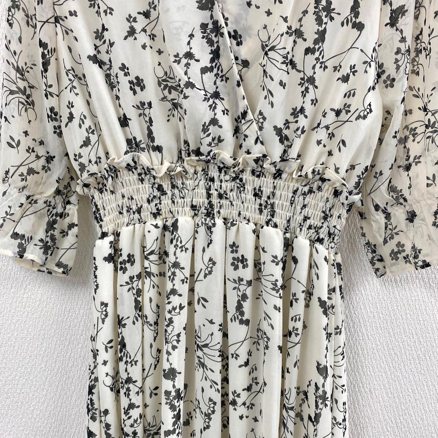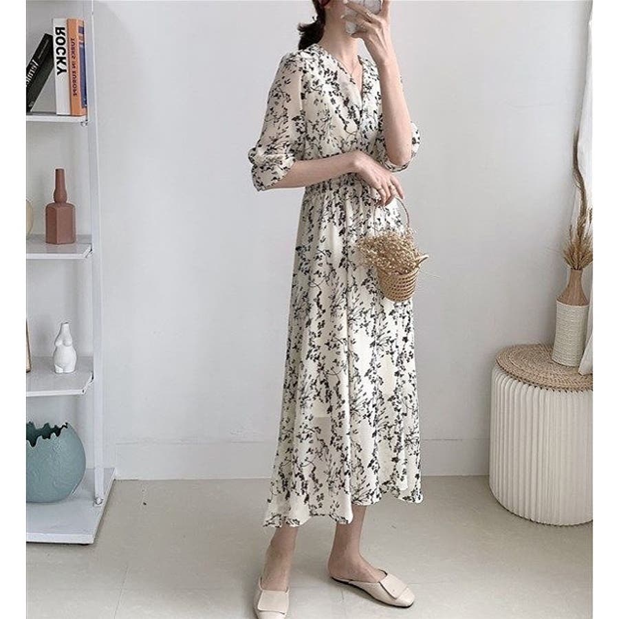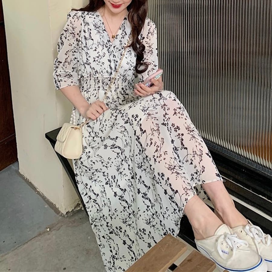 ロングワンピース ロング丈 ひざ下丈 ミモレ丈 大人 カジュアル 韓国ファッション きれいめ オフィスカジュアル 花柄 小花柄 フラワープリント 半袖 シンプル フェミニン 上品 Vネック ふんわり袖 ギャザー 春 夏 秋