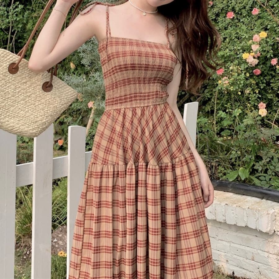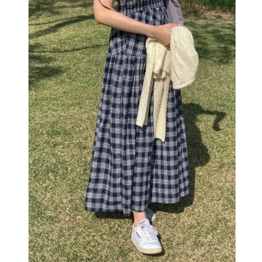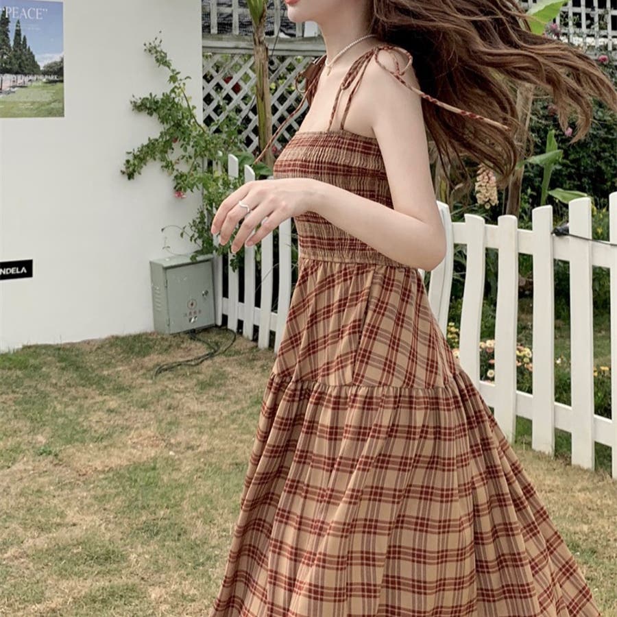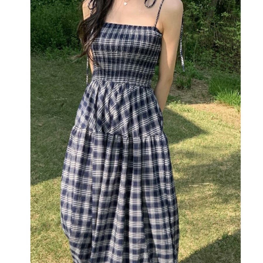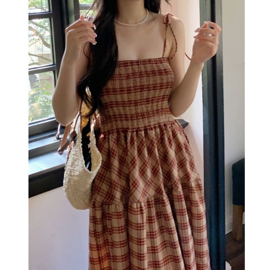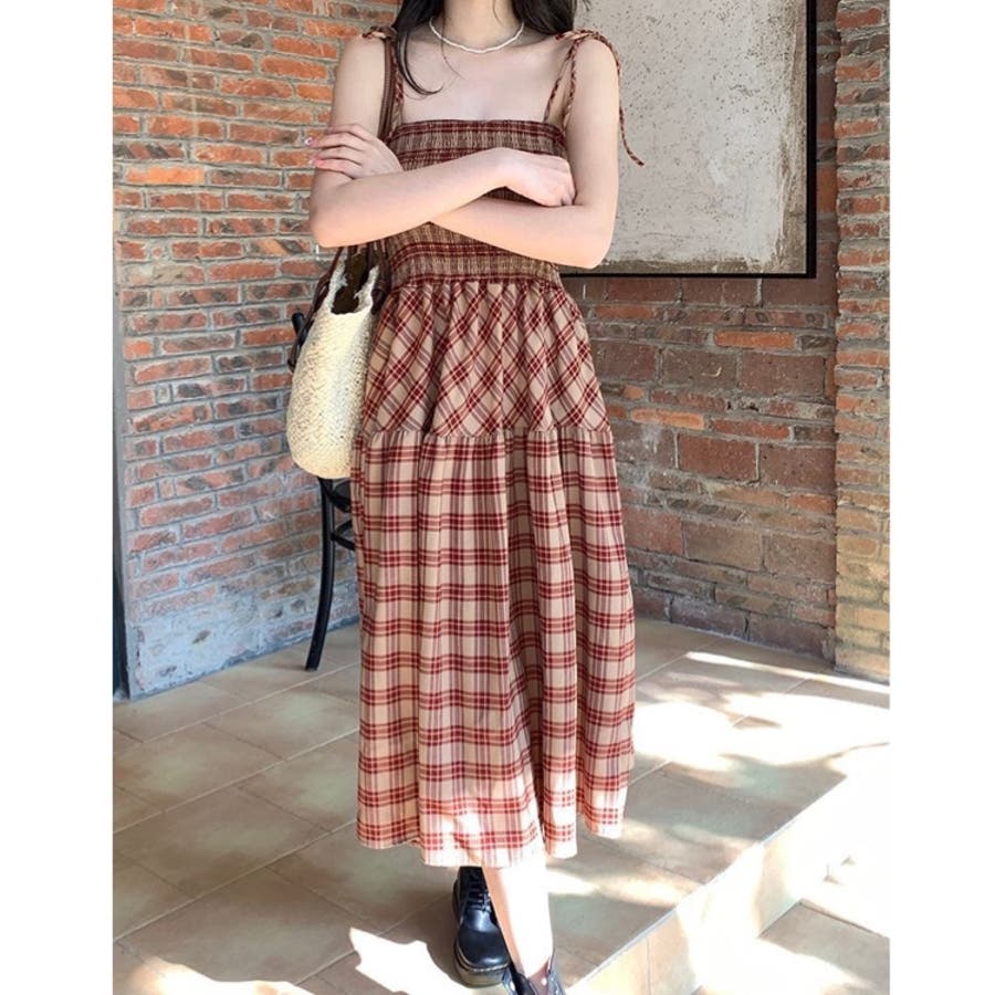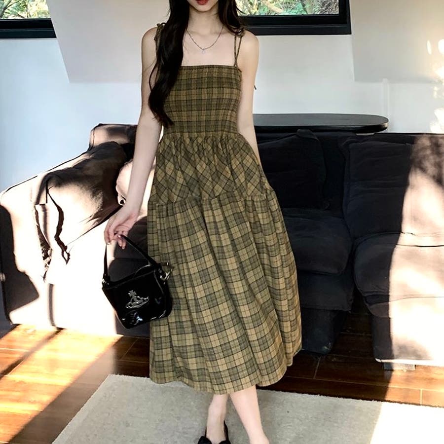 チェック柄シャーリングキャミワンピース