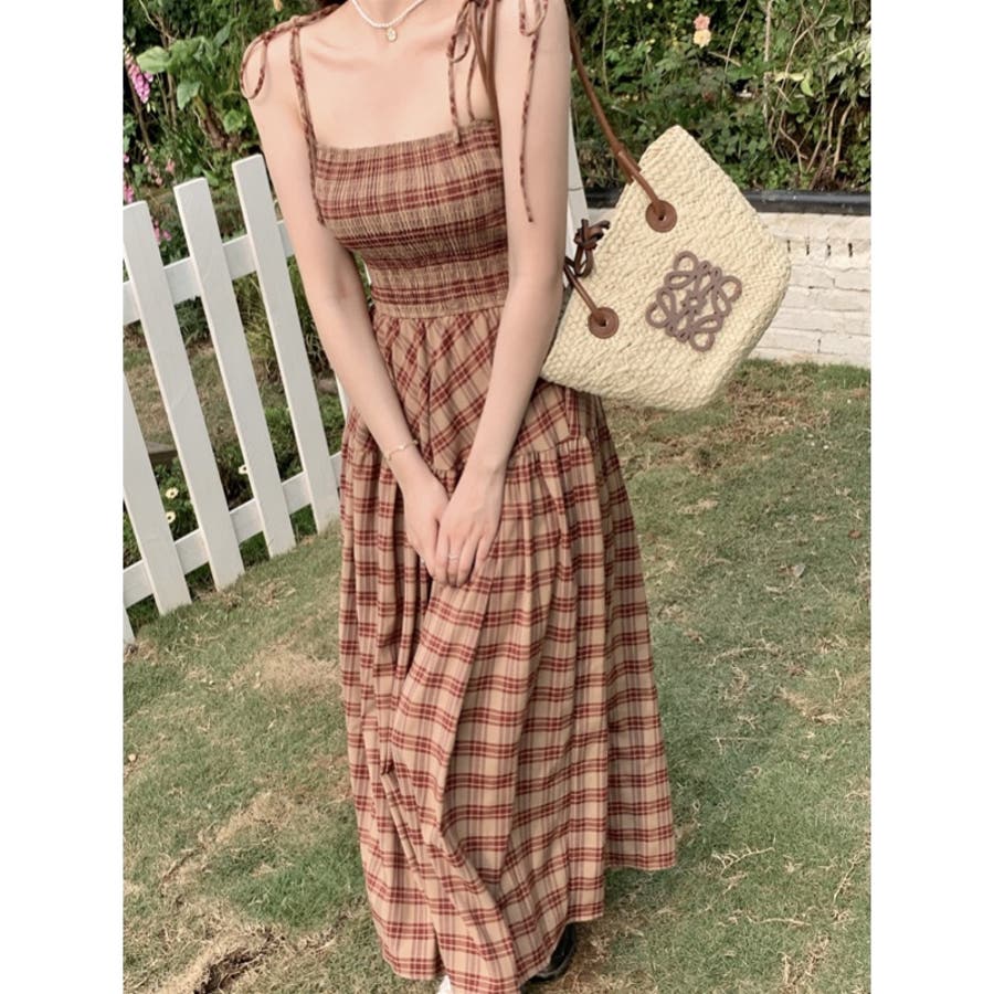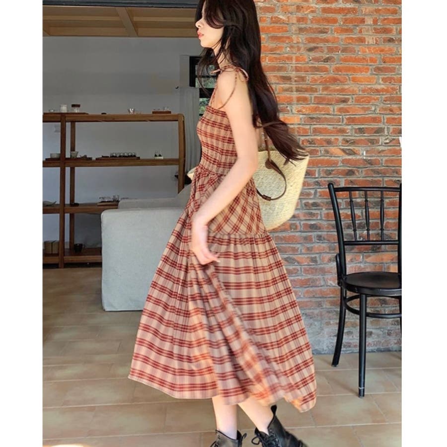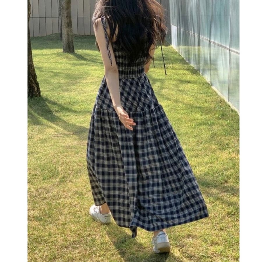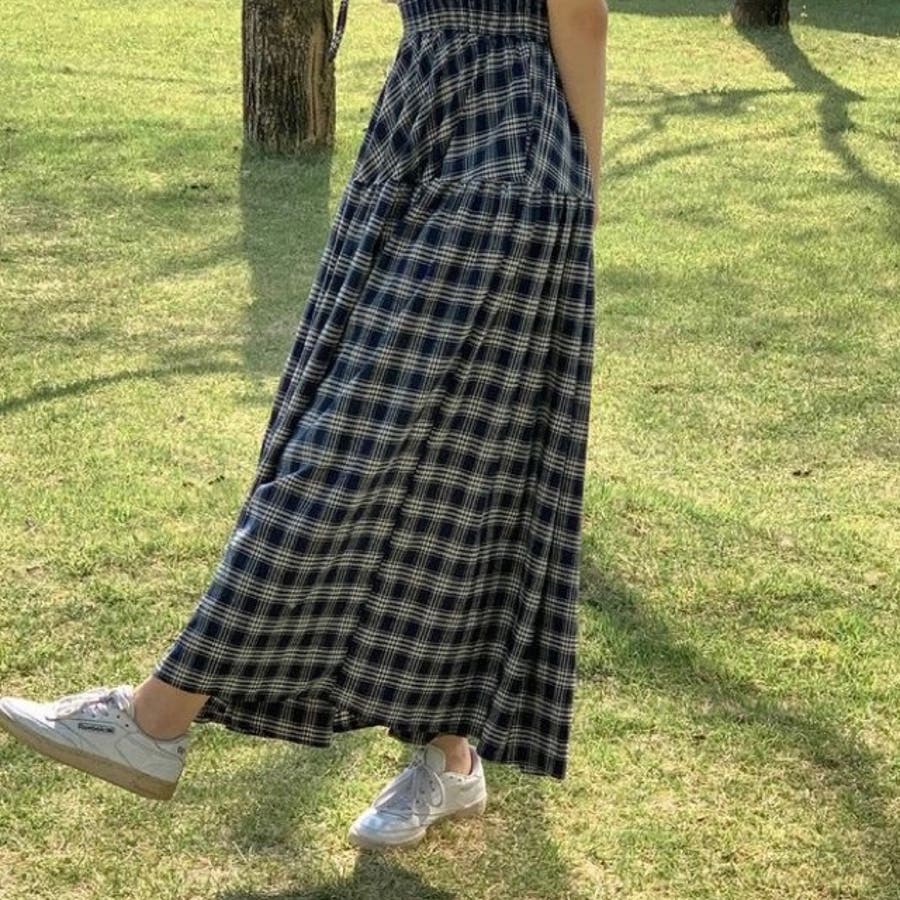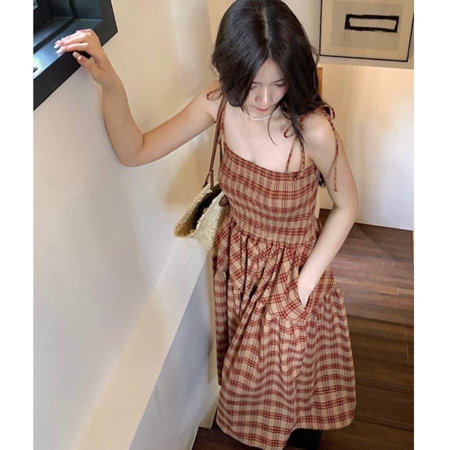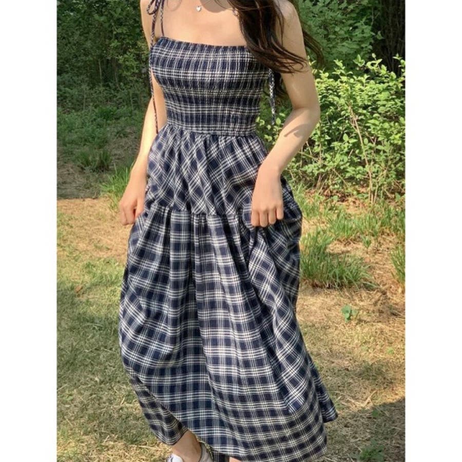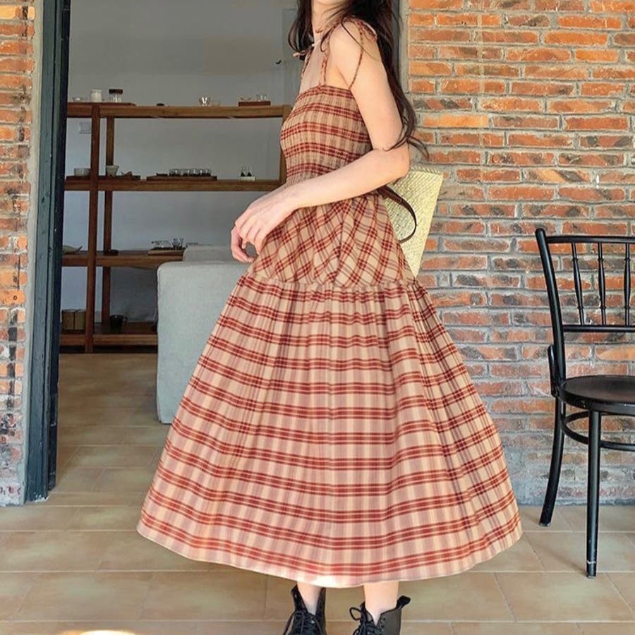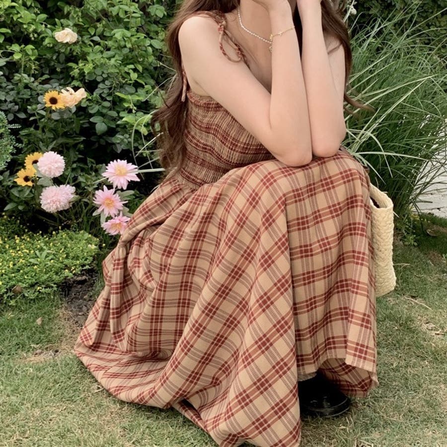 チェック柄シャーリングキャミワンピース