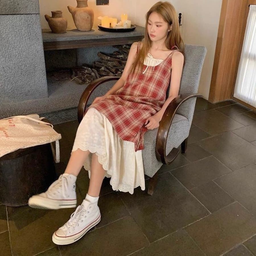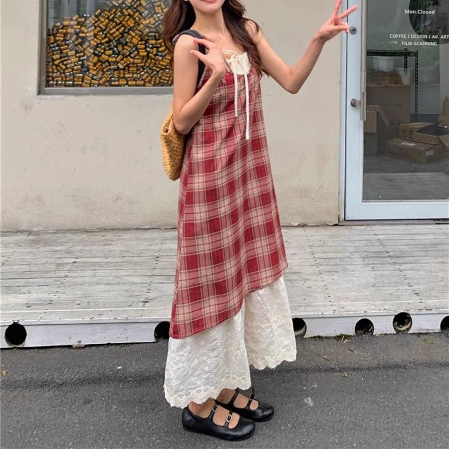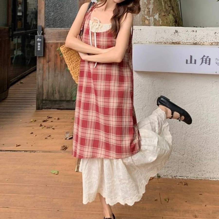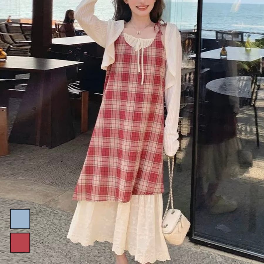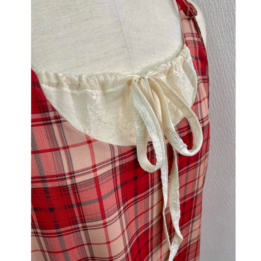 レトロ感のあるチェック柄と、裾からのぞくレースインナーが絶妙なレイヤード感を演出し、着るだけでスタイルが完成します。