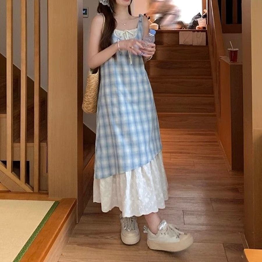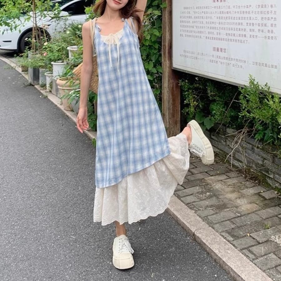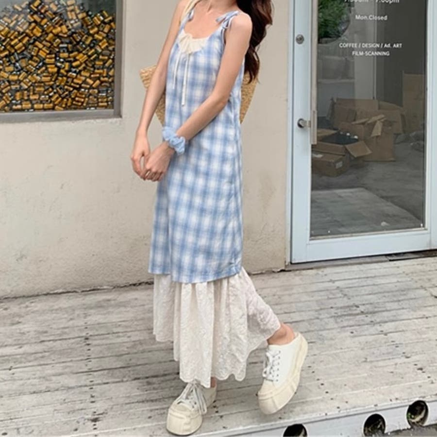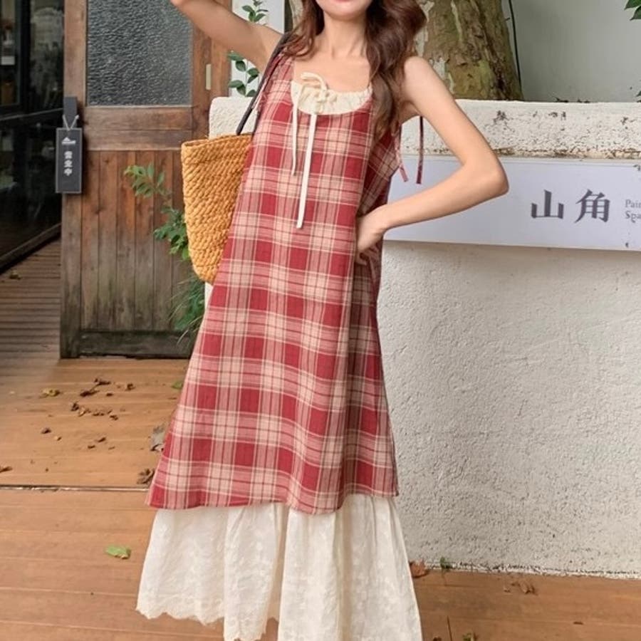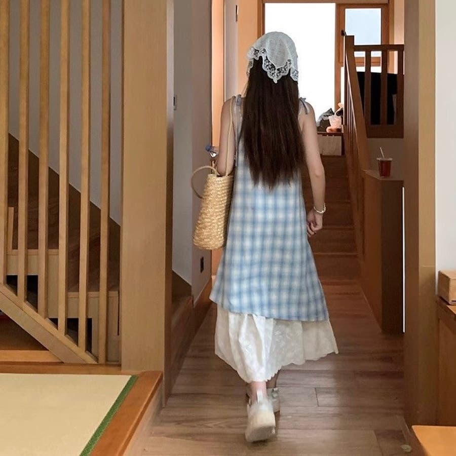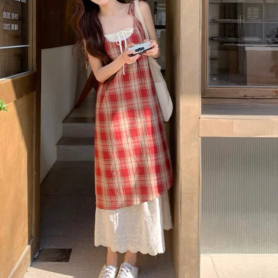 【春夏新作】レイヤード風チェック柄キャミワンピース