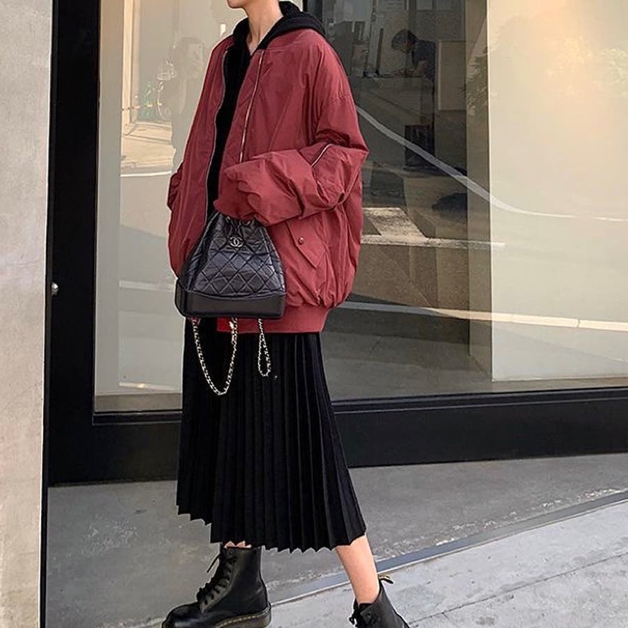 サテンのような風合いのハードなミリタリーアウターにはティアードスカートなどガーリーなアイテムを合わせる、甘辛MIXコーデも◎