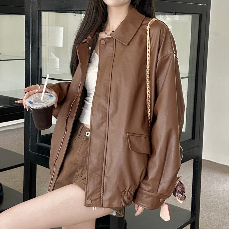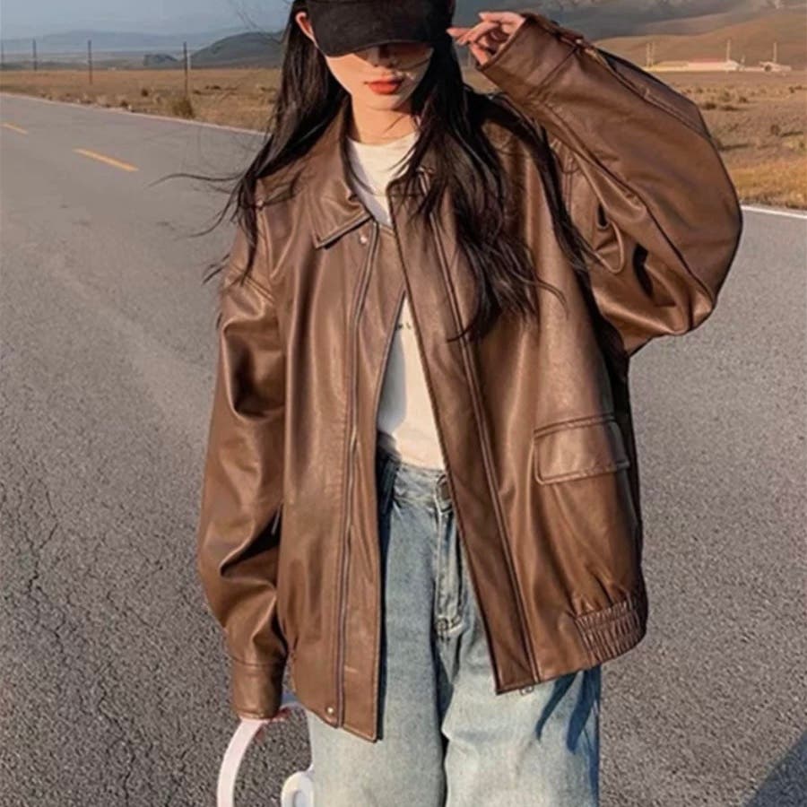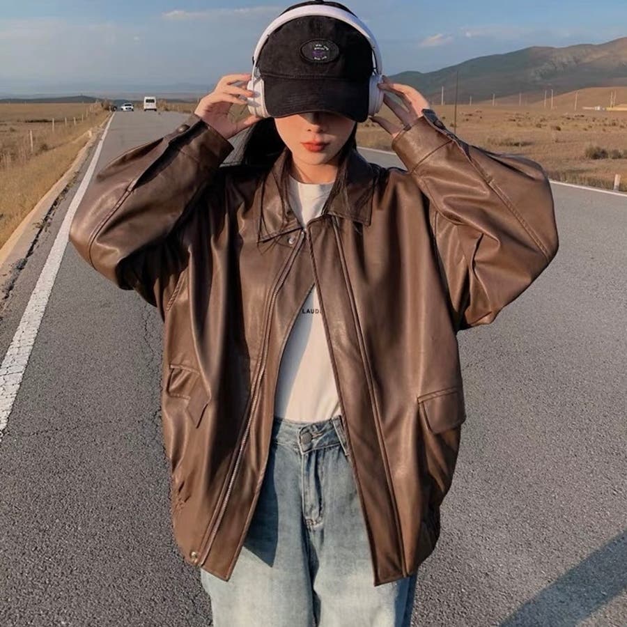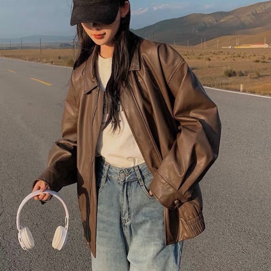 大人 カジュアル きれいめ 韓国ファッション 韓国コーデ 合皮 ブルゾン アウター ジャケット ビッグシルエット ゆったり 防寒 ビンテージ 古着 Y2K オフィスカジュアル 春服 冬服 秋服 10代 20代 30代 40代 春 冬 秋