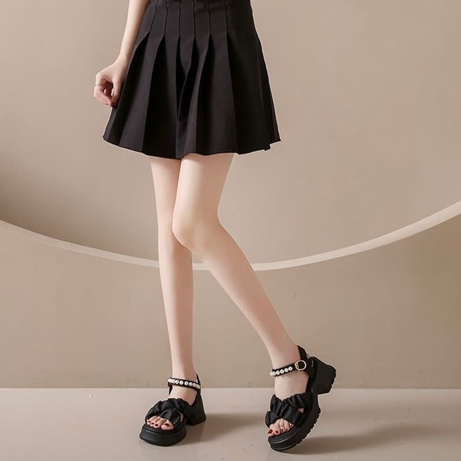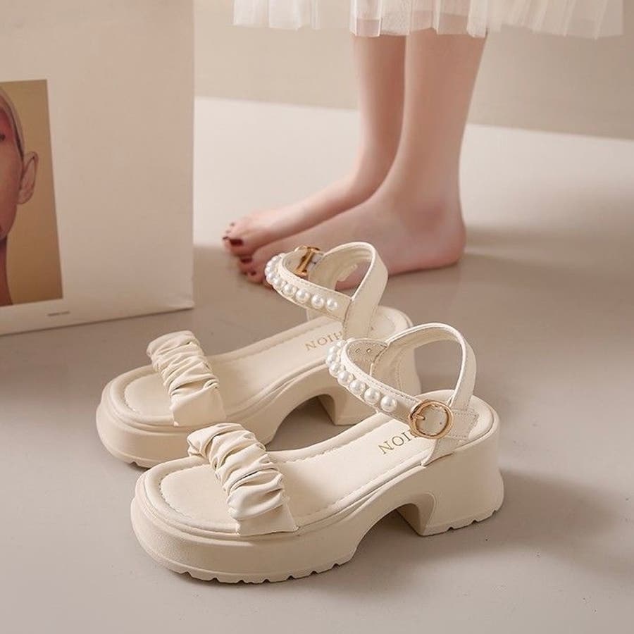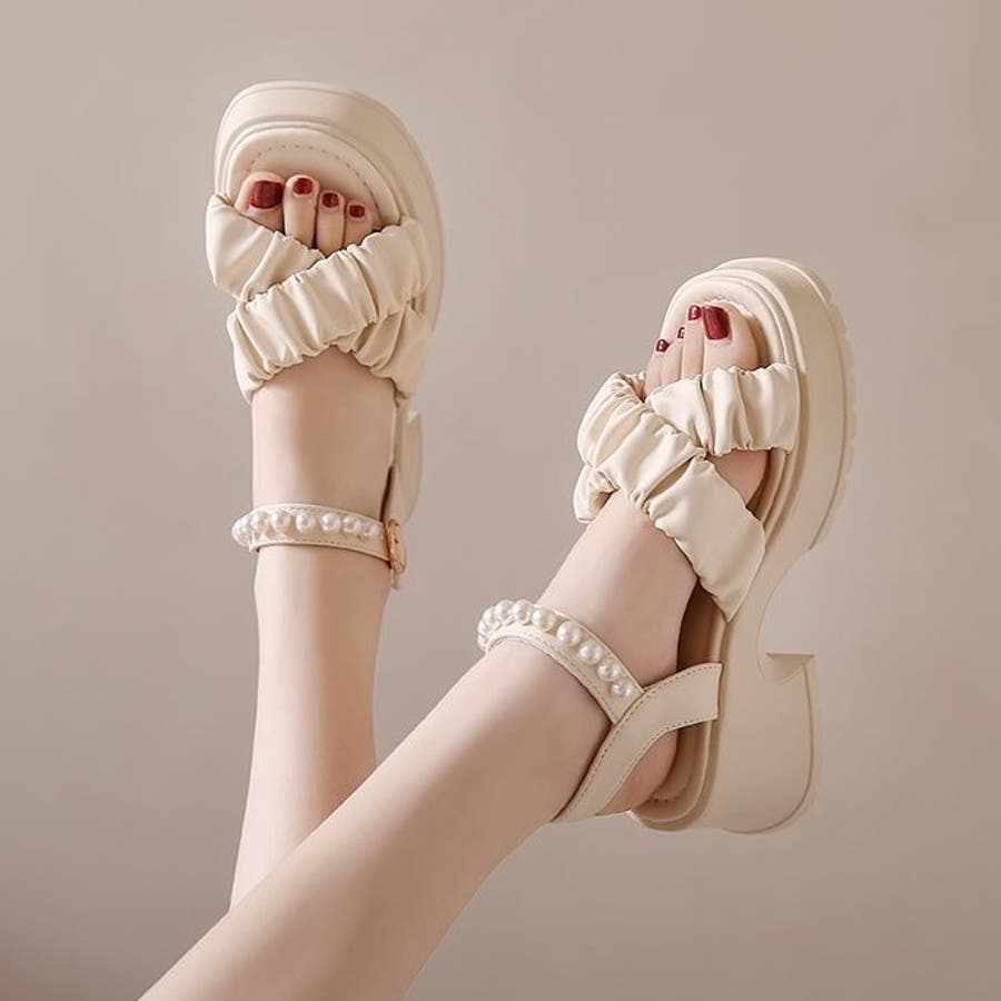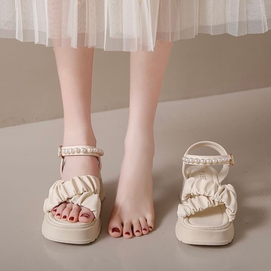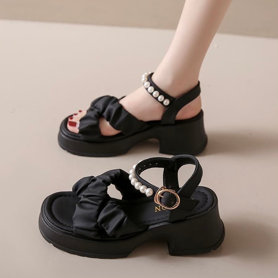 ボリューム感のあるフリルストラップとパール付きのアンクルベルトが華やかさを引き立てる厚底サンダルが登場。