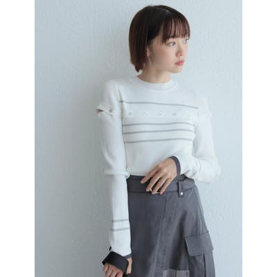 ●ボタン切替デザインとボーダーラインで立体感と存在感をプラスしたニットトップス。