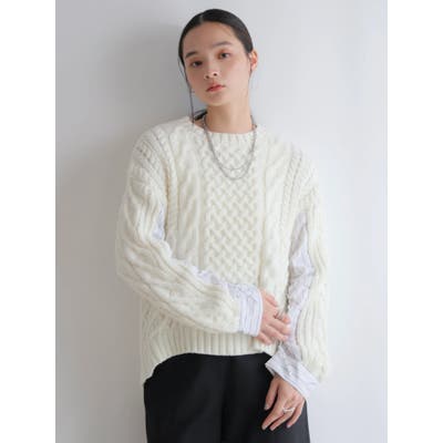●季節感たっぷりのざっくりケーブルニットに、シャーリングを施したシャツスリーブをドッキング。