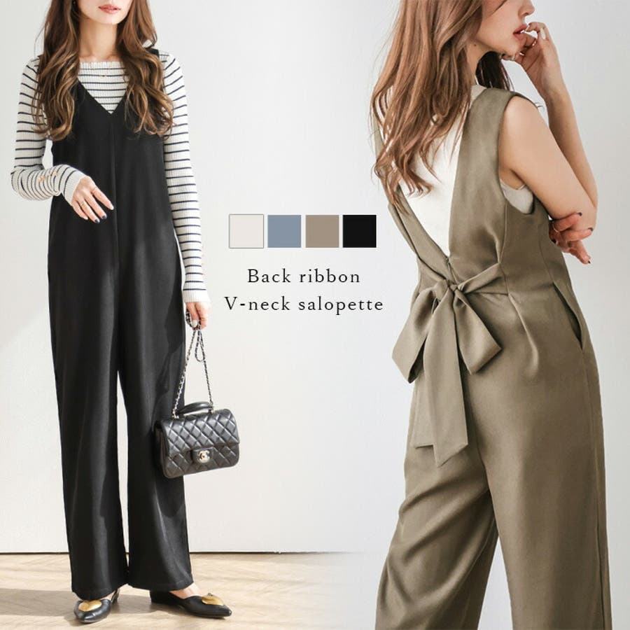 Vネックサロペット バックリボン ワイド