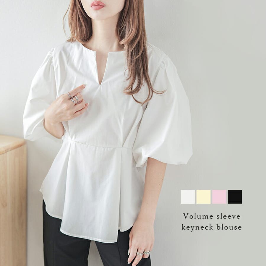 【イエロー】キーネックブラウス ボリュームスリーブ 5分袖