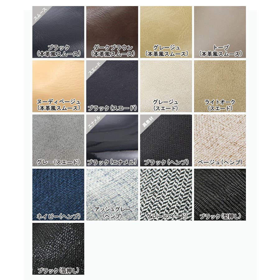 | カラー | ブラック(本革風スムース) / ダークブラウン(本革風スムース) / グレージュ(本革風スムース) / トープ(本革風スムース) / ヌーディベージュ(本革風スムース / ブラック(スエード) / グレージュ(スエード) / ライトオーク(スエード) / グレー(スエード) / ブラック(エナメル) / ブラック(ヘンプ) / ベージュ(ヘンプ) / ネイビー(ヘンプ) / アッシュグレー(ヘンプ) / グレー(ツイード) / ブラック(型押し) / ブラック(箔押し) |