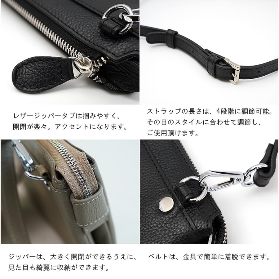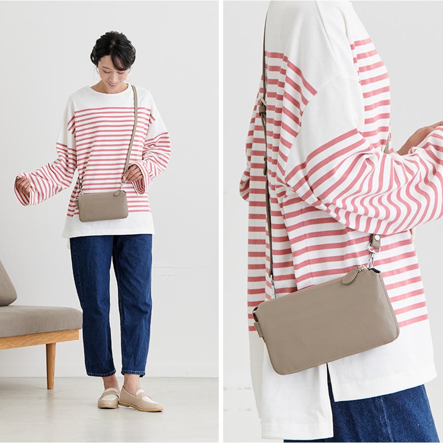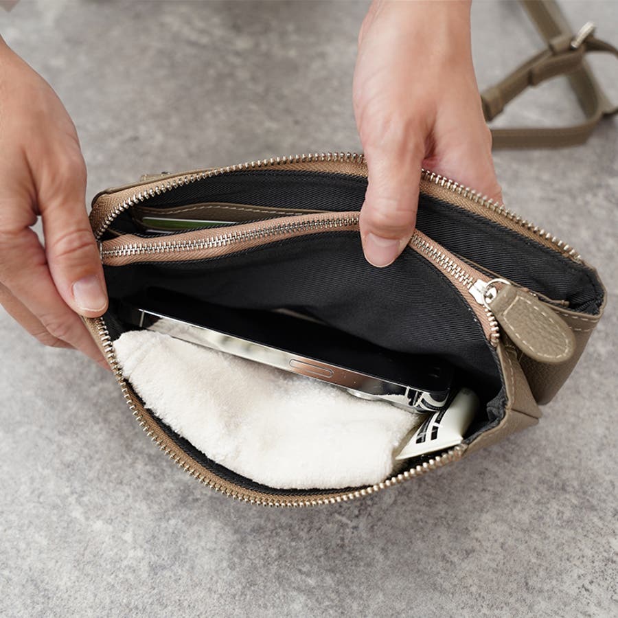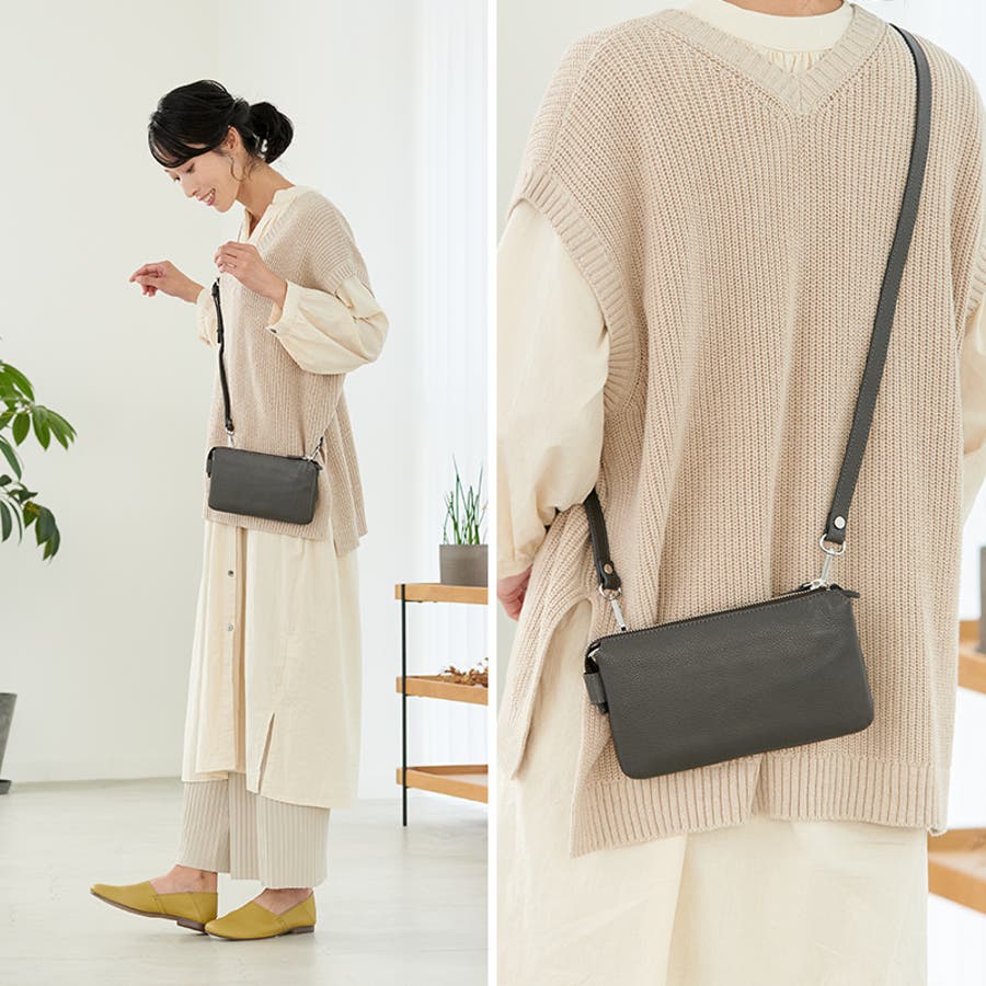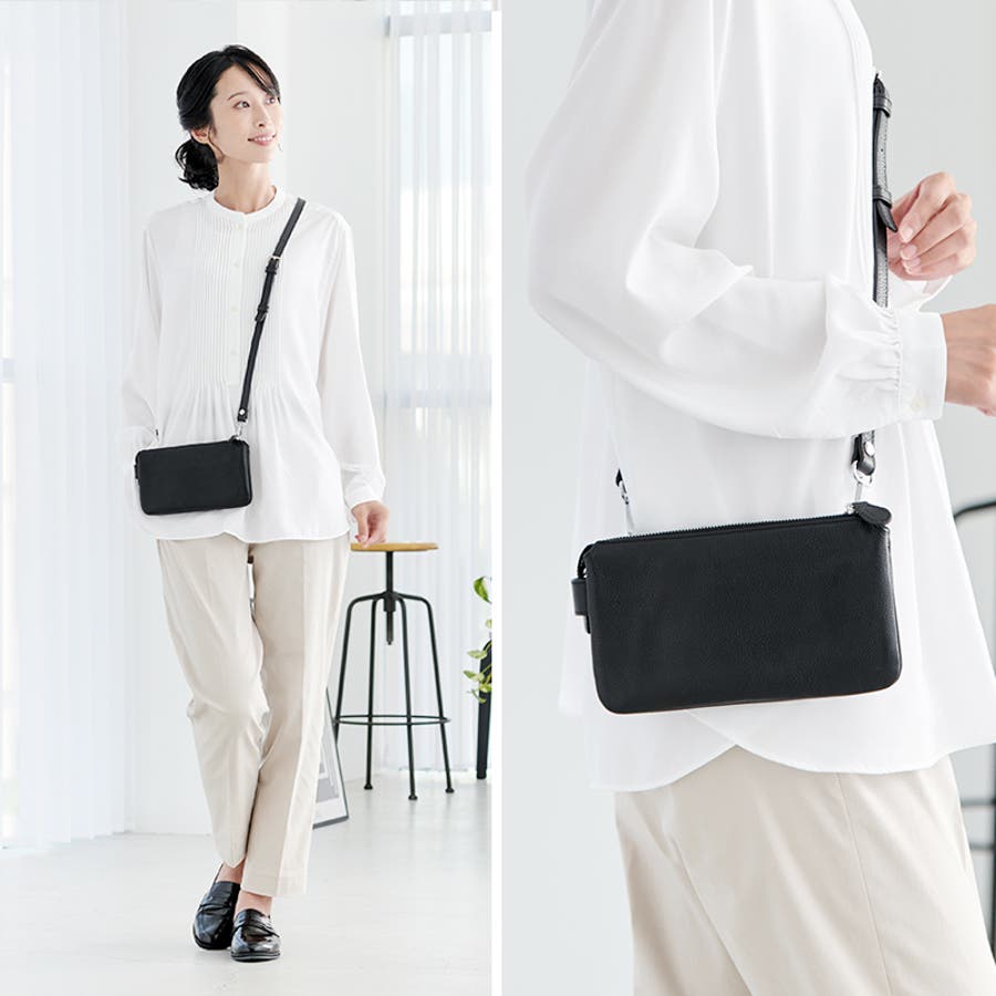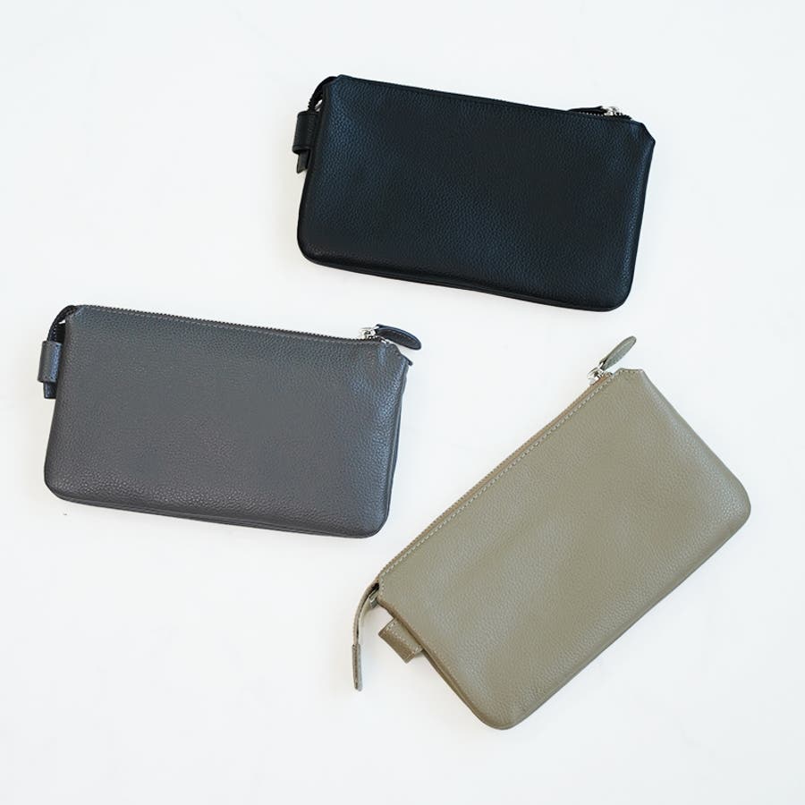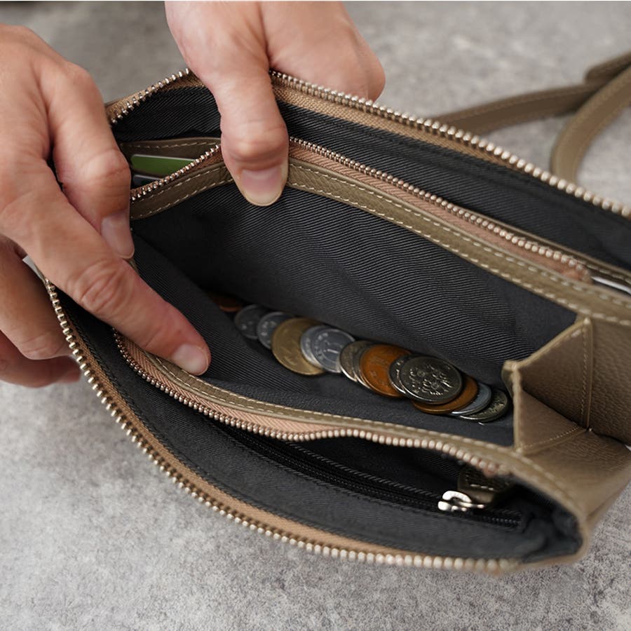 シンプルで上品なお財布ポシェット。 見た目だけじゃない、使い勝手の良さも◎ ファスナーを開けると、 カード収納 計4ポケット+お札入れスペース。 中央部分に小銭入れスペース。 マチ付きなので小銭も取り出しやすい。 マルチ収納ポケット。 スマートフォン、ハンカチ、リップ・・・ 必需品が収まる見た目以上の収納力です。 |