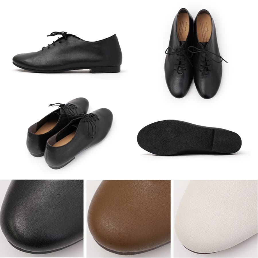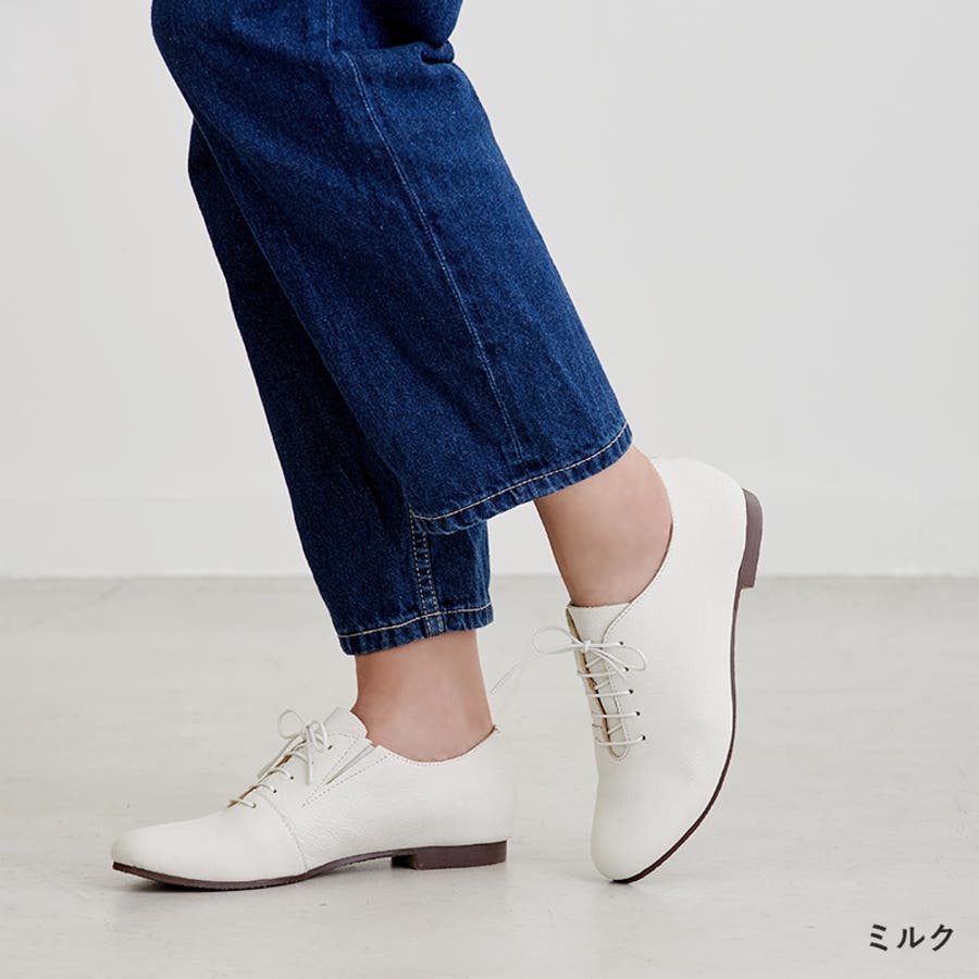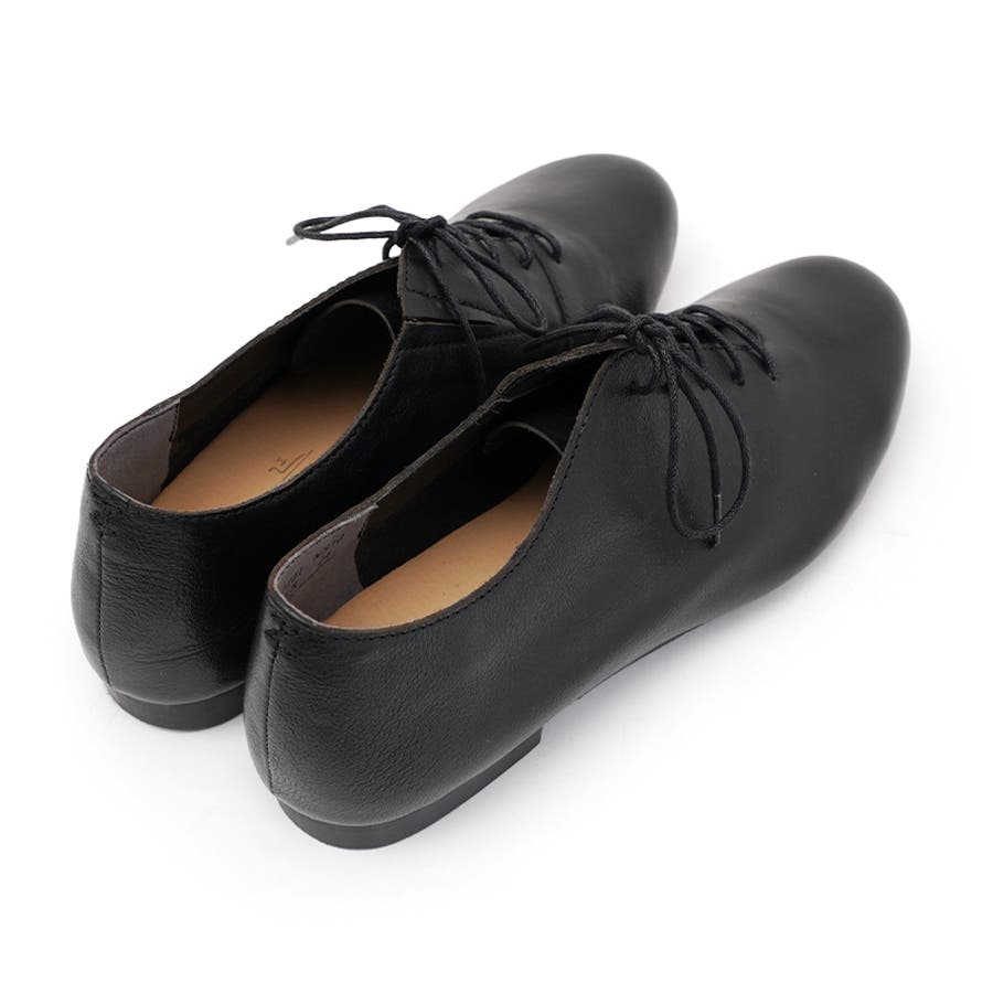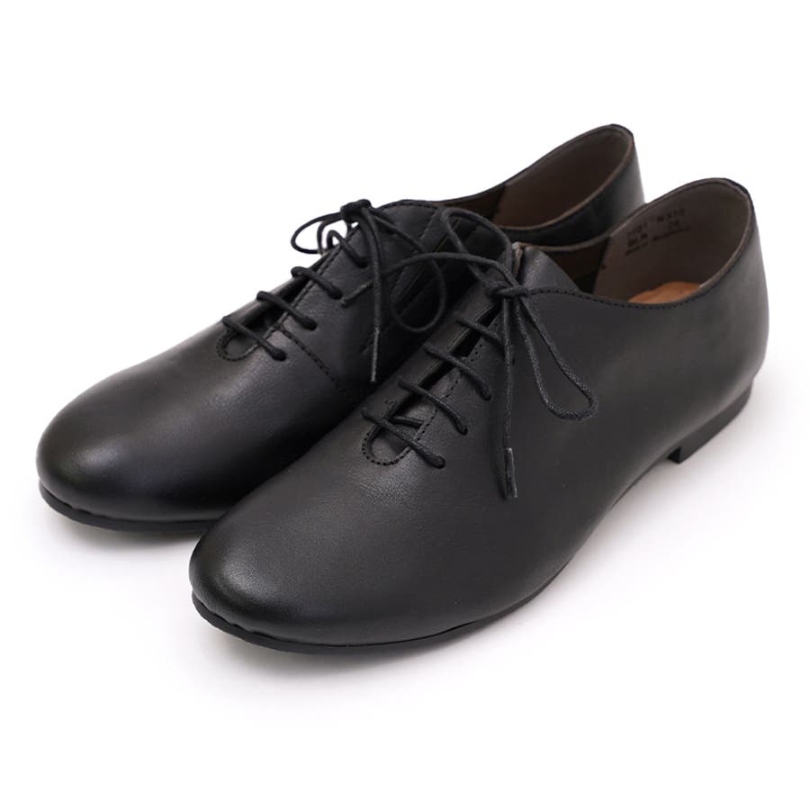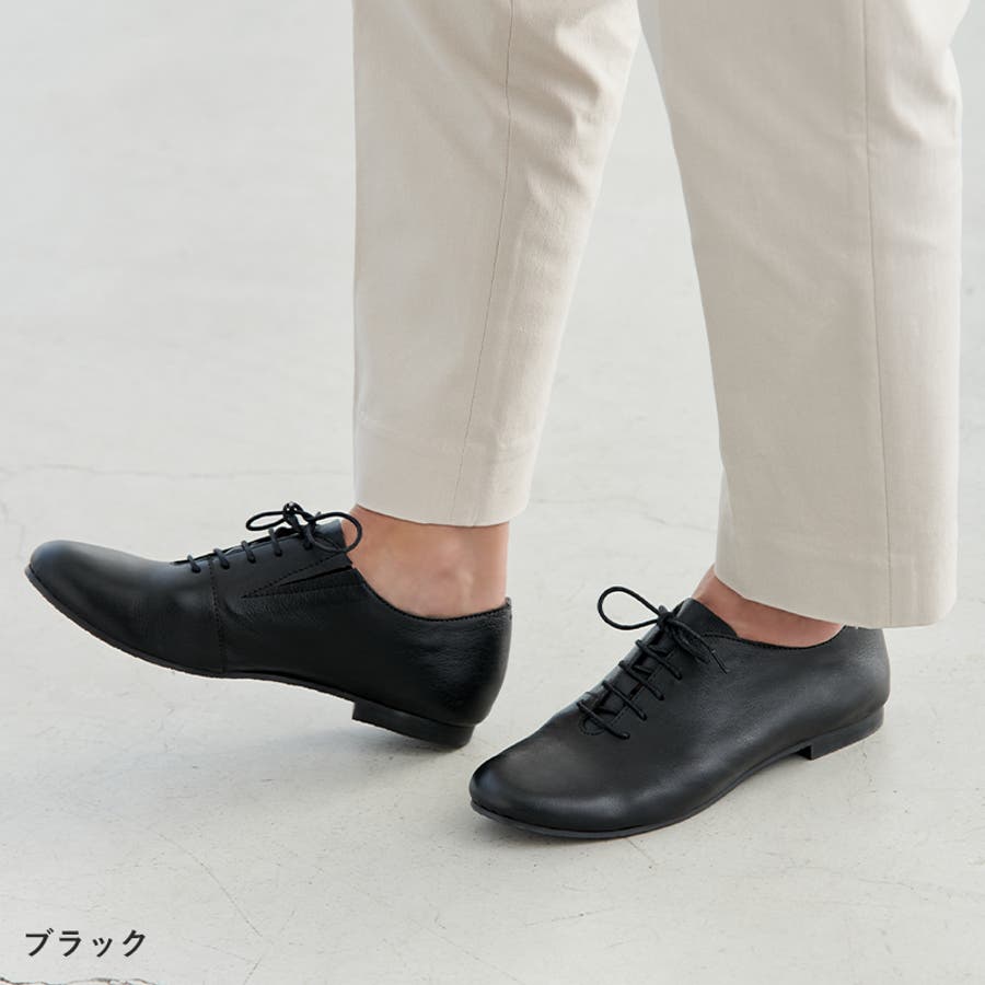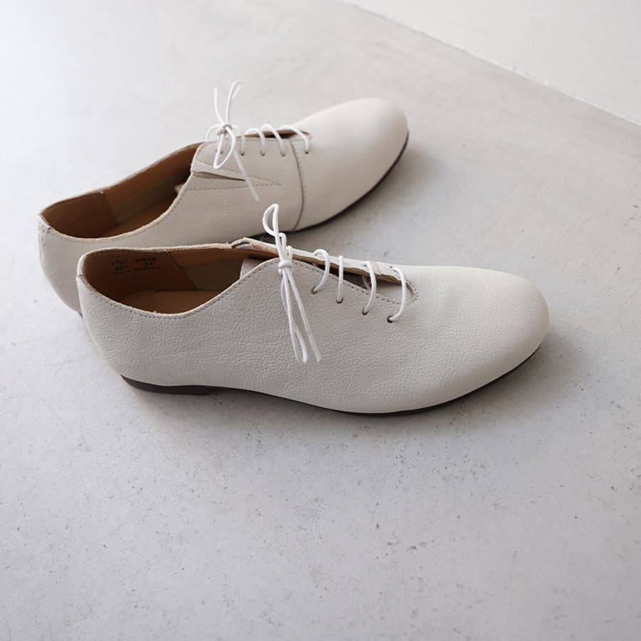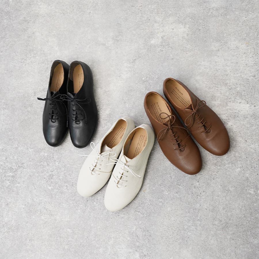 マニッシュで気取らない雰囲気のレースアップシューズ。 ベーシックな3色展開で、飽きのこないスタンダードなデザインが魅力です。 -POINT1- 一枚革ならではの上質な柔らかさ。 つま先・かかとは固い芯材を仕様していないので、 足に優しくフィットします。 -POINT2- サイドに隠しゴムが付いているので、着脱がしやすいのも嬉しいポイント。 -POINT3- 歩行時に足に負担をかけにくい、片足約210gの軽量仕様。 -POINT4- 中敷きには程よく沈む3mm厚の低反発クッションをひき、 長時間の歩行でも疲れにくい。 |