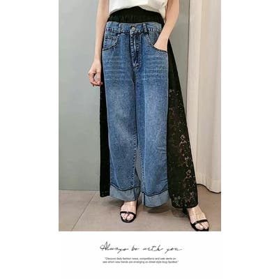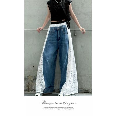 ワイドパンツ 膝下 リラックスデニム ゆったり ウエストゴム 無地 レース