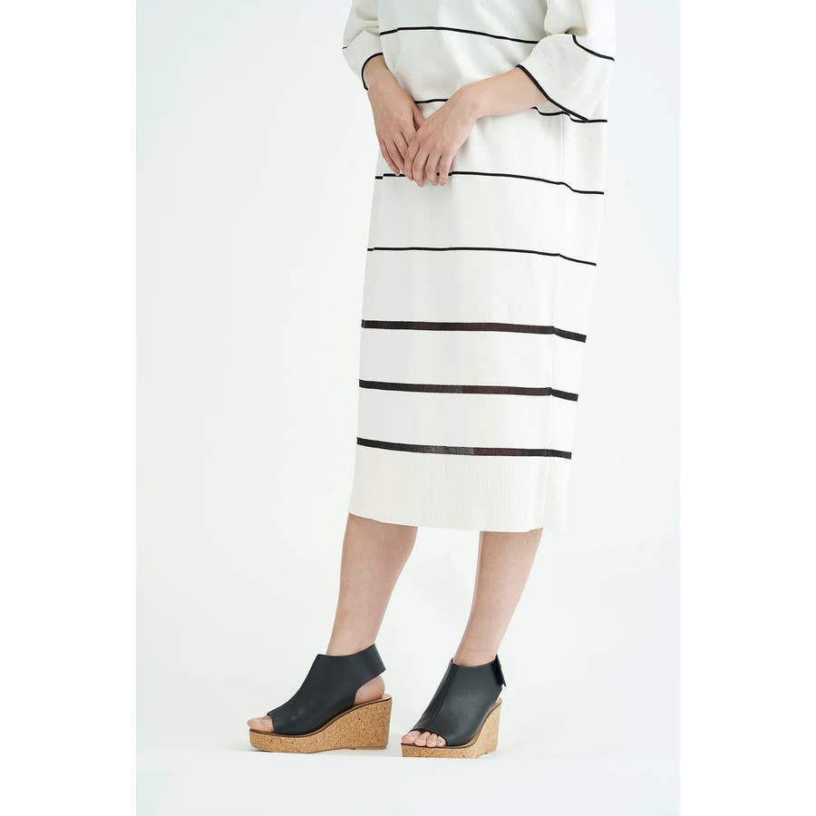ボーダーのライン部分にはシルク糸を使用。特に裾の3本はシアーになるよう編立してあり、スタイリッシュな透け感がデザインのアクセントに。さらりとした紙糸ならではのドライタッチな風合いで、1枚で着ても快適で様になるデザインです。