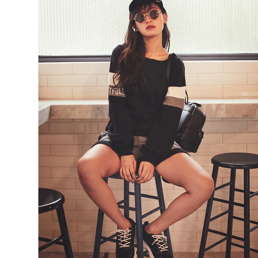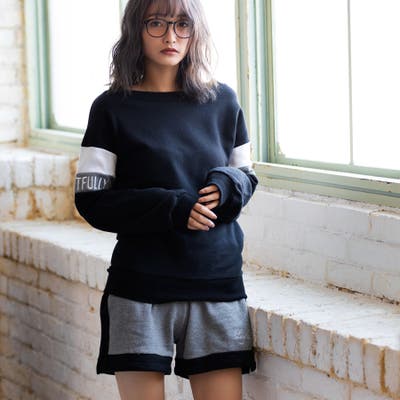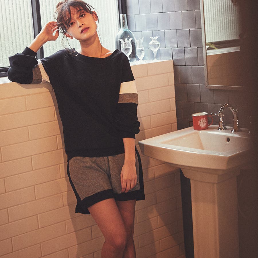 袖の配色&上下の配色がオシャレで着やすく、シティでも決まるセットアップ。ロゴ刺しゅうもシンプルながらもスタイリッシュ!脚をキレイに魅せるちょこっとスリットの入ったショーパンと、やや広くあいたボートネックで女らしさもプラス。ウエストゴム仕様なので、お家でもくつろげます。