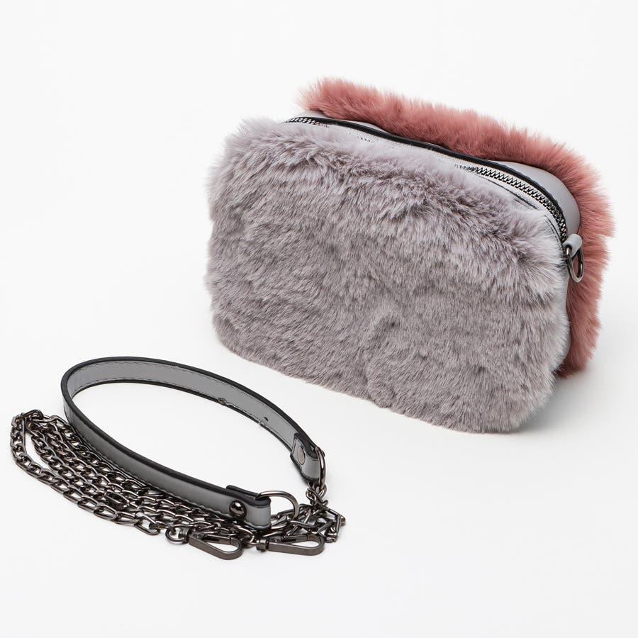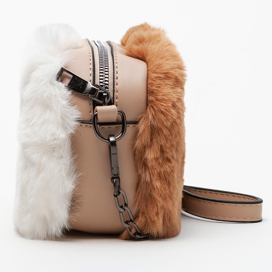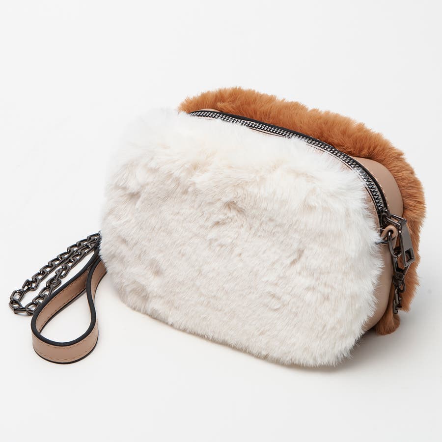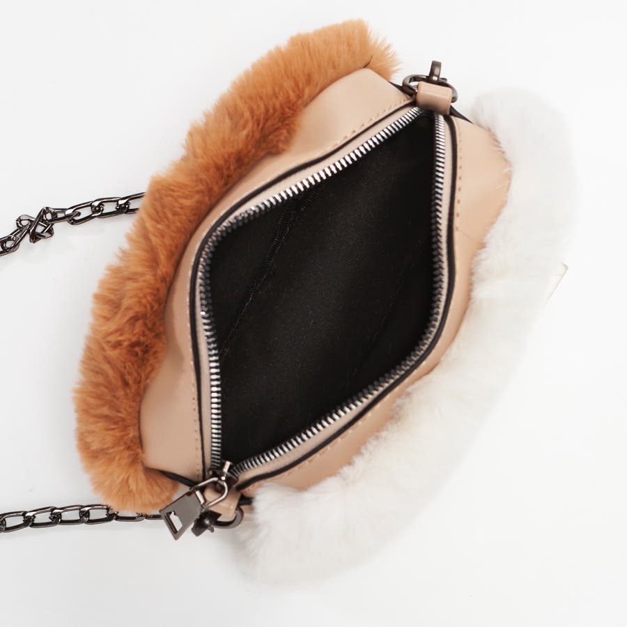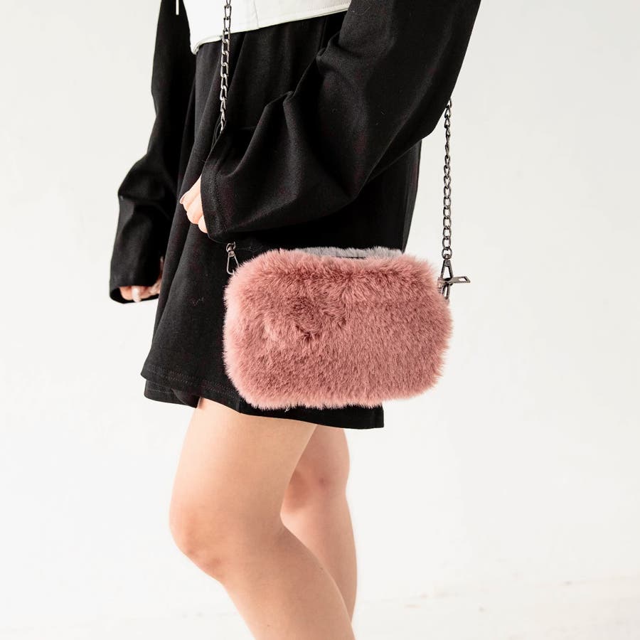 コーデを華やかをプラスする、エコファーミニバッグ。持ち運びやすい長めのストラップ付きで、ちょっとしたお買い物のお供にもいい感じ♪マチの広いスクエアデザインだから、たっぷり量が入るのも嬉しい!