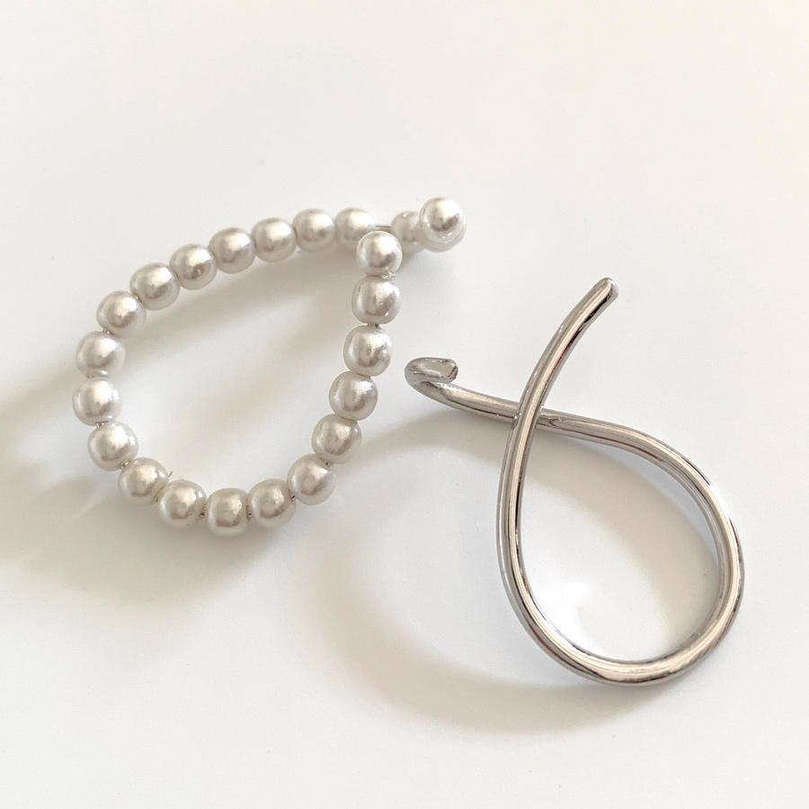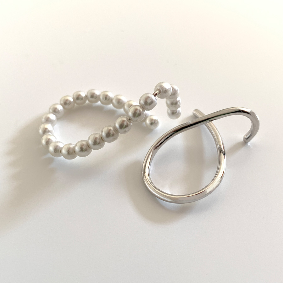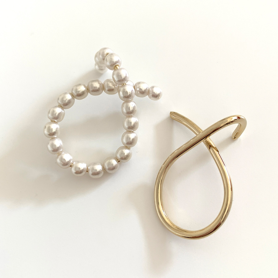 パールとメタルの上品華やかな立体イヤーカフ2点セット。重ね着けしたり、別々で着けたり、お好みの着け方で洗練された横顔を演出!耳にかけるだけの簡単装着で、ノンホールのイヤリング派にもおすすめ★シンプルながら顔まわりを華やかに仕上がる2点セットは、普段使いはもちろんドレスアップした時にも大活躍!