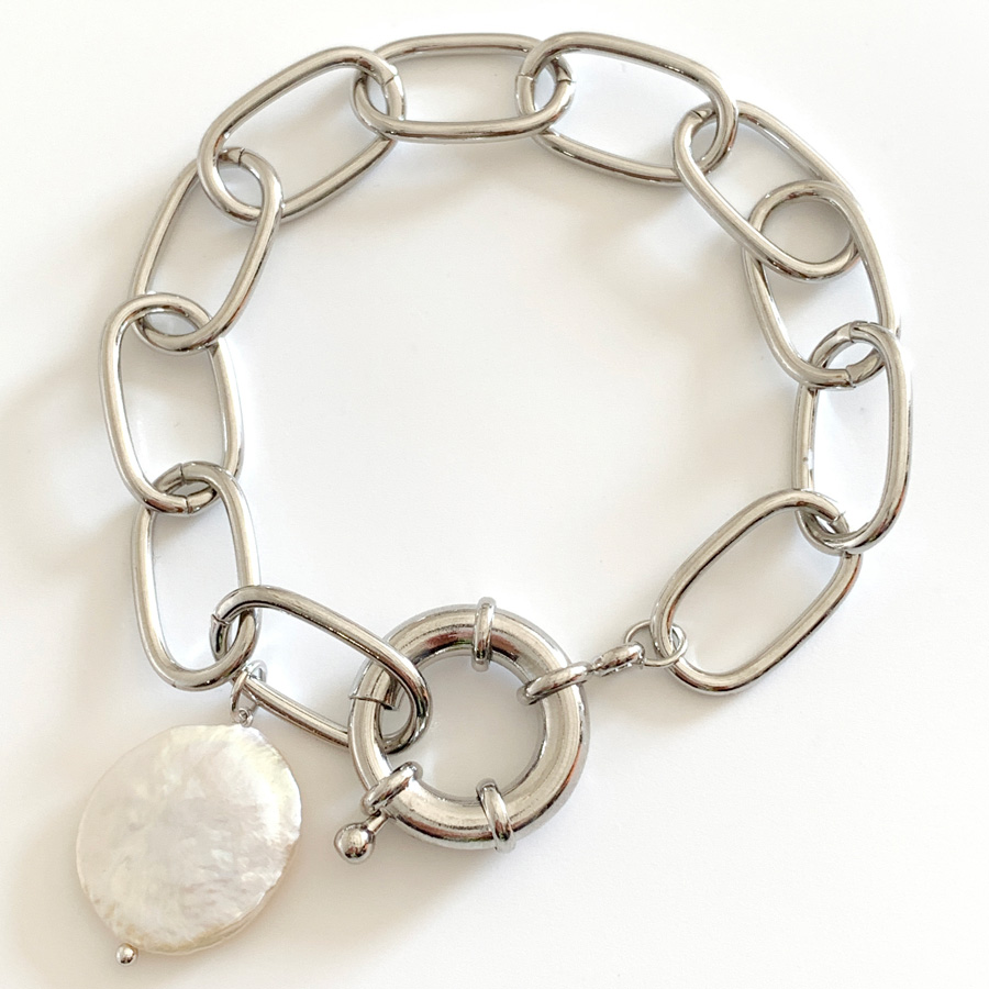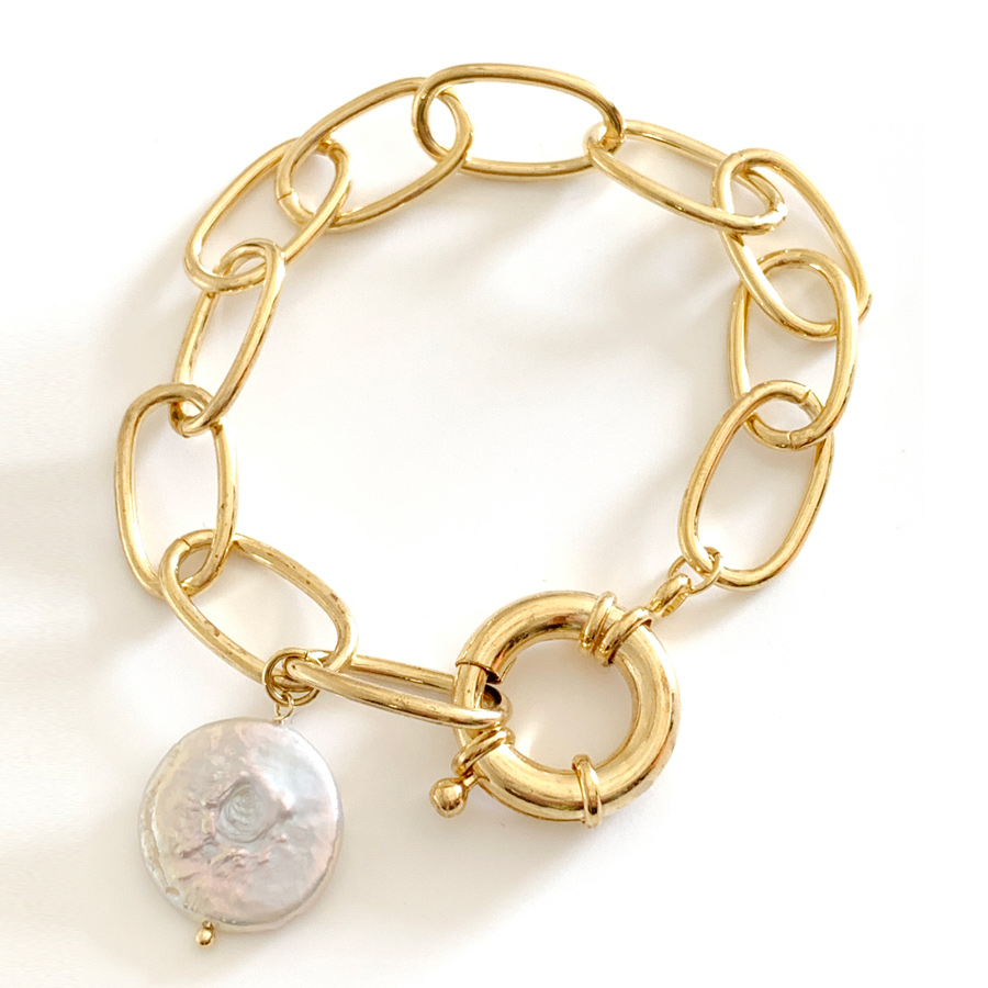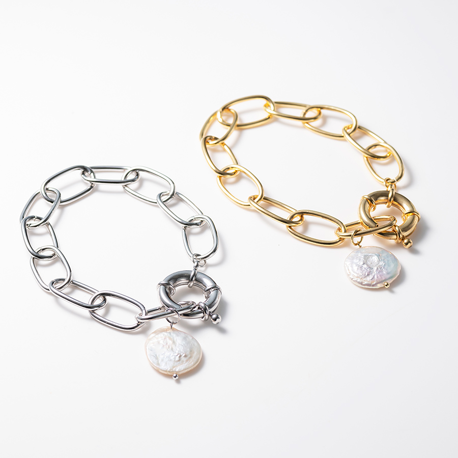 シェルモチーフ付きの夏らしいボリュームチェーンブレスレット。半袖やタンクトップで手元の寂しくなるこれからの時期におすすめのアイテム♡留め金具は大きめの引き輪で、ワンタッチで付け外しもラクラク♪