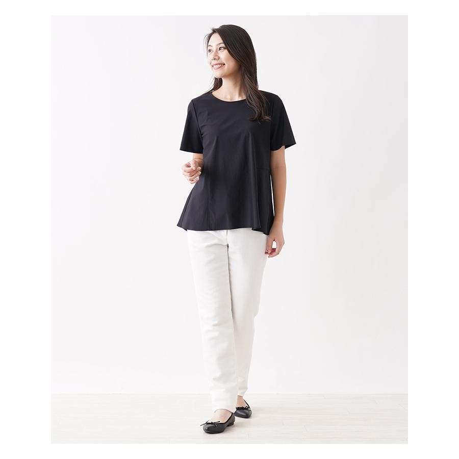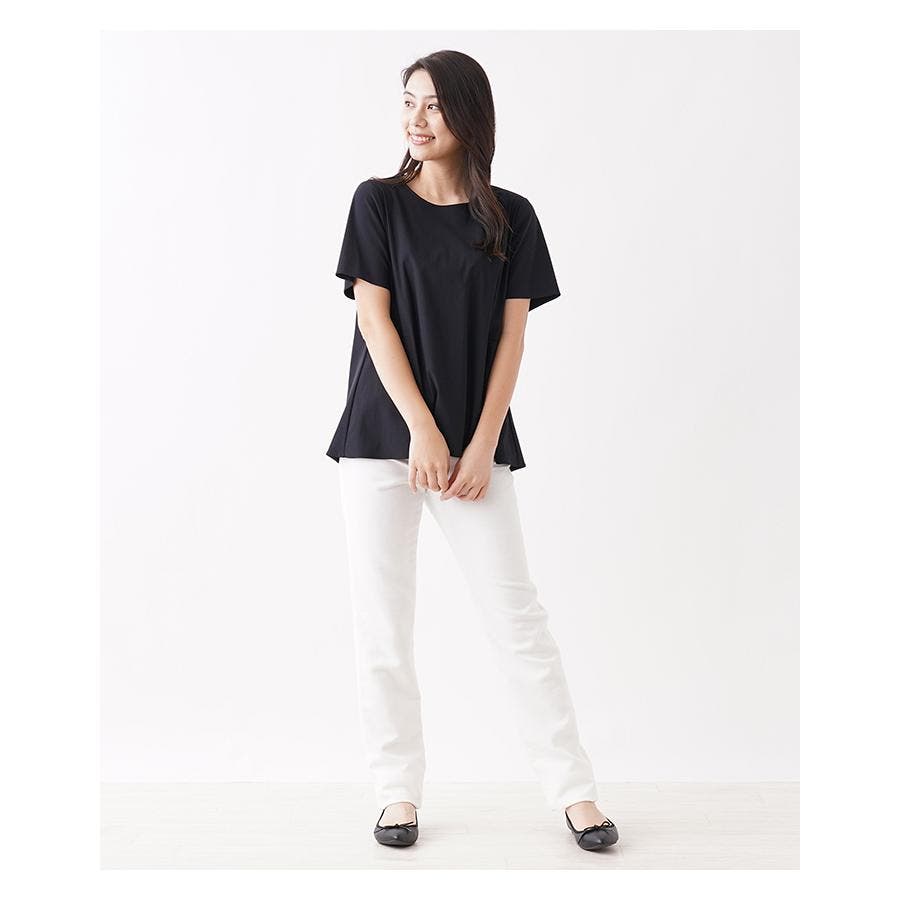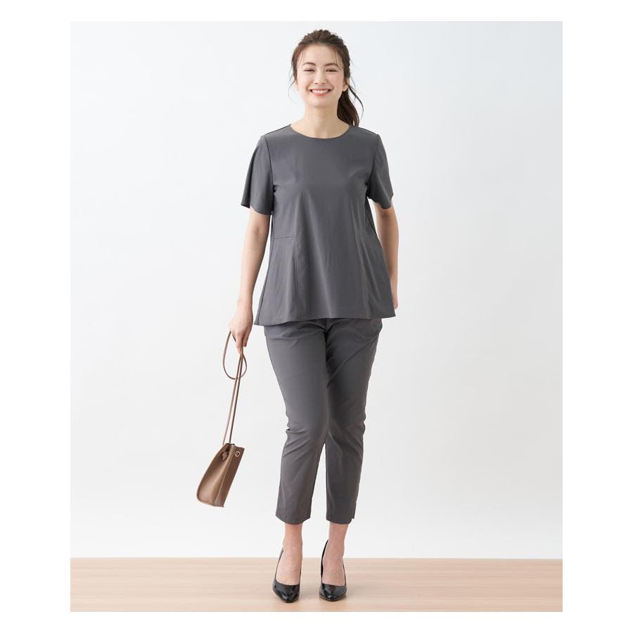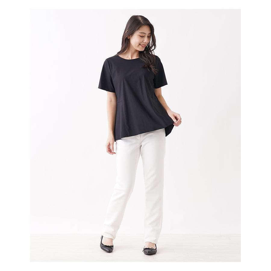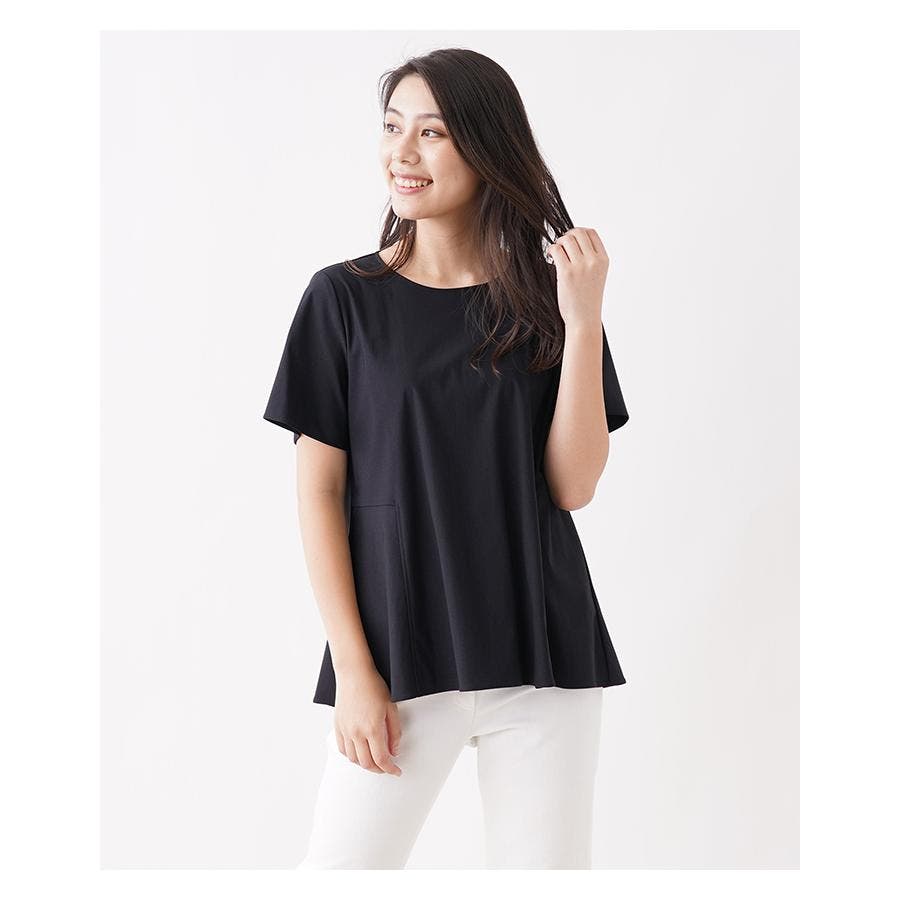 ふわっと広がるフレアなシルエットで女性らしさをキャッチした半袖カットソー。程よいハリのあるストレッチ素材は滑らかな生地感で、キレイめコーディネートにもマッチ。シンプルながら小ワザの効いたスタイリングが楽しめます。
