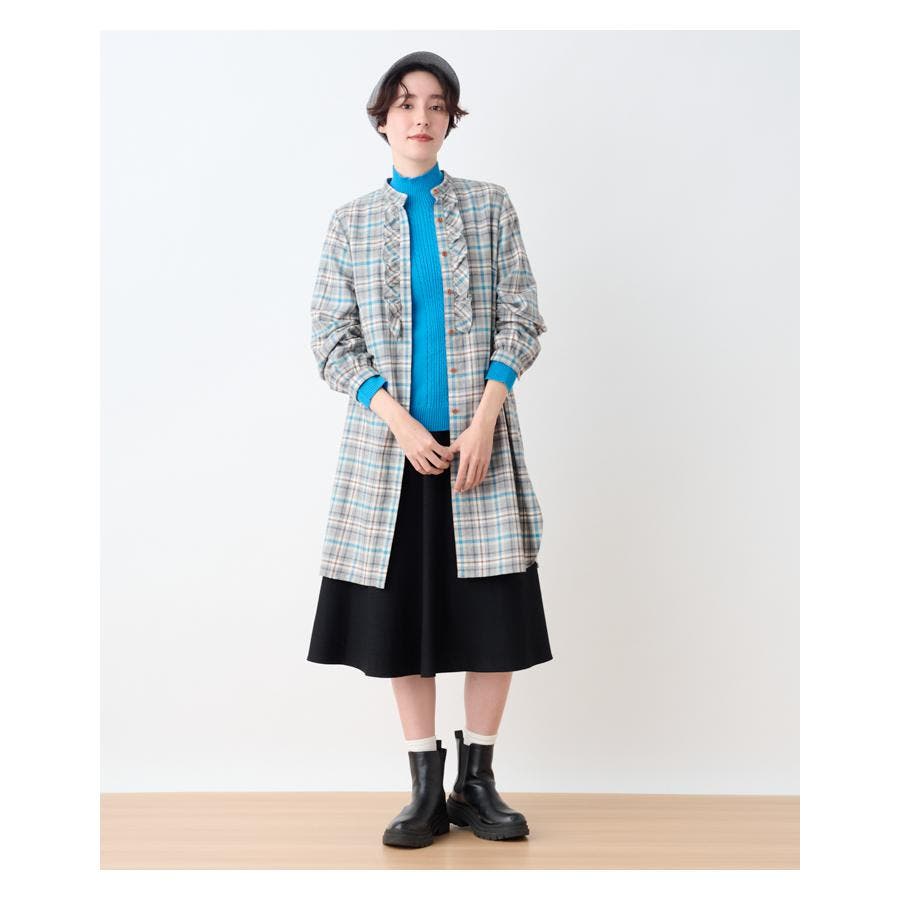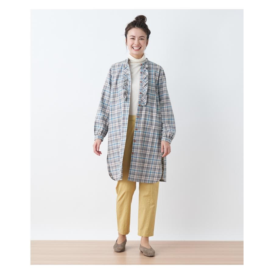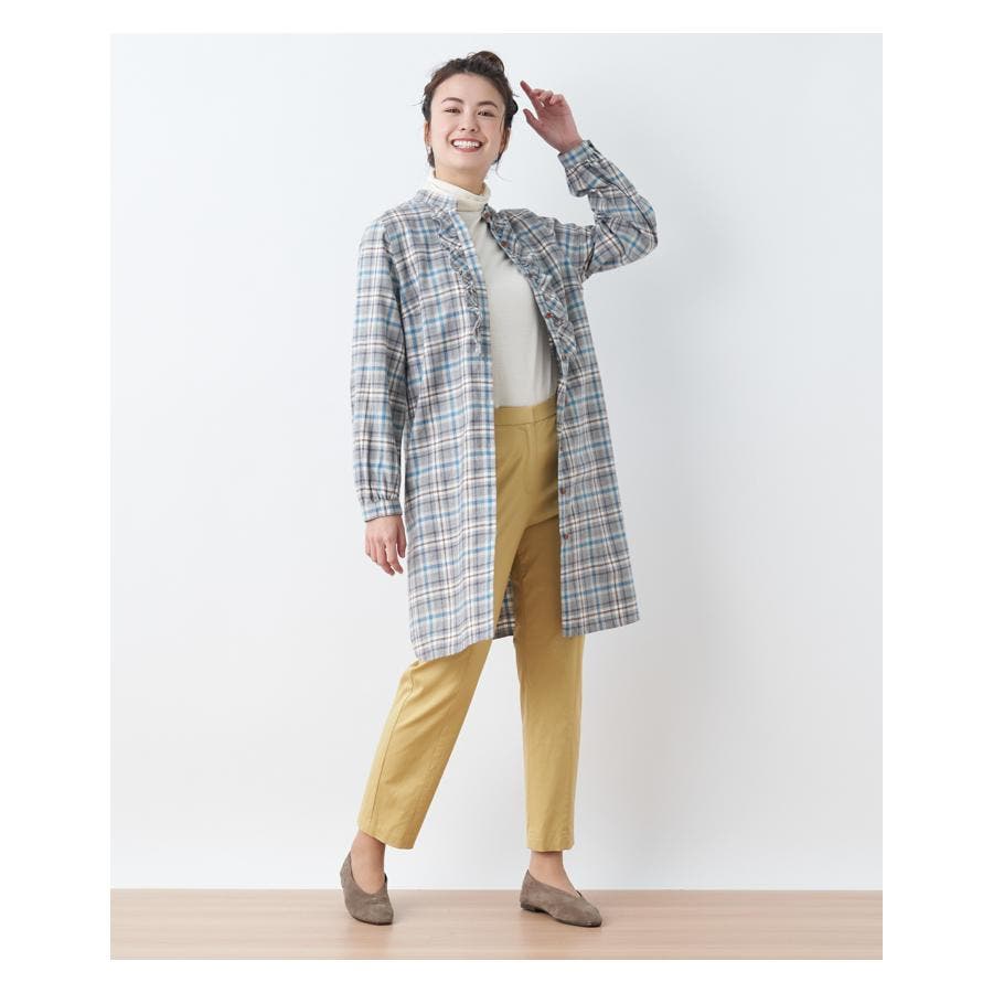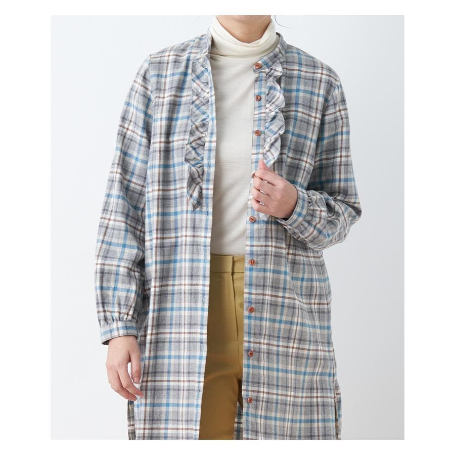 1枚着はもちろん、レイヤードのインにもアウトにも大活躍してくれるチェック柄の長袖シャツ。ワンピースのようなロングレングスだからアウター感覚でも着こなせて、フロントにあしらったフリルが大人の可愛さを後押しします。