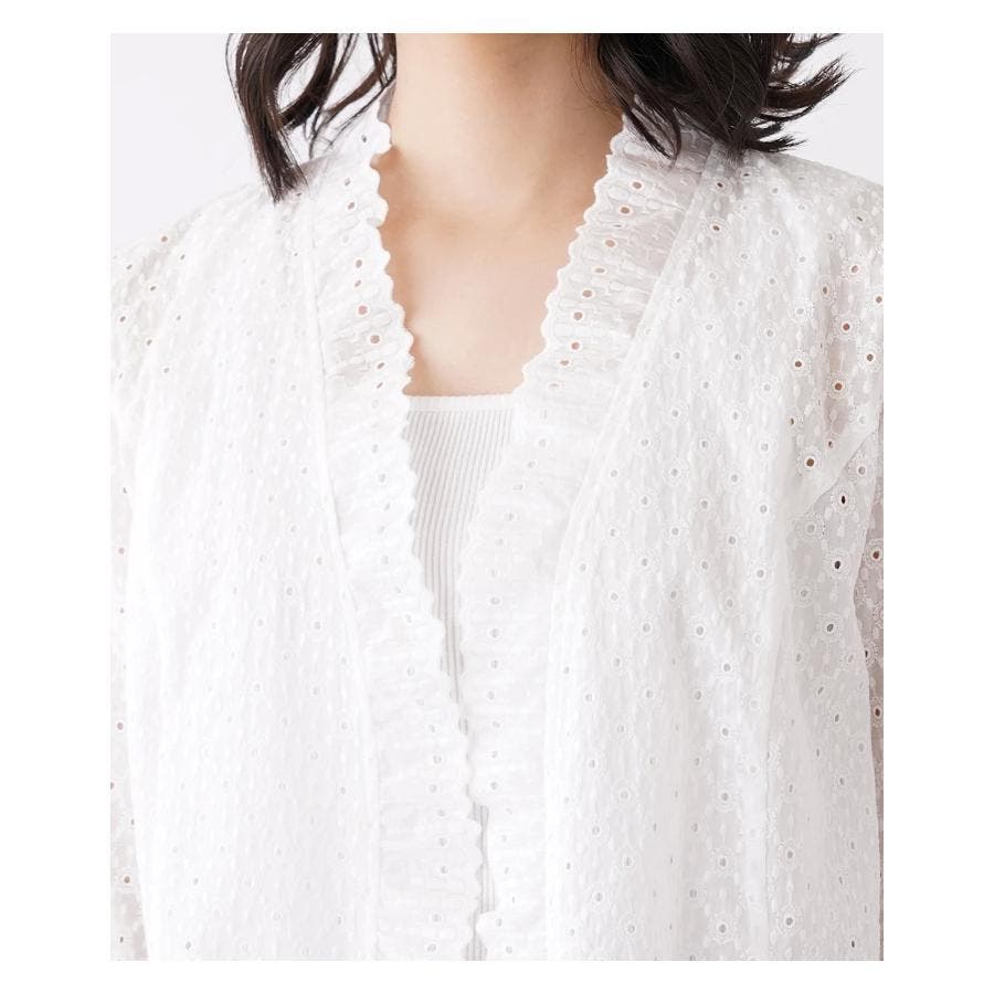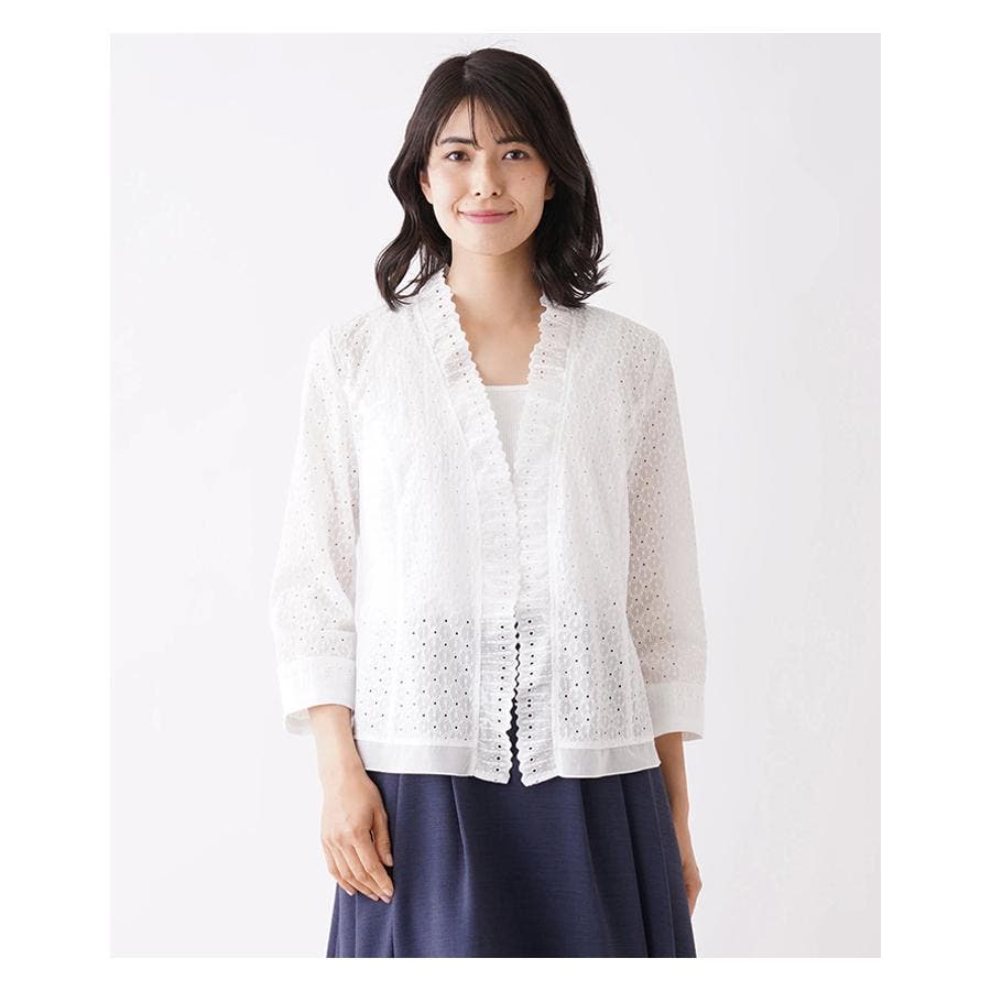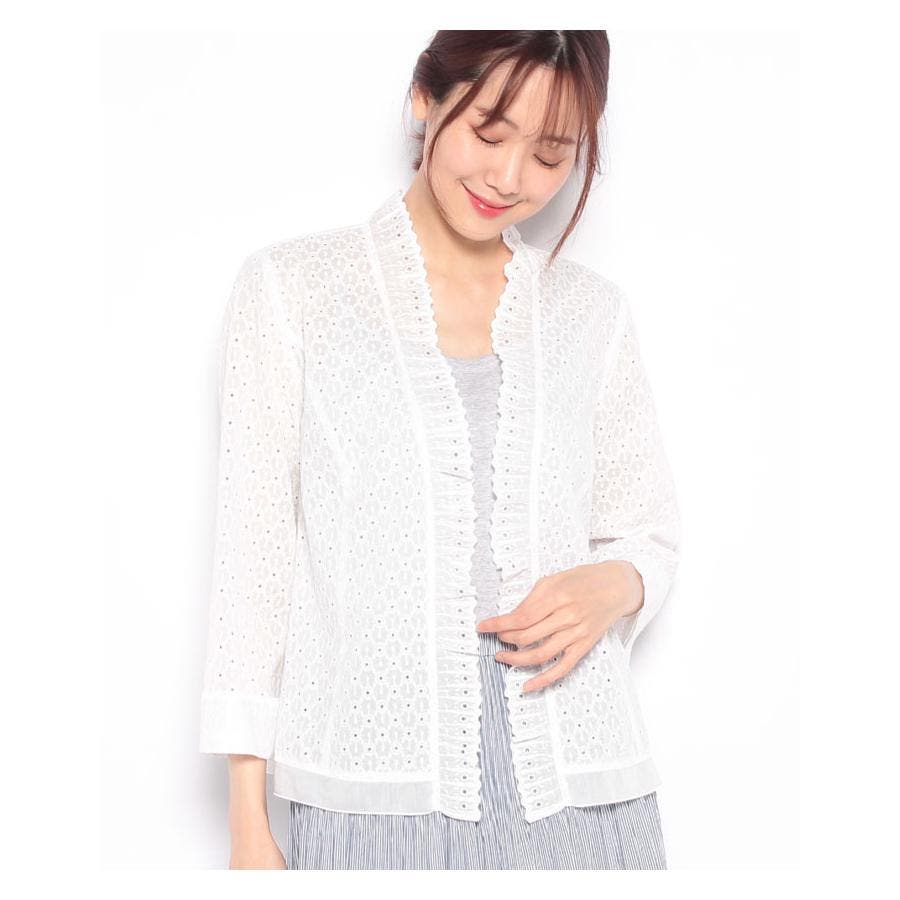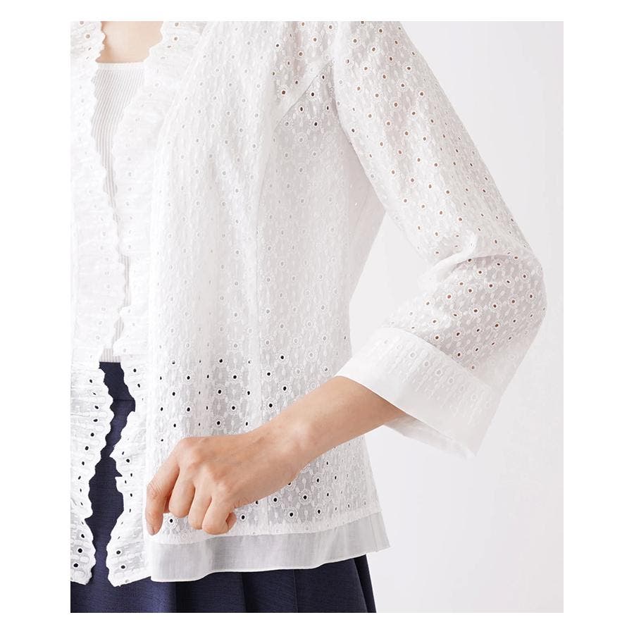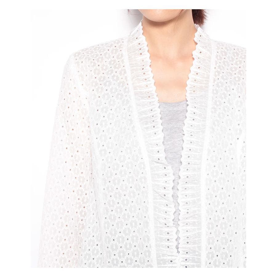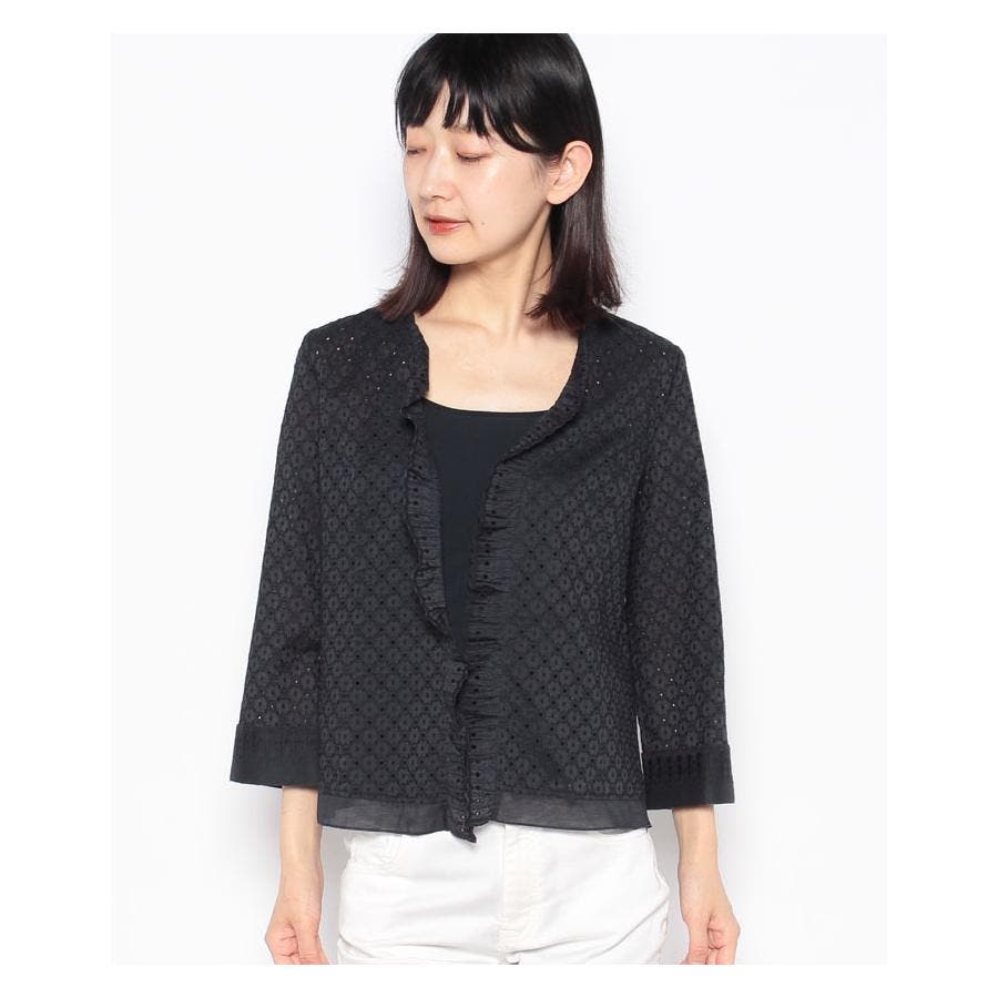 フラワーモチーフのレース素材を使用したノーボタンの7分袖ジャケット。フロント縁に施したフリルがほんのり甘いエッセンスに。通気性のよい爽やかな着心地が春夏シーズンにぴったり。コンパクトなシルエットでキャミソールやカットソーの上からさらりと着られる軽やかな風合いのアイテムです。