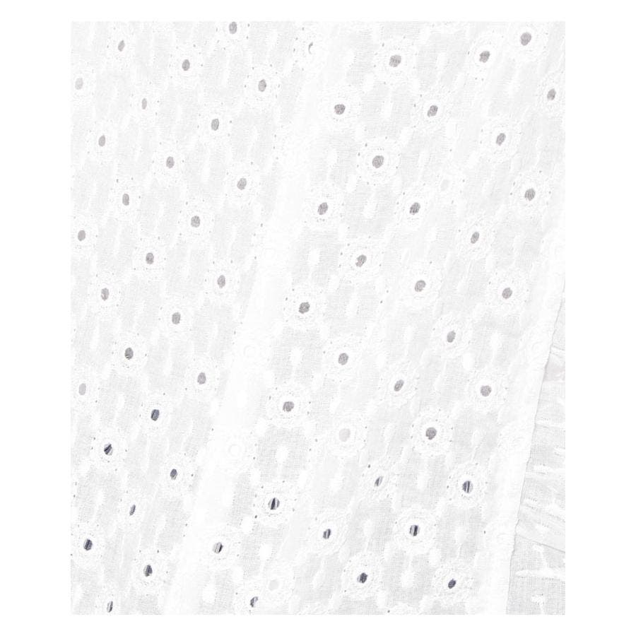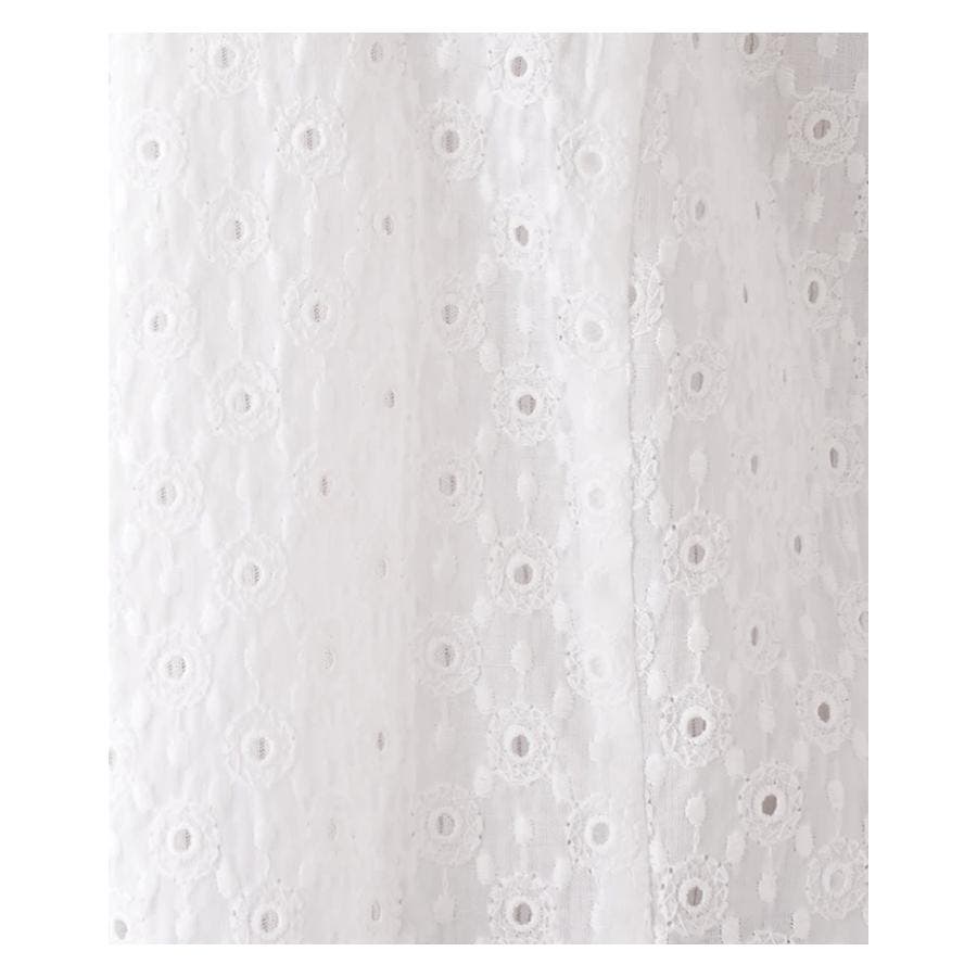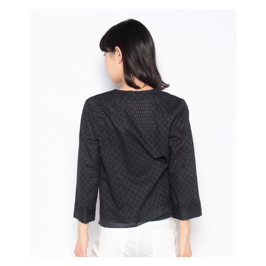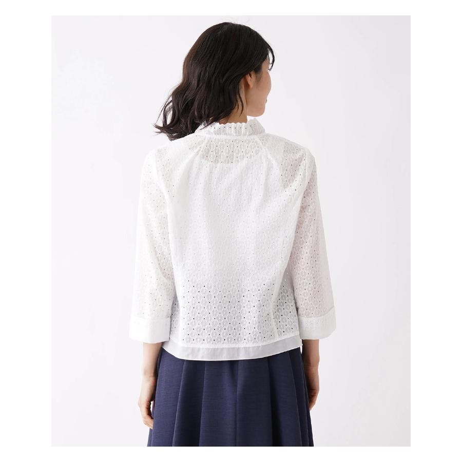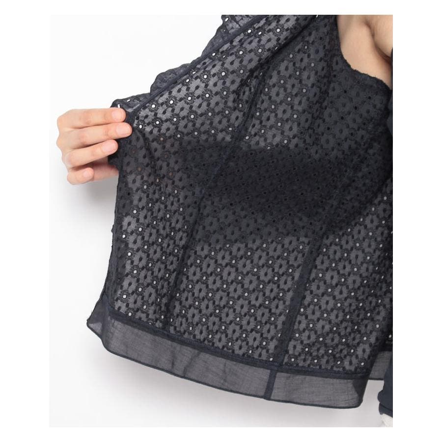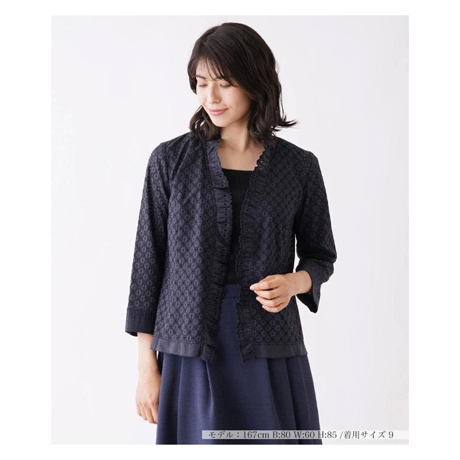 フラワーモチーフのレース素材を使用したノーボタンの7分袖ジャケット。フロント縁に施したフリルがほんのり甘いエッセンスに。通気性のよい爽やかな着心地が春夏シーズンにぴったり。コンパクトなシルエットでキャミソールやカットソーの上からさらりと着られる軽やかな風合いのアイテムです。
