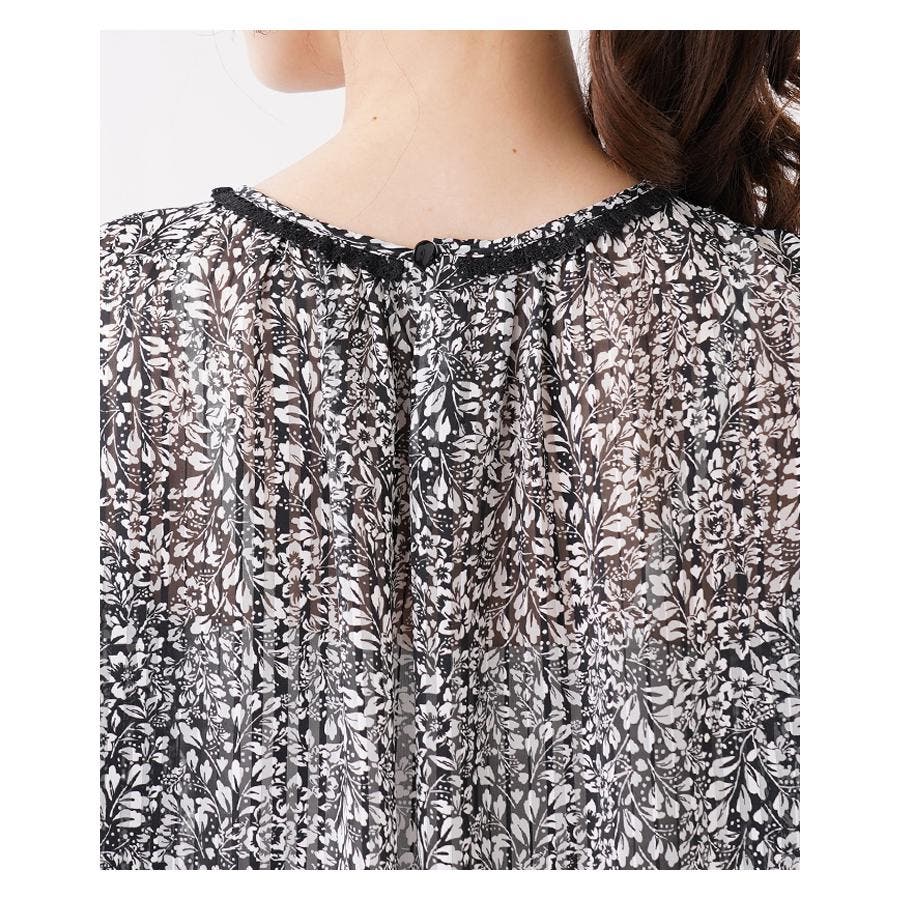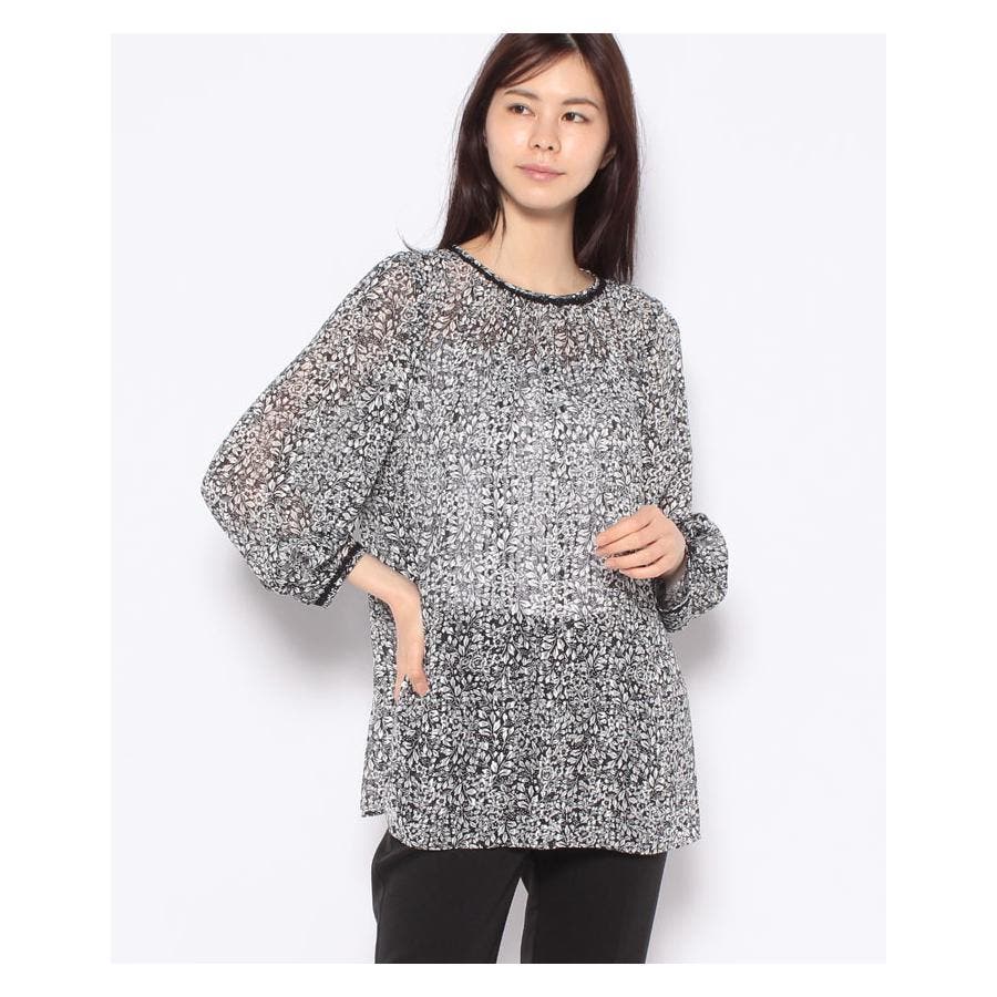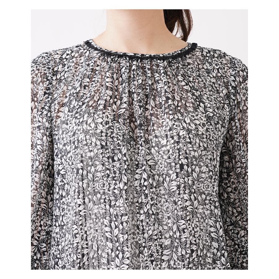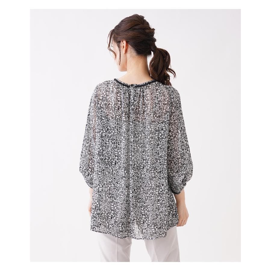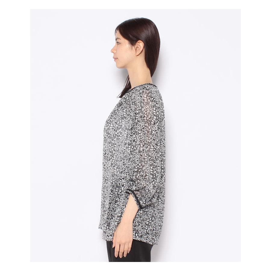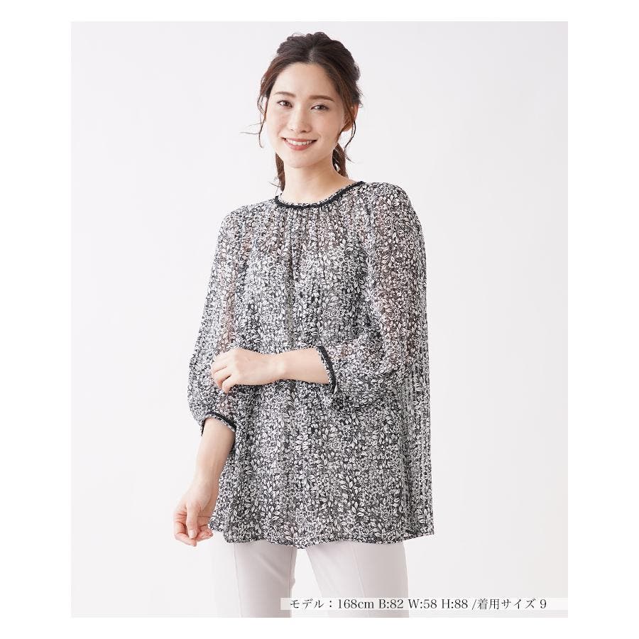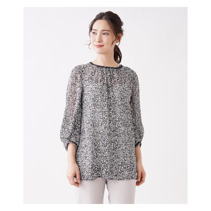 繊細に仕上げられたフラワープリントが広がるシフォンブラウス。ほんのりシアーな風合いがエレガントさのあるデザイン。ボリュームを持たせたスリーブやネックラインを飾るレーステープが上品さのあるアクセントに。