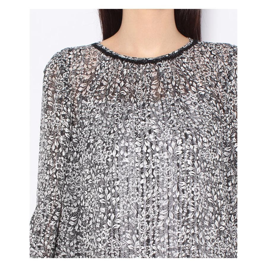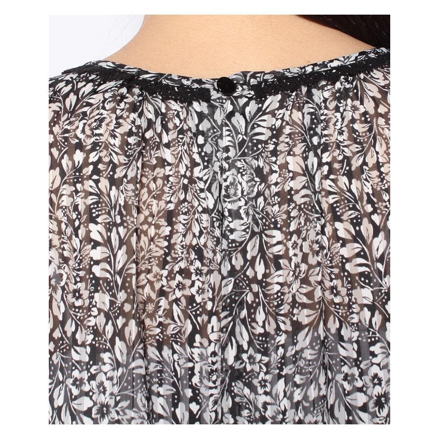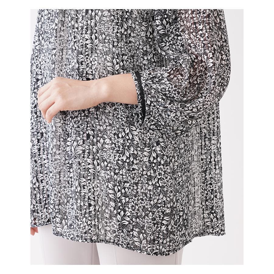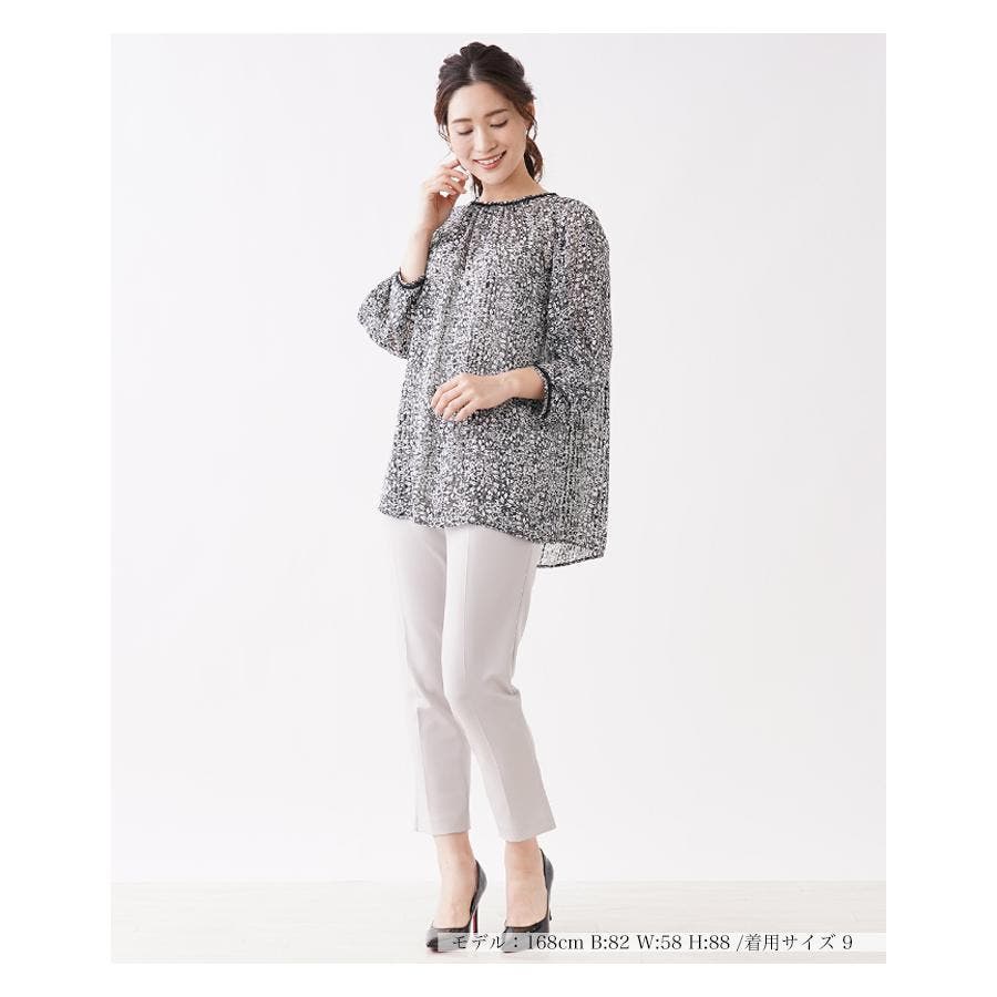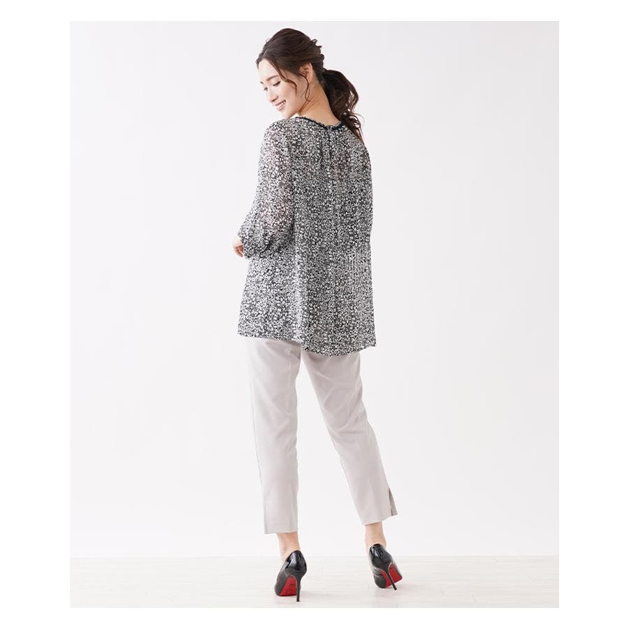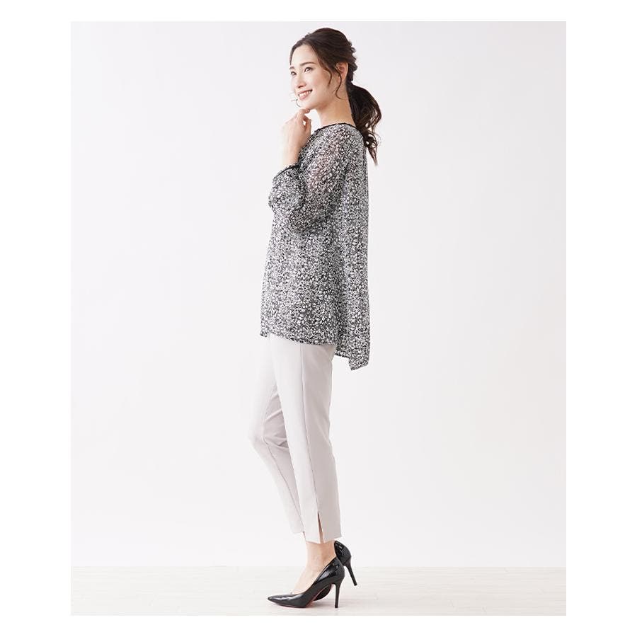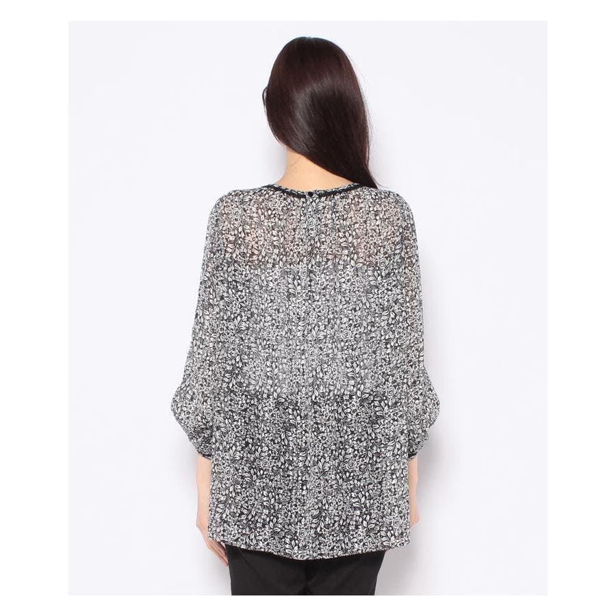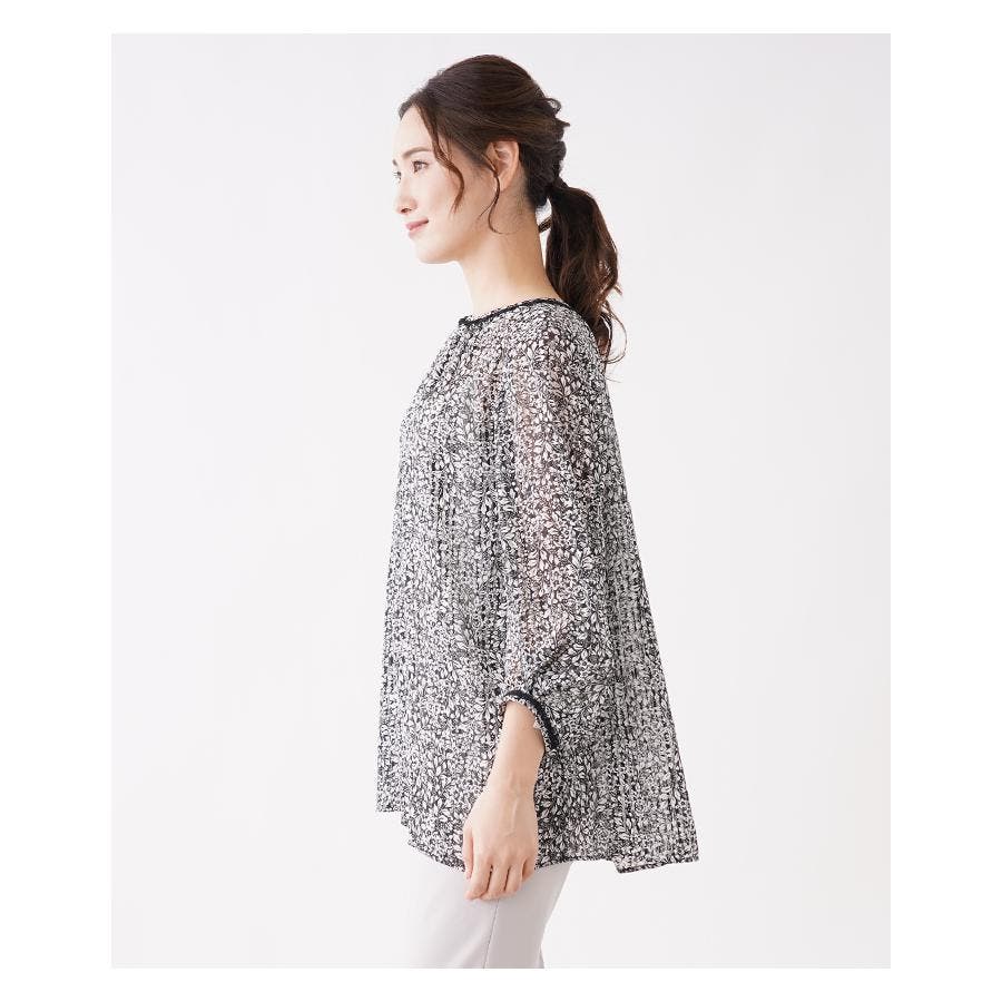 繊細に仕上げられたフラワープリントが広がるシフォンブラウス。ほんのりシアーな風合いがエレガントさのあるデザイン。ボリュームを持たせたスリーブやネックラインを飾るレーステープが上品さのあるアクセントに。