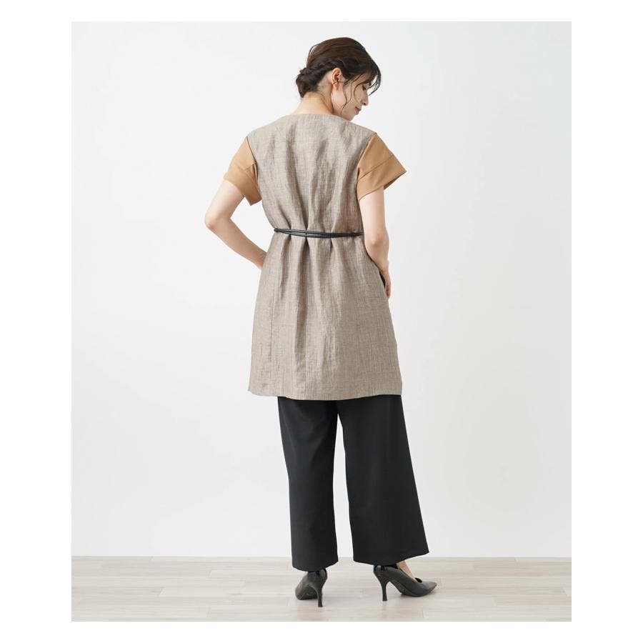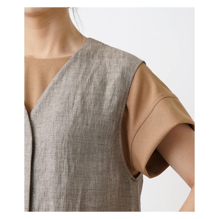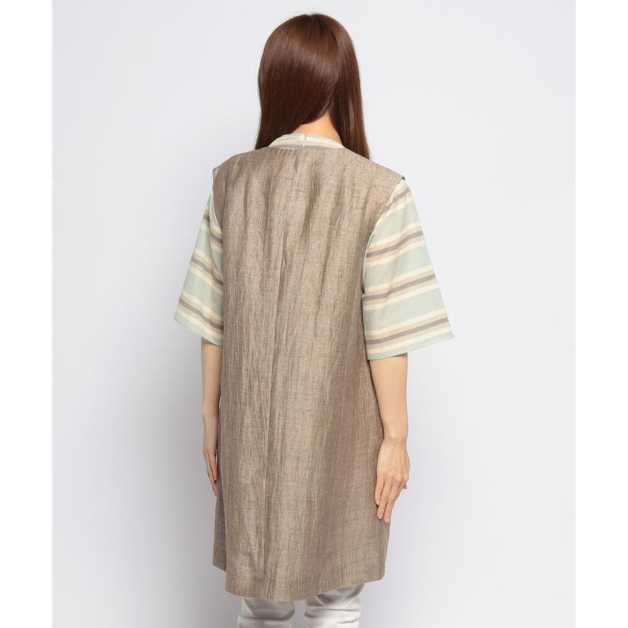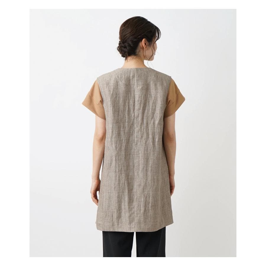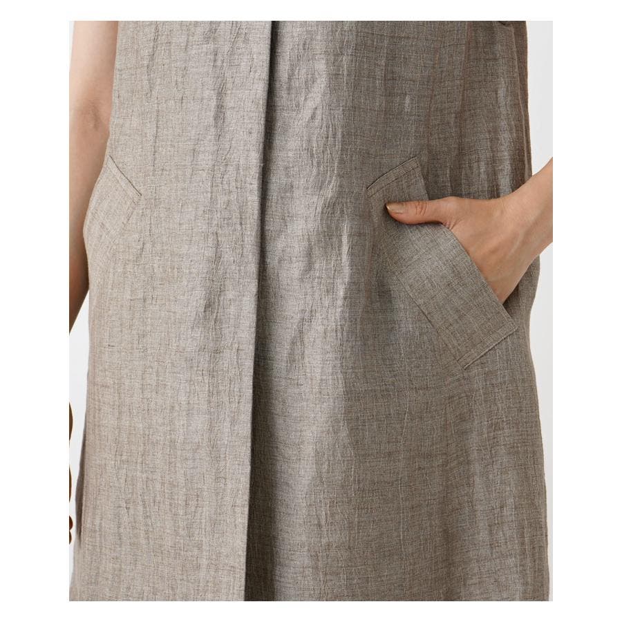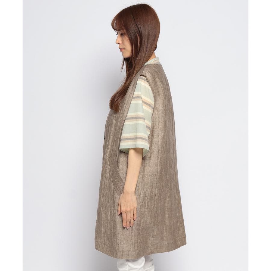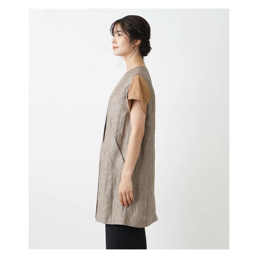 光沢感のある麻ベースの素材を使用したロングベスト。春夏シーズンならではの爽やかな着こなしが楽しめるアイテムです。裏地のないライトな着心地でありながら、コーディネートを程よくハンサムに引き締めてくれるので、お手持ちのカットソーやニットの上にさっと羽織るだけでも新鮮さを感じさせる洗練のレイヤードスタイルが完成します。フロントはスナップボタンによりスムーズに開閉が可能。