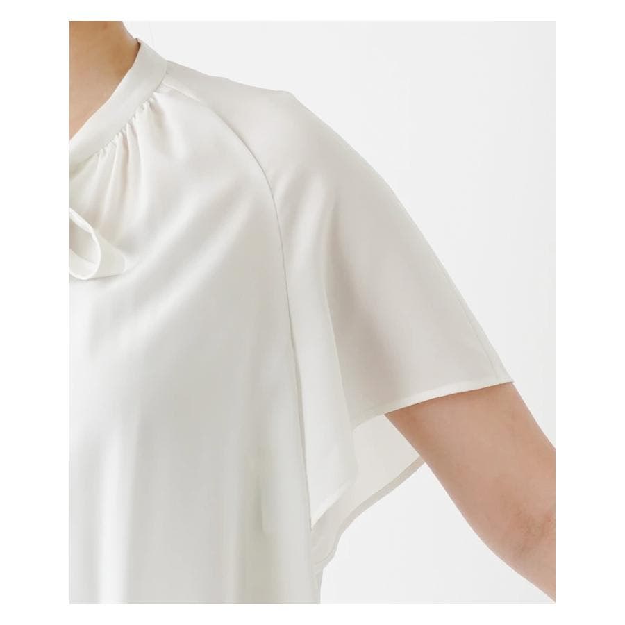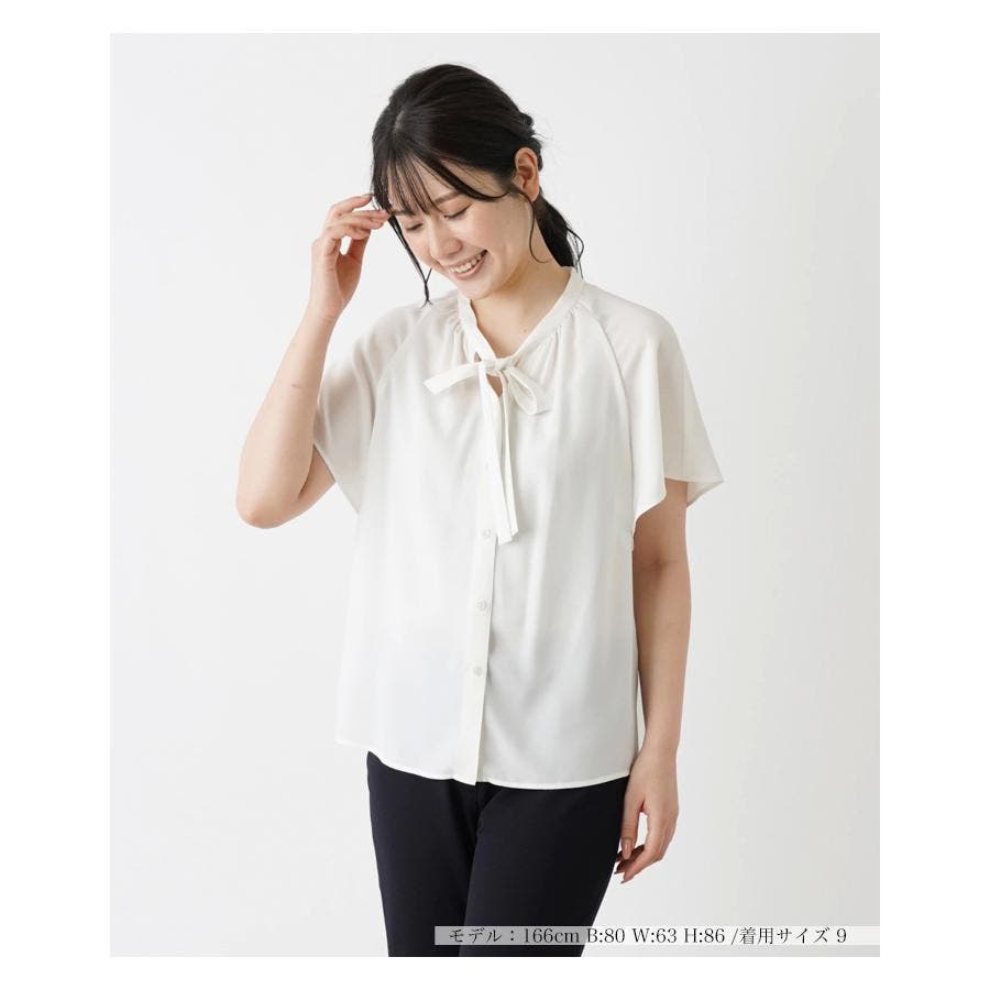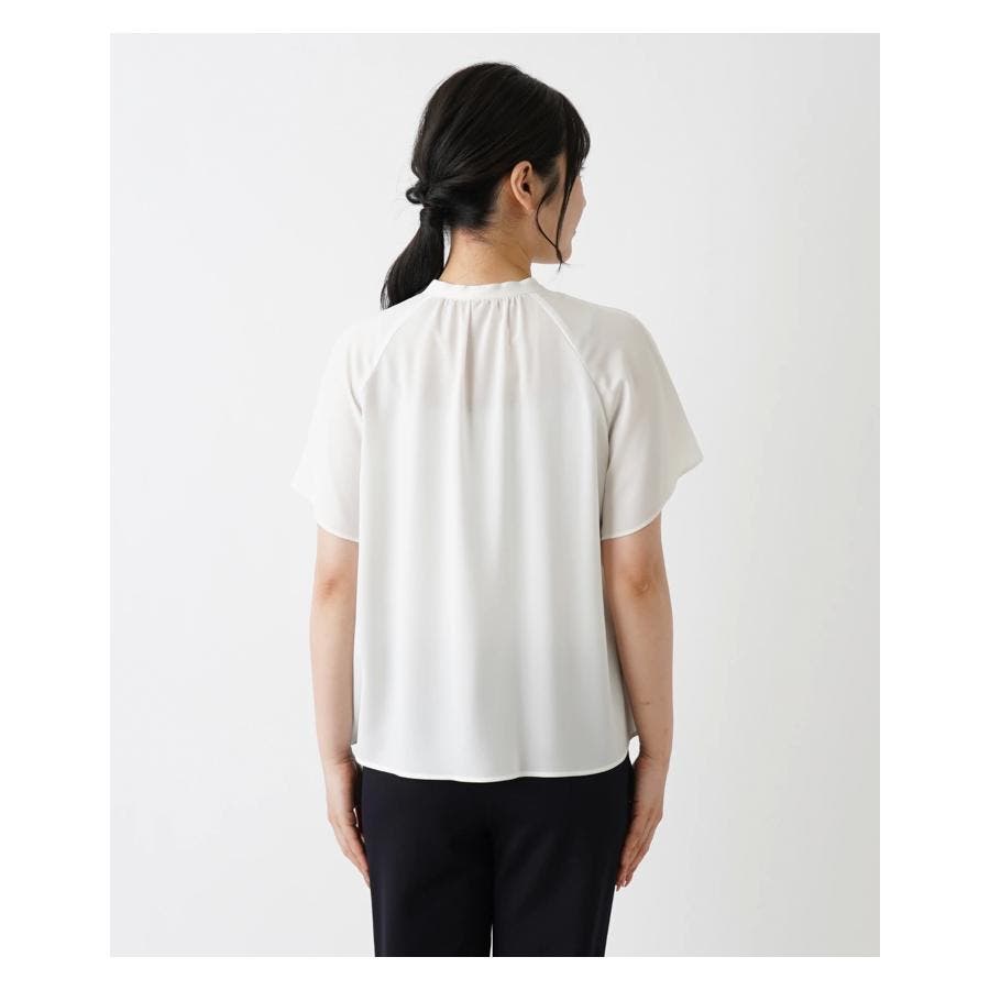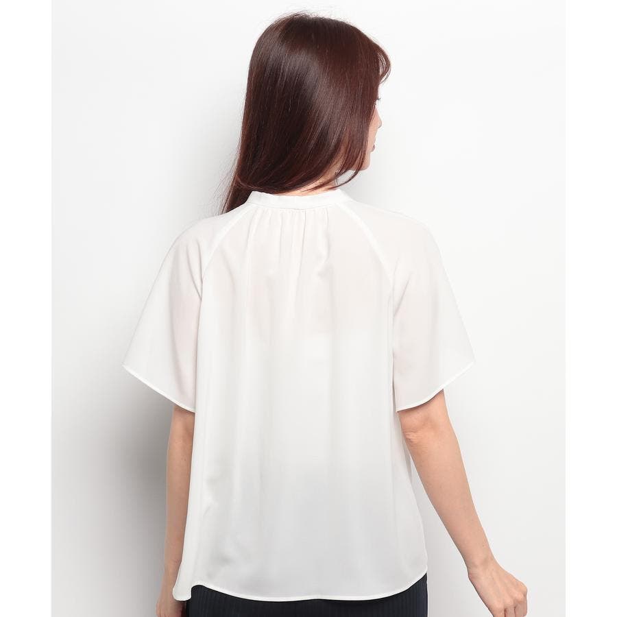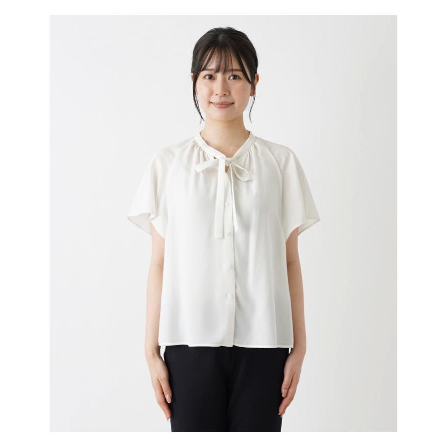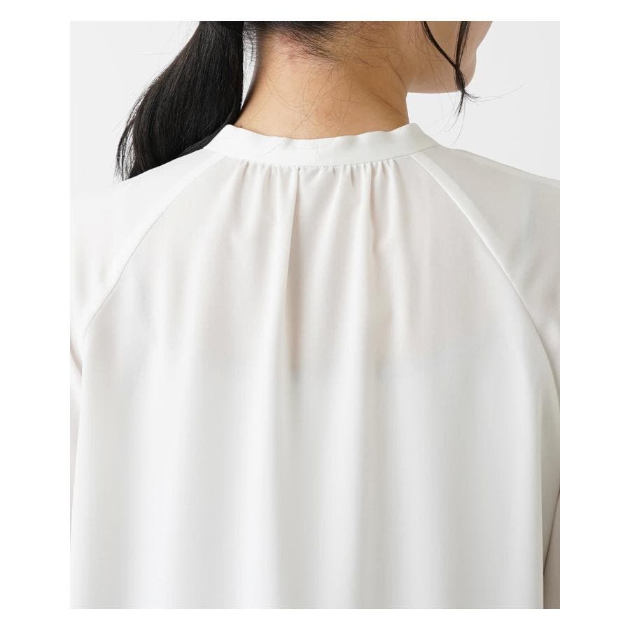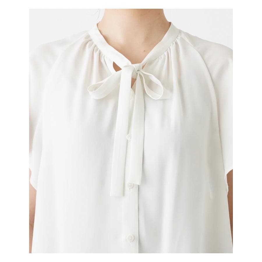 透け感のある薄手の素材で仕立てられた、バンドカラーブラウス。ナローなボウタイが上品な印象を与え、知的なムードを演出。シルエットには程よくゆとりをもたせ、ラグランスリーブで肩肘張らないリラクシーな着心地を叶えました。表面にはナチュラルなドレープ感があり、女性らしい優しげなニュアンスに仕上がります。デイリーからオフィスカジュアルまで、これからの季節の多彩なシーンで幅広く活躍してくれそうなトップスです。