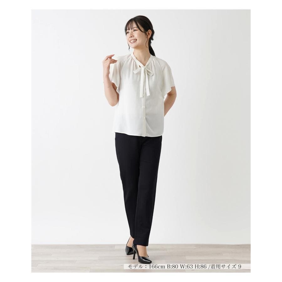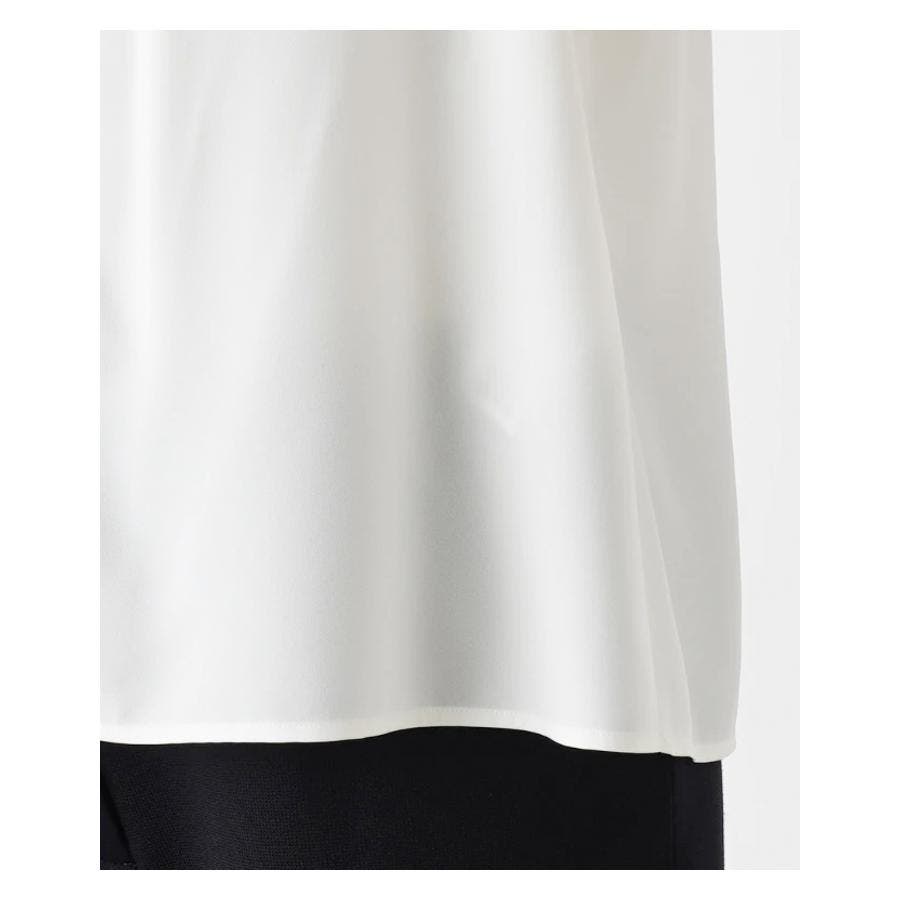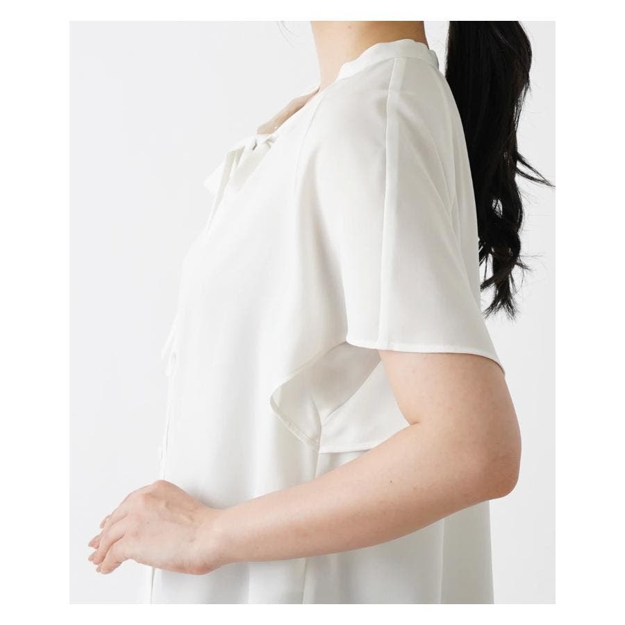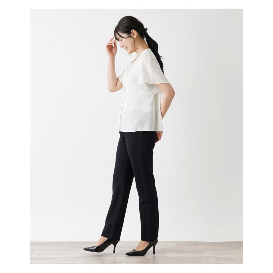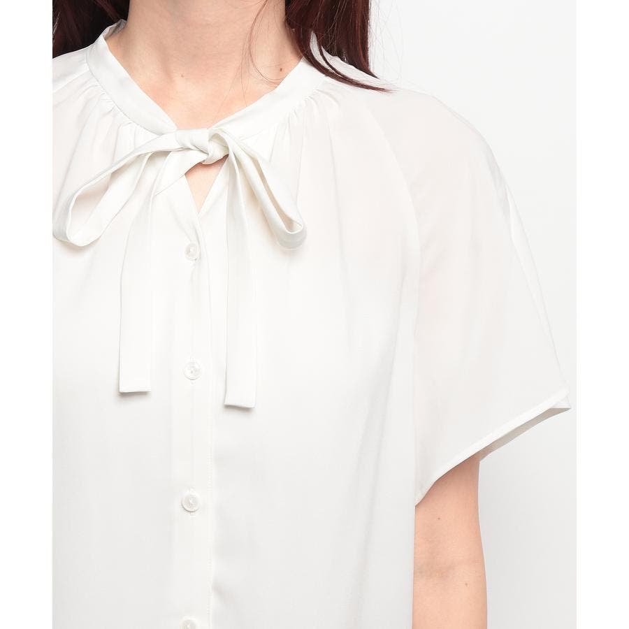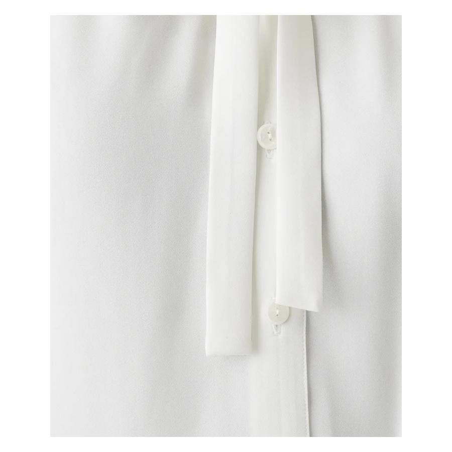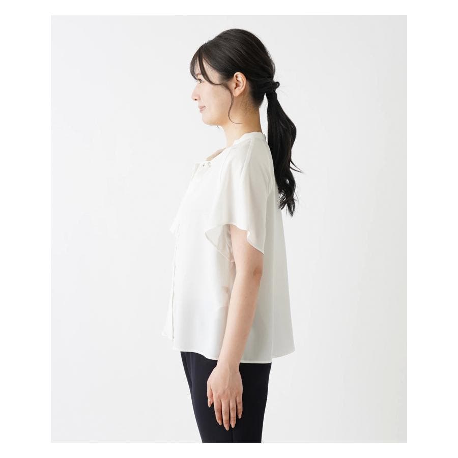 透け感のある薄手の素材で仕立てられた、バンドカラーブラウス。ナローなボウタイが上品な印象を与え、知的なムードを演出。シルエットには程よくゆとりをもたせ、ラグランスリーブで肩肘張らないリラクシーな着心地を叶えました。表面にはナチュラルなドレープ感があり、女性らしい優しげなニュアンスに仕上がります。デイリーからオフィスカジュアルまで、これからの季節の多彩なシーンで幅広く活躍してくれそうなトップスです。