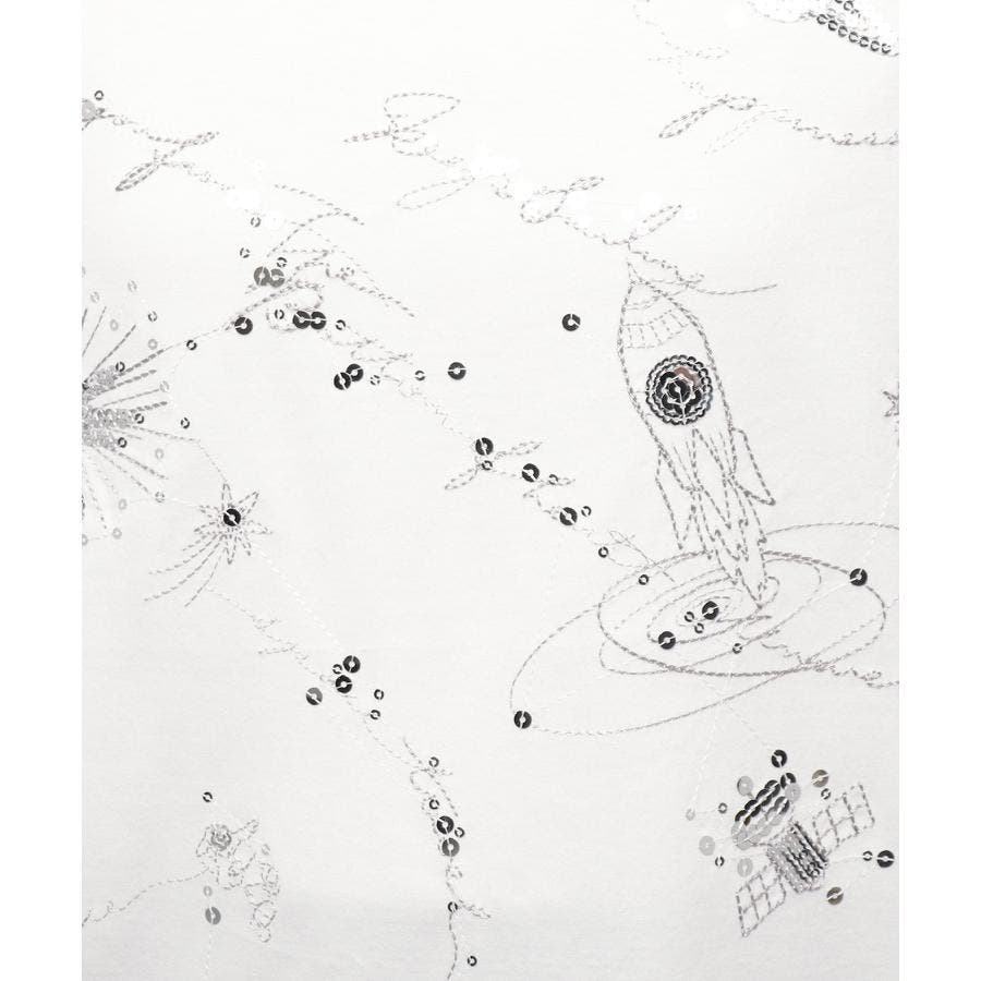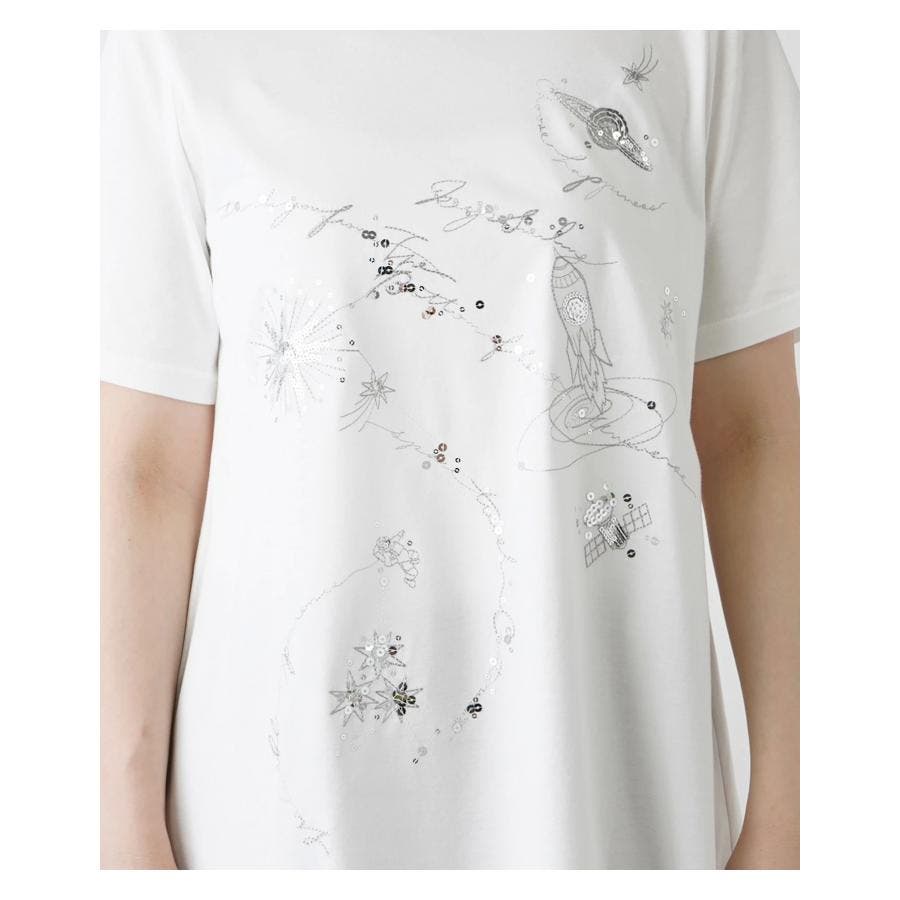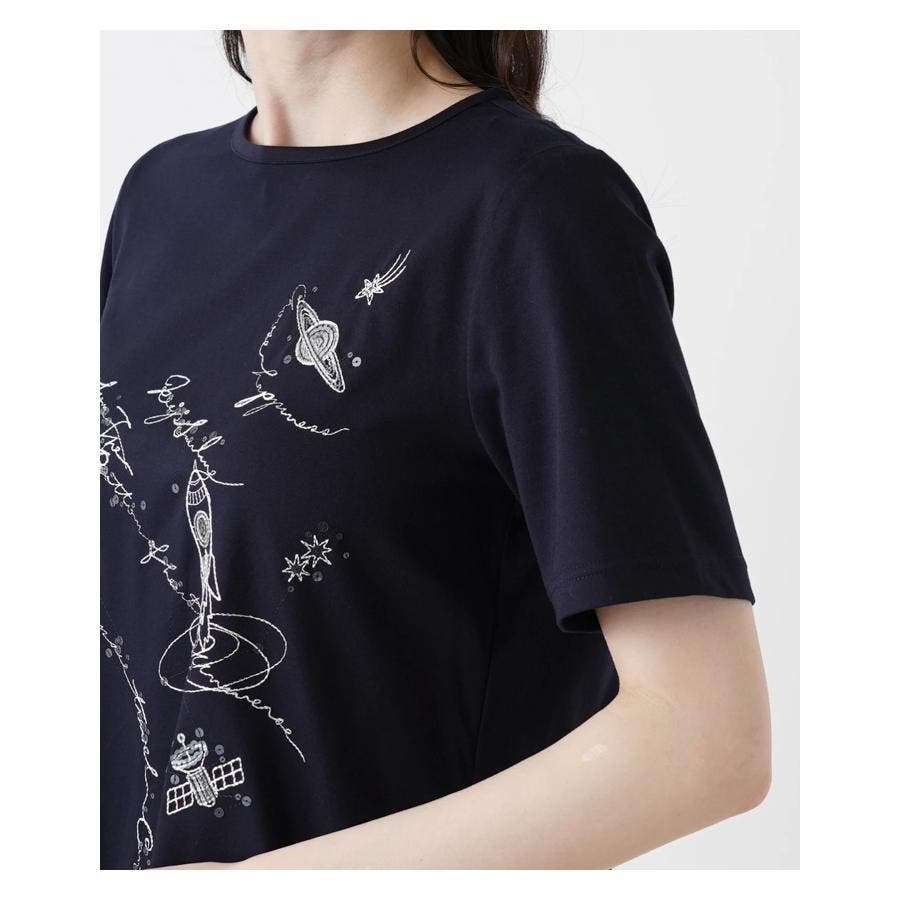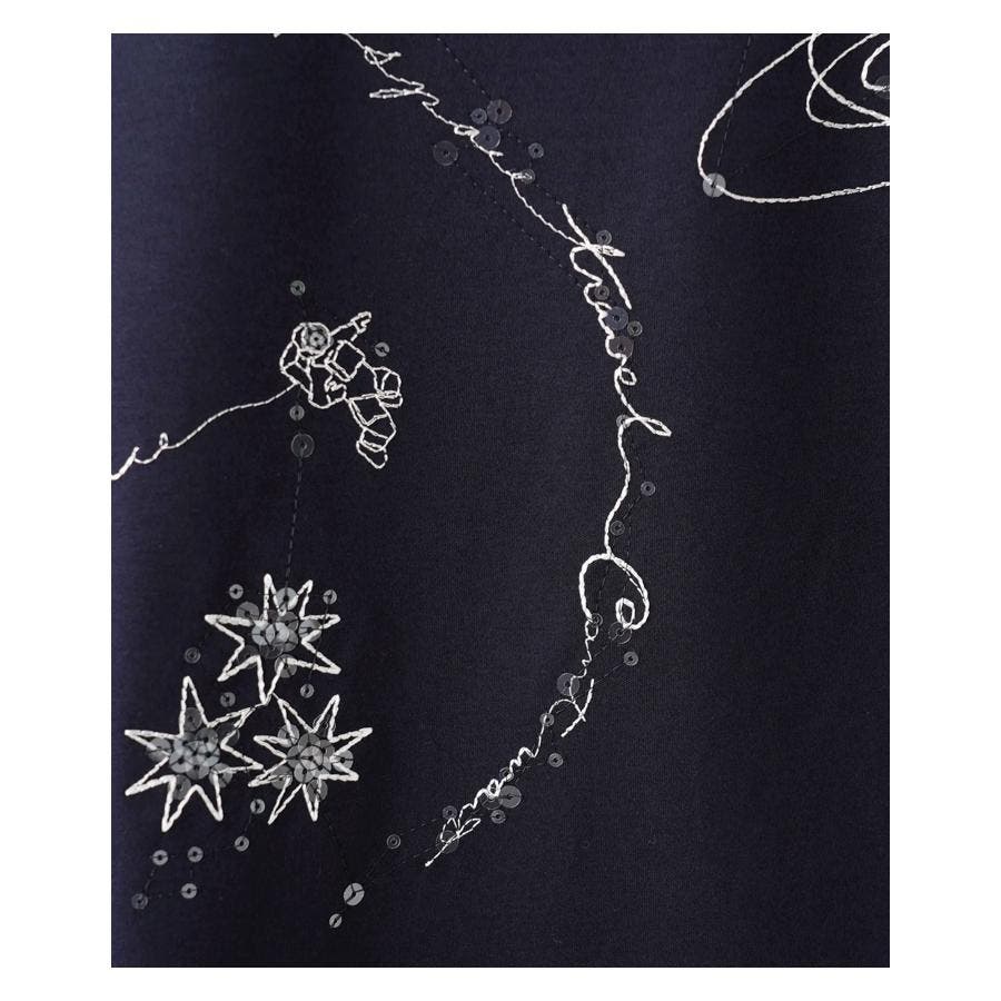 スパンコールが煌めく、スペース柄の刺繍デザインがインパクトたっぷりのカットソー。手描き風のテイストが温かみと遊び心を演出し、コーディネートに差をつけてくれるアイテム。一枚での着こなしはもちろん、インナーとしてもユニークな柄がポイントになるのでおすすめです。肌当たりのよいやや薄手のコットン生地を使い、程よいリラックス感のあるシルエットで仕上げており、ヒップまで自然と隠れる程度の丈感なので体型カバーもバッチリ。