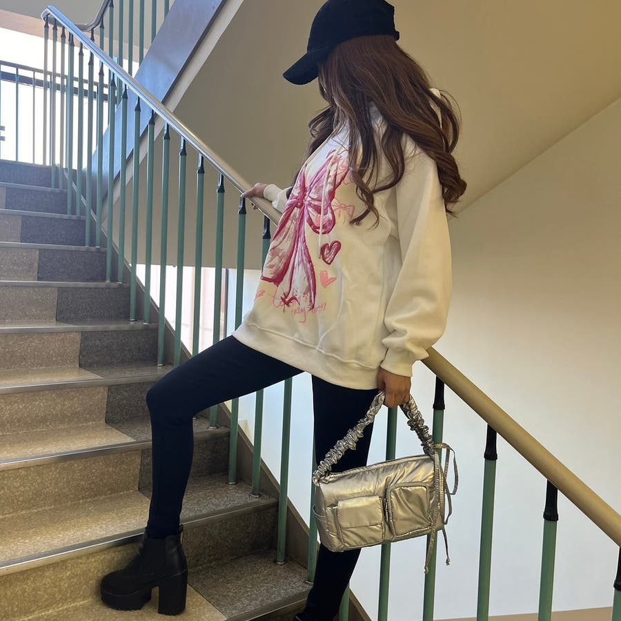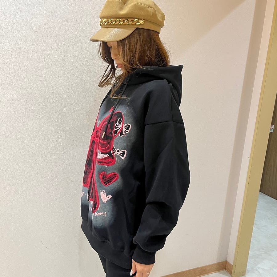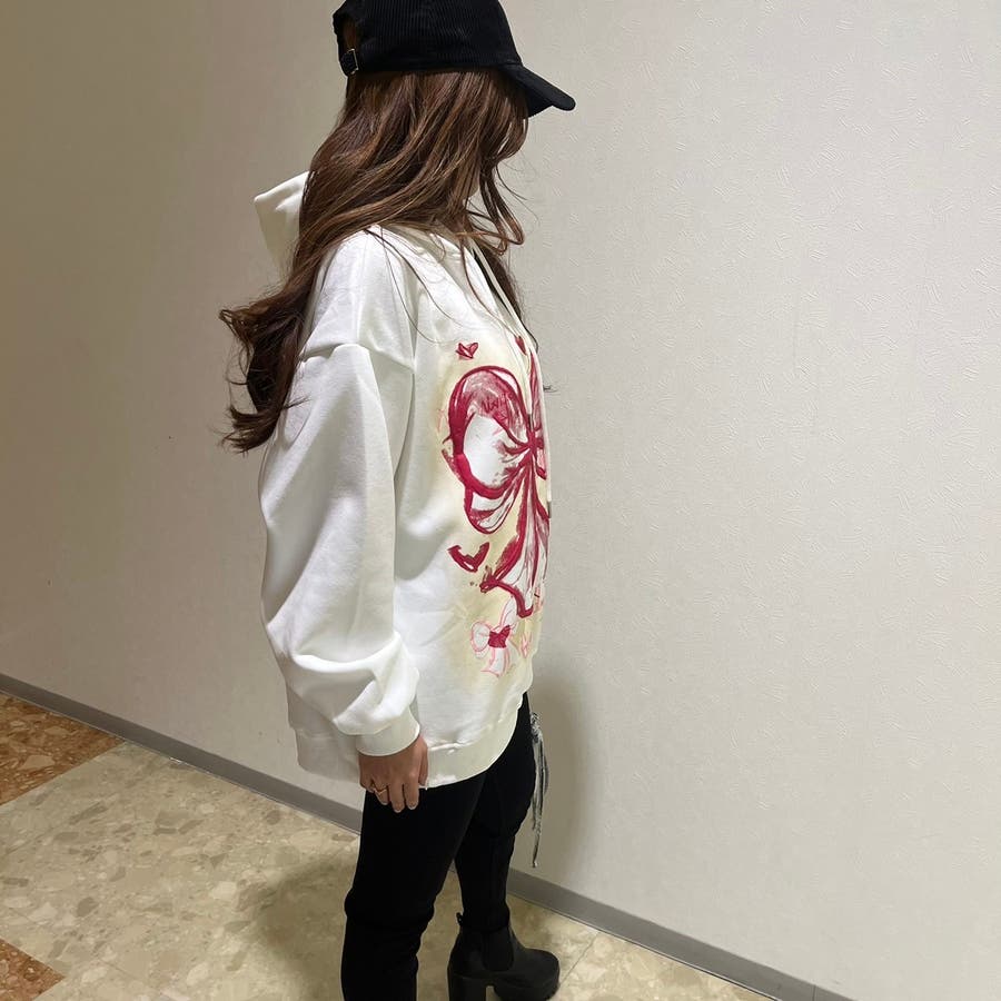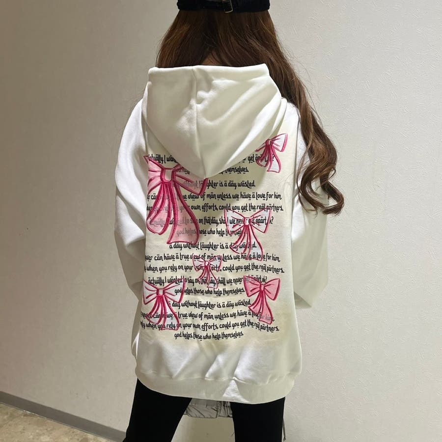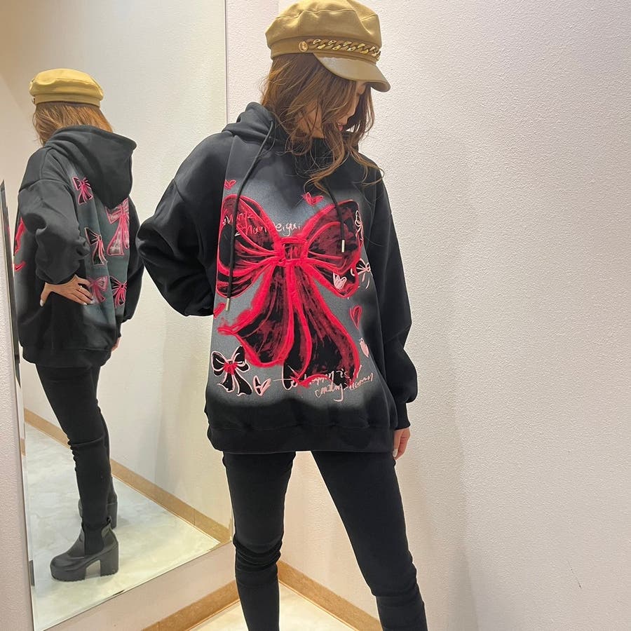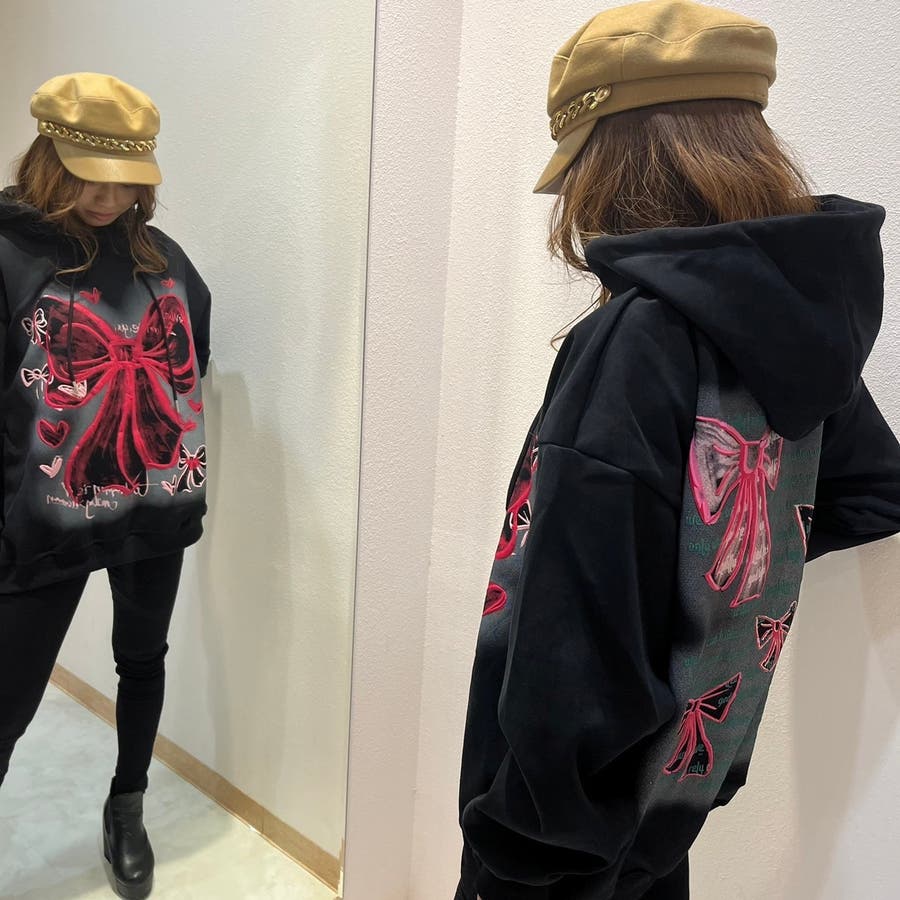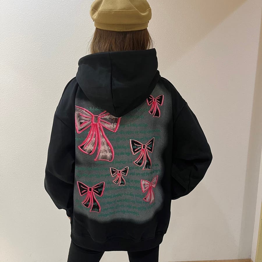 リボンプリントワンウォッシュパーカー/すみくろ/ビックシルエット