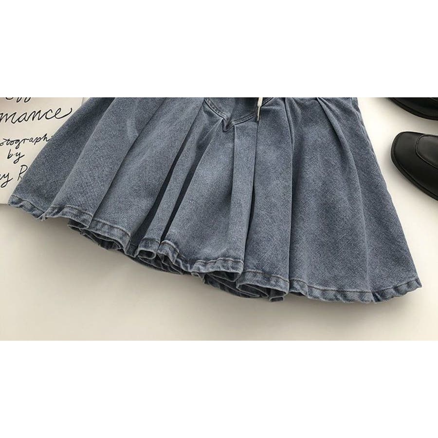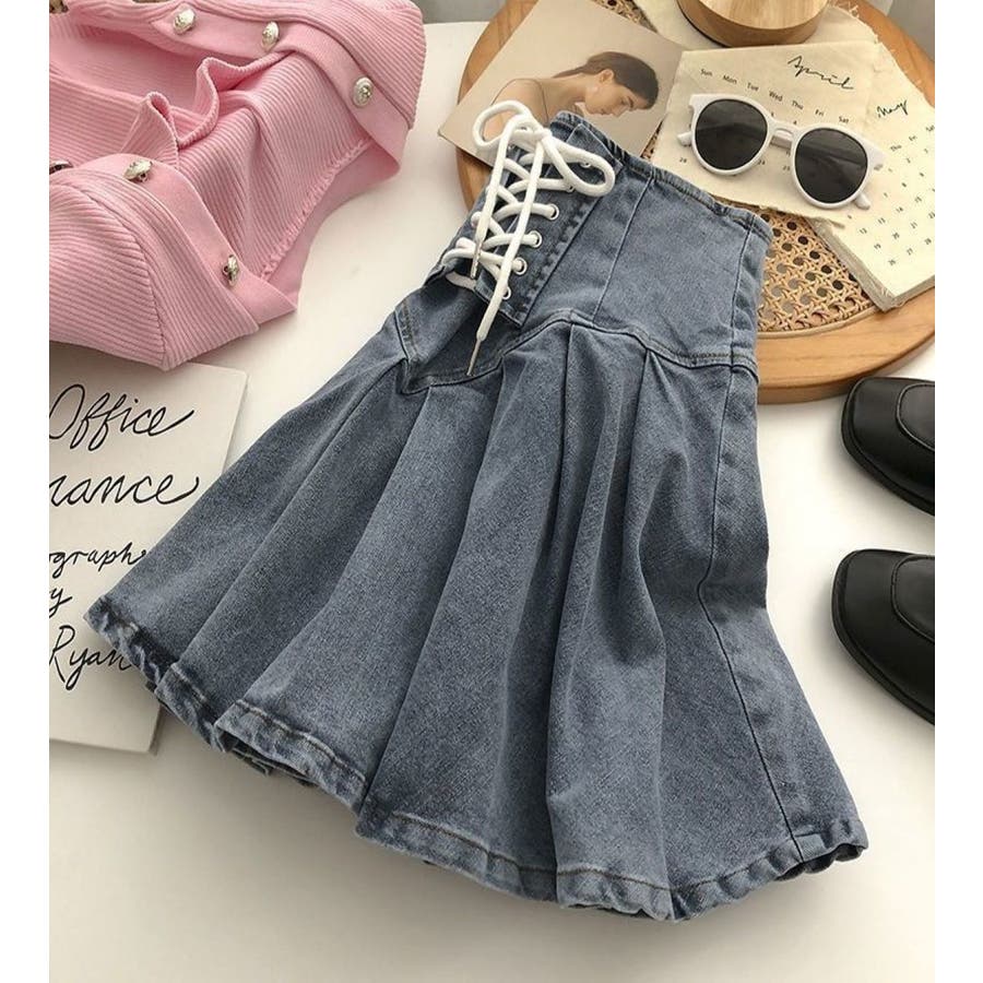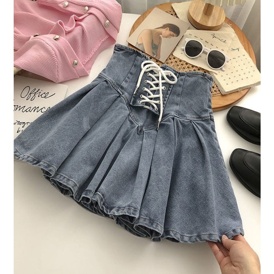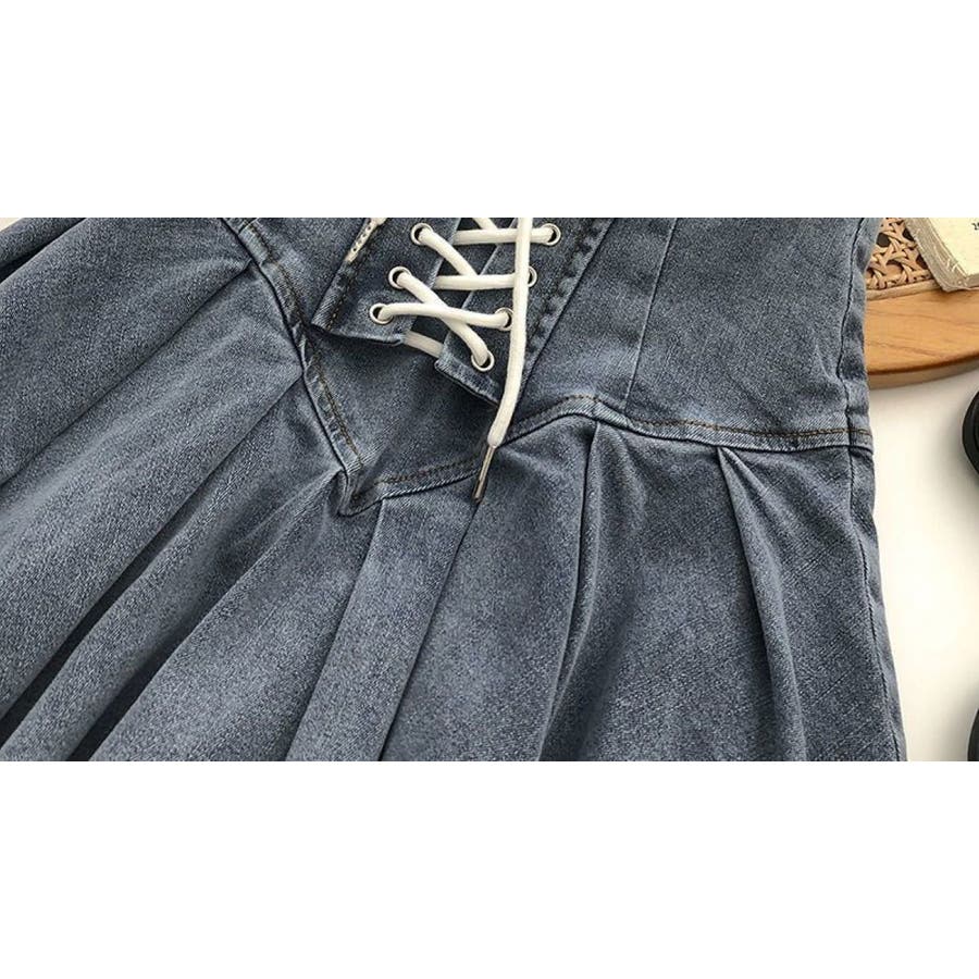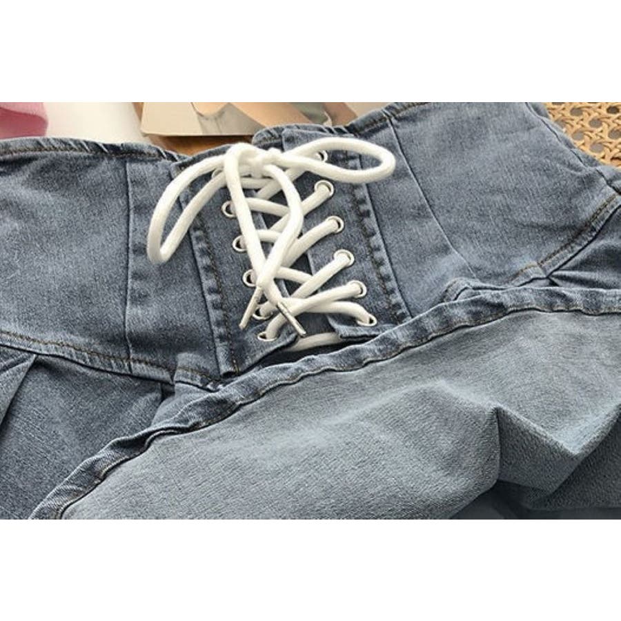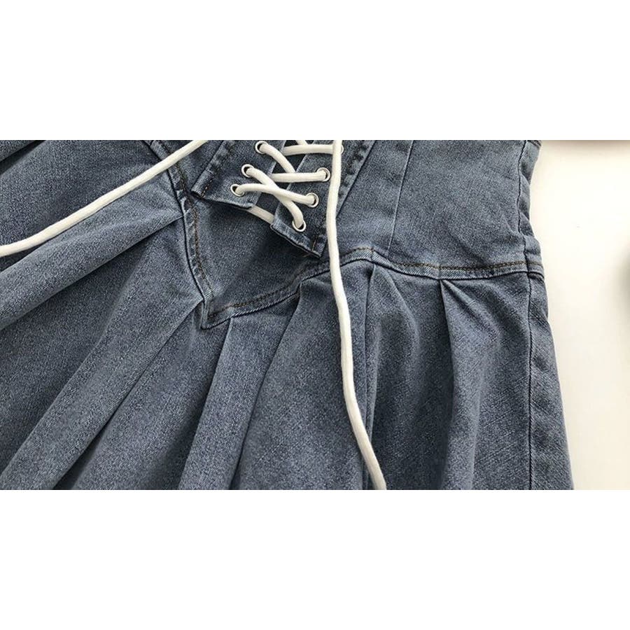 レースアップデニムミニスカート/ボックスプリーツ/ハイウエスト