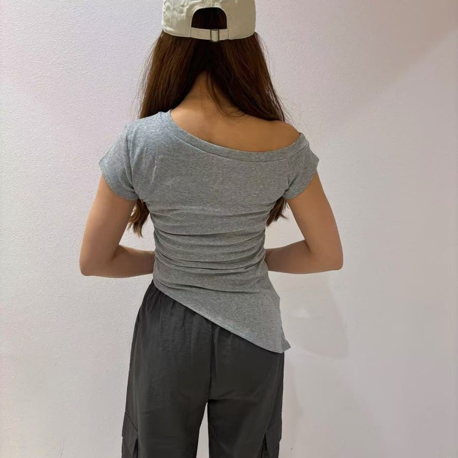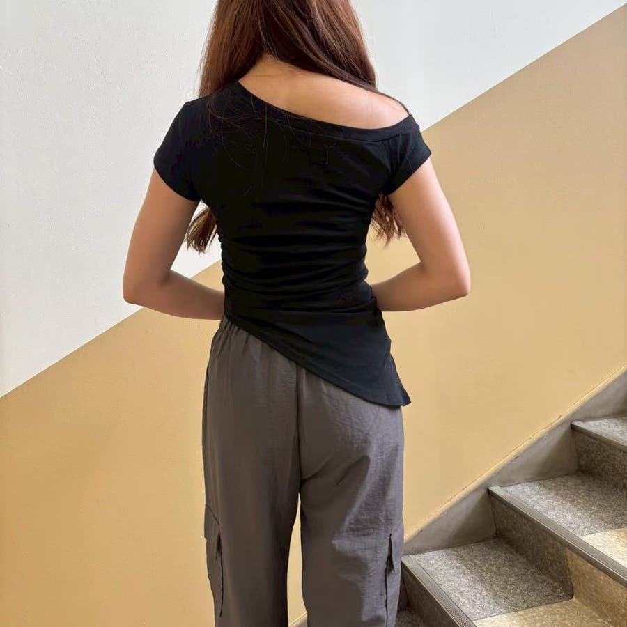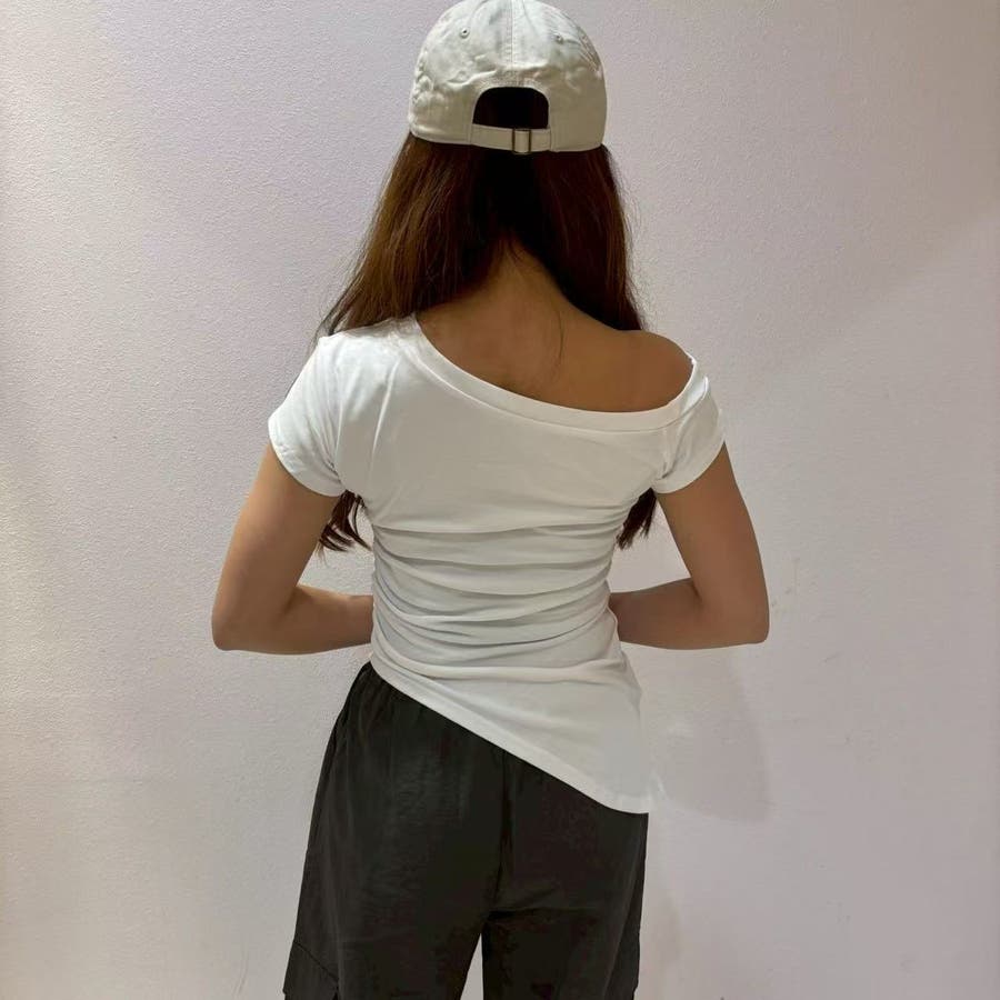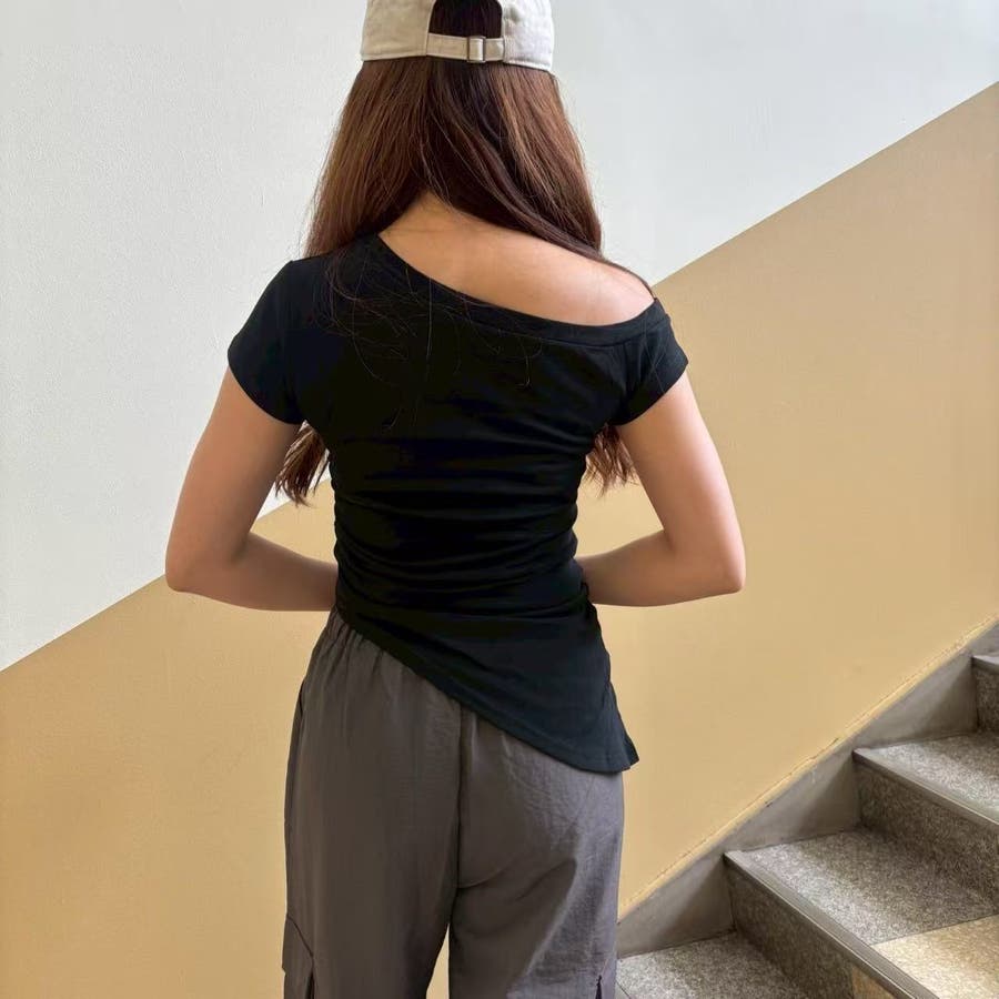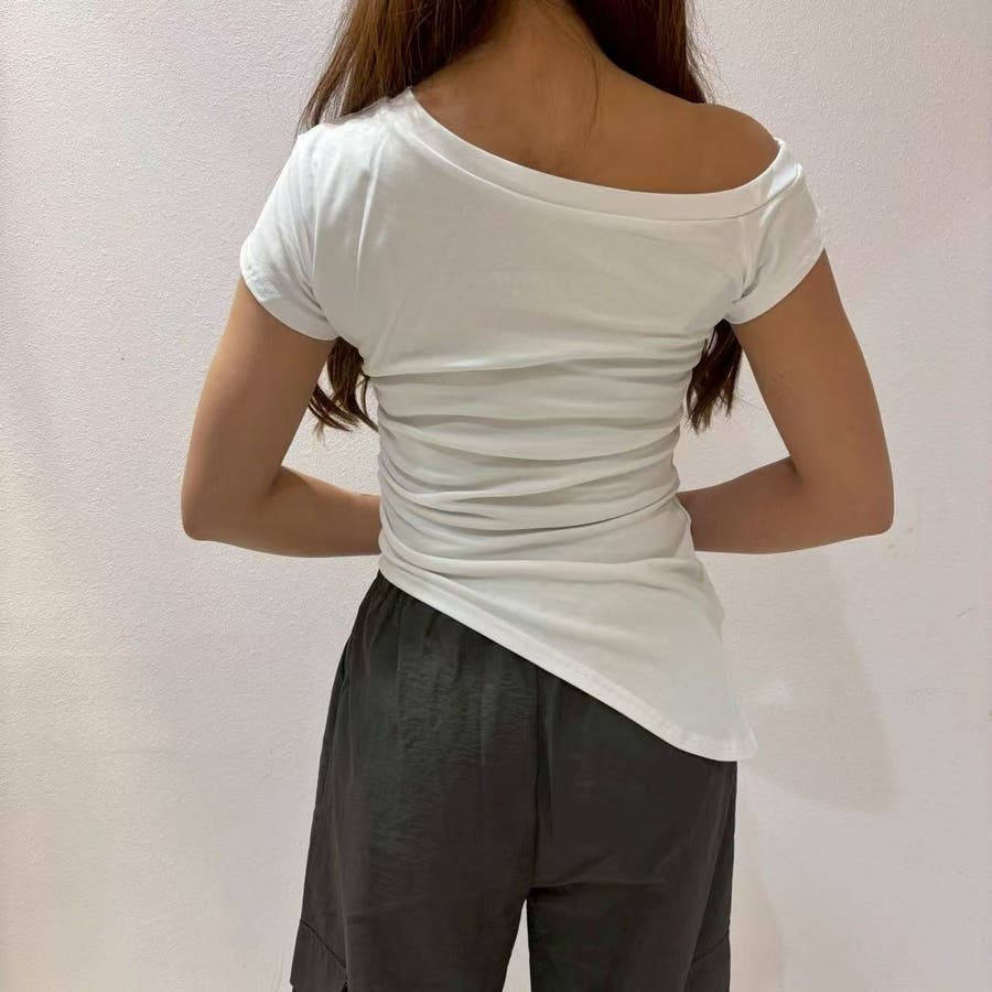 レディース/トップス/プルオーバー/カットソー/半袖/Tシャツ/アシンメトリ/シャーリング/ロゴ/カジュアル /大人かわいい/大人っぽい/ヘビロテ/トレンド/韓国ファッション/リラックス/着痩せ/コスパ/おしゃれ/きれいめ/お出かけ/デート/普段着/普段使い/かわいい/着回し/高見え/トレンドコーデ/休日コーデ/学生/社会人/オフィスカジュアル/インスタグラム/インスタ映え/夏/夏服/JO254335