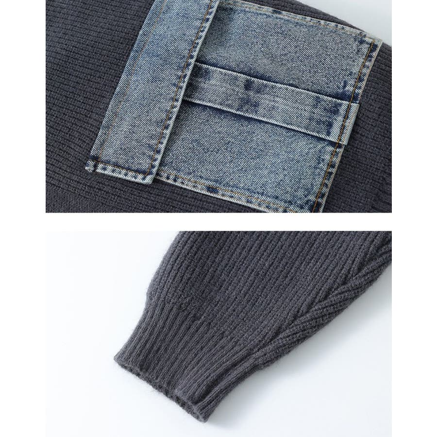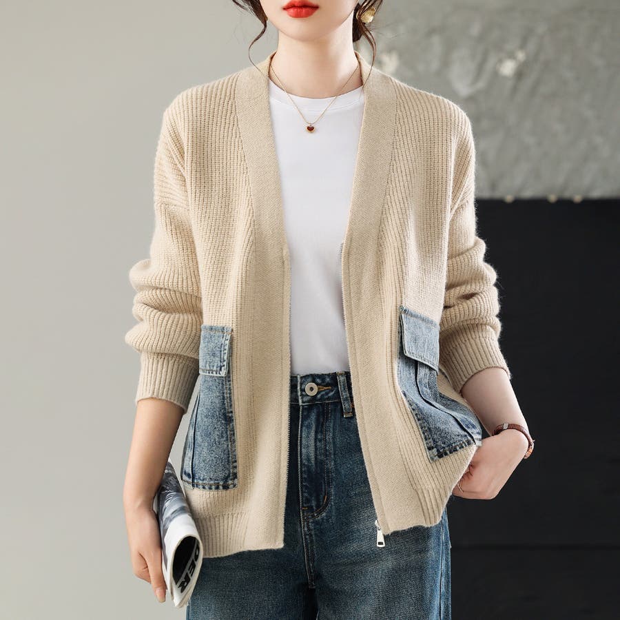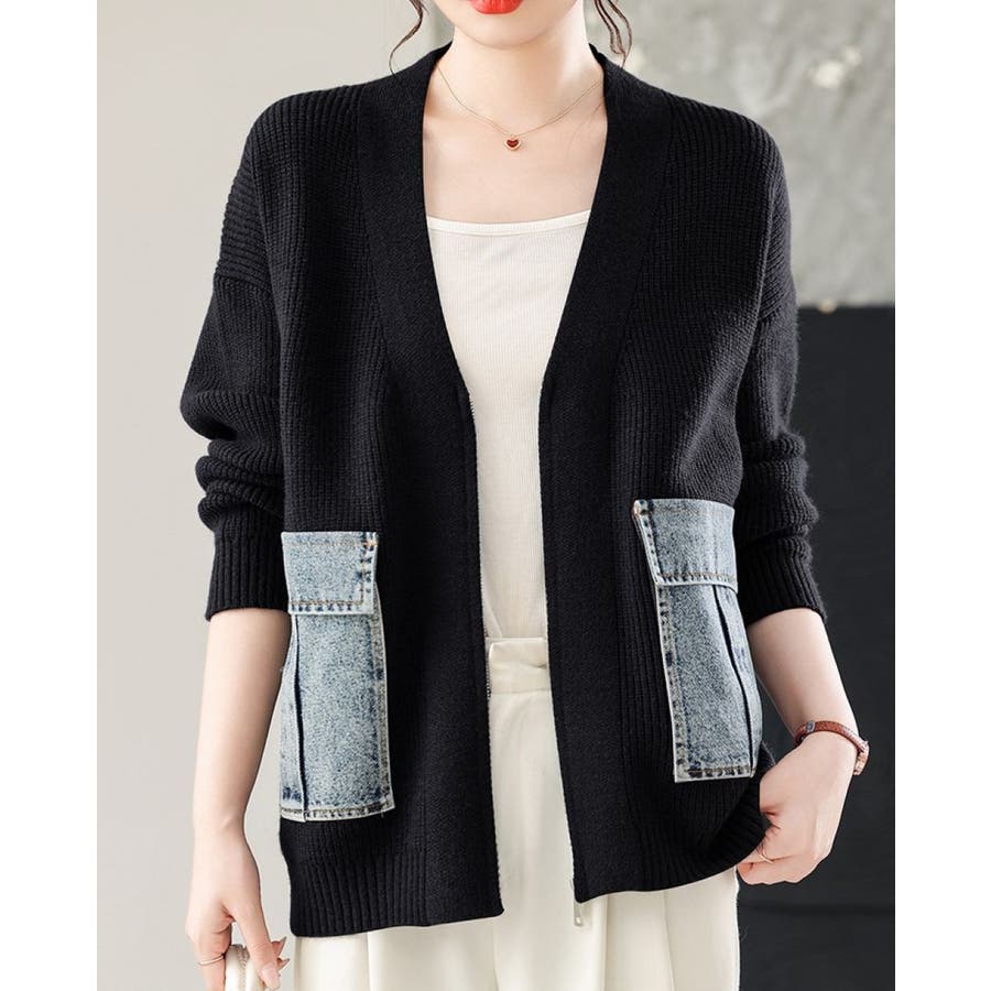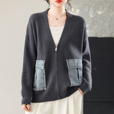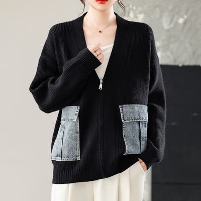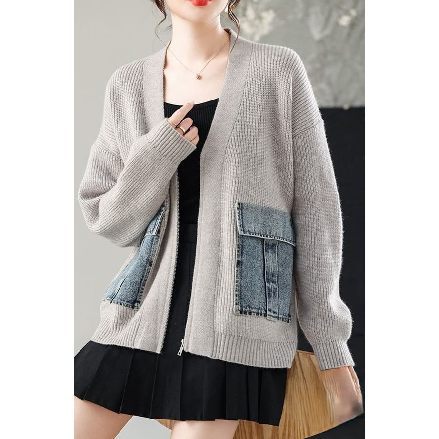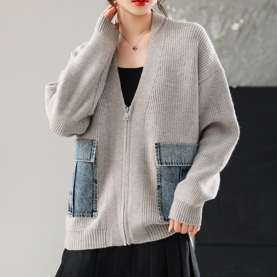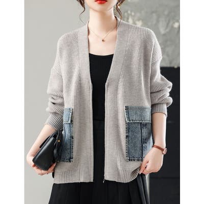 ニットカーディガン/デニムポケット付/ジップアップカーデ